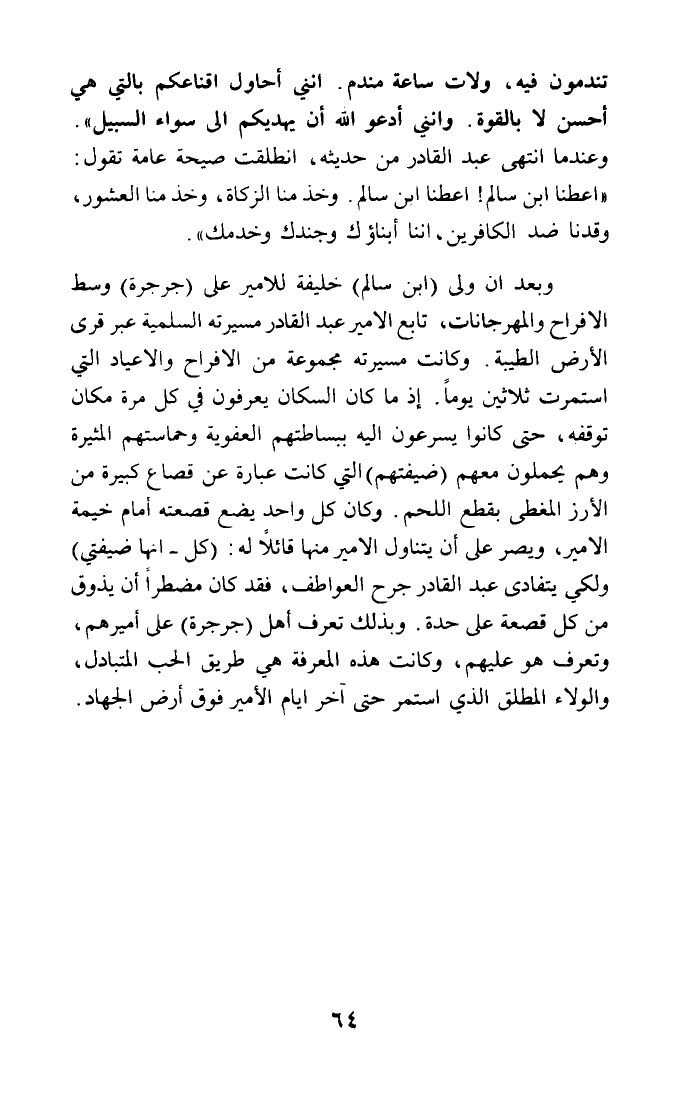 تندمون فيه، ولات ساعة مندم. إنني أحاول إقناعكم بالتي هي أحسن لا بالقوة. وإنني أدعو الله أن يهديكم إلى سواء السبيل). وعندما انتهى عبد القادر من حديثه، إنطلقت صيحة عامة تقول: (اعطنا ابن سالم! اعطنا ابن سالم. وخذ منا الزكاة، وخذ منا العشور، وقدنا ضد الكافرين, إننا أبناؤك وجندك وخدمك).