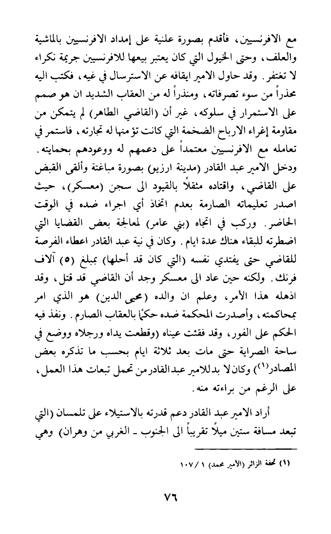 مع الإفرنسيين، فأقدم بصورة علنية على إمداد الإفرنسيين بالماشية والعلف، وحتى الخيول التي كان يعتبر بيعها للإفرنسيين جريمة نكراء لا تغتفر. وقد حاول الأمير إيقافه عن الاسترسال في غيه، فكتب إليه محذرا من سوء تصرفاته، ومنذرا له من العقاب الشديد إن هو صمم على الاستمرار في سلوكه، غير أن (القاضي الطاهر) لم يتمكن من مقاومة إغراء الأرباح الضخمه التي كانت تؤمنها له تجارته، فاستمر في تعامله مع الإفرنسيين معتمدا على دعمهم له ووعودهم بحمايته. ودخل الأمير عبد القادر (مدينة أرزيو بصورة مباغتة وألقى القبض على القاضي، واقتاده مثقلا بالقيود إلى سجن (معسكر)، حيث أصدر تعليماته الصارمة بعدم اتخاذ أي إجراء ضده في الوقت الحاضر. وركب في اتجاه (بني عامر) لمعالجة بعض القضايا التي اضطرته للبقاء هناك عدة أيام. وكان في نية عبد القادر إعطاء الفرصة للقاضي حتى يفتدي نفسه (التي كان قد أحلها) بمبلغ (5) آلاف فرنك. ولكنه حين عاد إلى معسكر وجد أن القاضي قد قتل، وقد أذهله هذا الأمر، وعلم أن والده (محيي الدين) هو الذي أمر بمحاكمته، وأصدرت المحكمة ضده حكما بالعقاب الصارم. ونفذ فيه الحكم على الفور، وقد فقئت عيناه (وقطعت يداه ورجلاه ووضع في ساحة الصراية حتى مات بعد ثلاثة أيام بحسب ما تذكره بعض المصادر (¬1) وكان لا بد للأمير عبد القادر من تحمل تبعات هذا العمل، على الرغم من براءته منه.