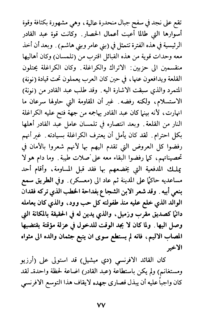 تقع على نجد في سفح جبال منحدرة عالية، وهي مشهورة بكثافة وقوة أسوارها التي طالما أعيت أعمال الحصار. وكانت قوة عبد القادر الرئيسية في هذه الفترة تتمثل في (بني عامر وبني هاشم). وبعد أن أخذ معه وحدات قوية من هذه القبائل اقترب من (تلمسان) وكان أهاليها منقسمين إلى حزبين: الأتراك والكراغلة. وكان الكراغلة يحتلون القلعة ويدافعون عنها، في حين كان العرب يعملون تحت قيادة (نونة) المتمرد والذي سبقت الإشارة إليه. وقد طلب عبد القادر من (نونة) الاستسلام، ولكنه رفضه. غير أن المقاومة التي حاولها سرعان ما انهارت، لأنه بينما كان عبد القادر يهاجه من جهة فتح عليه الكراغلة النار من القلعة. وبعد انتصاره في تلمسان عامل عبد القادر أهلها بكل احترام. لقد كان يأمل أن يعترف الكراغلة بسيادته. غير أنهم رفضوا كل العروض التي تقدم إليهم بها لأنهم شعروا بالأمان في تحصيناتهم، كما رفضوا البقاء معه على صلات طيبة. وما دام هو لا يملك المدفعية التي يخضعهم بها فقد قبل المساومة، وأقام أحد مساعديه حاكما على المدينة ثم عاد إلى (معسكر). وفي الطريق سمع بنعي أبيه. وقد شعر الابن الشجاع بفداحة الخطب الذي تركه فقدان الوالد الذي خلع عليه منذ طفولته كل حب وود، والذي كان يعامله دائما كصديق مقرب وزميل، والذي يدين له في الحقيقة بالمكانة التي وصل إليها. ولما كان لا يجد الوقت للدخول في عزلة مؤقتة يقتضيها المصاب الأليم، فإنه لم يستطع سوى أن يتبع جثمان والده إلى مثواه الأخير.