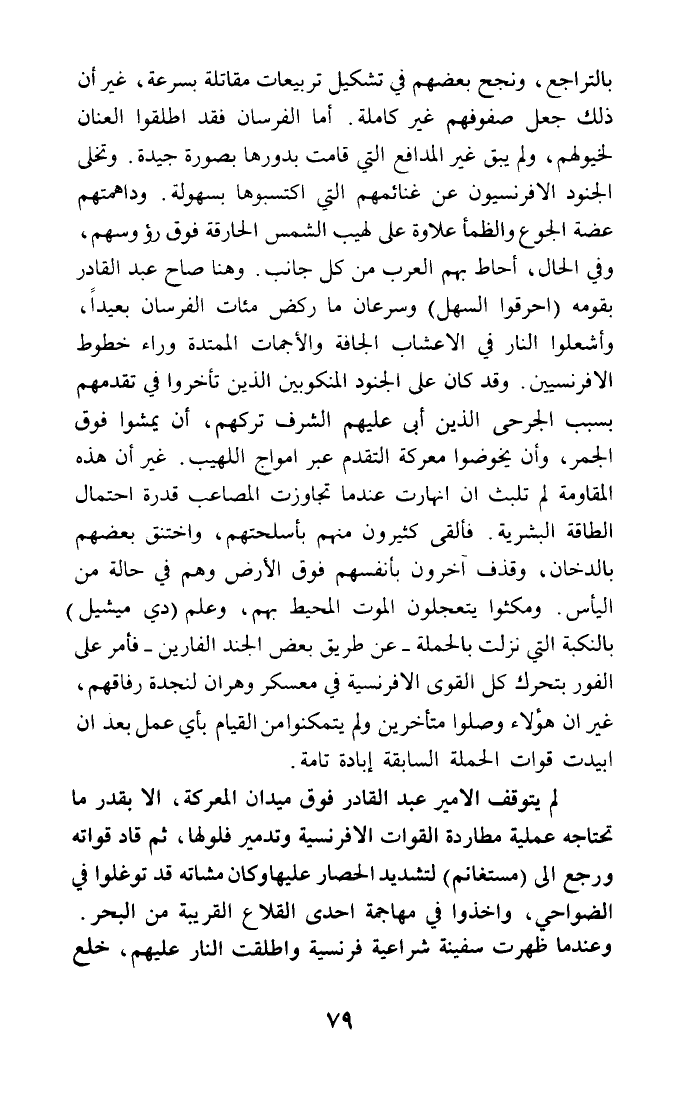 بالتراجع، ونجح بعضهم في تشكيل تربيعات مقاتلة بسرعة، غير أن ذلك جعل صفوفهم غير كاملة. أما الفرسان فقد أطلقوا العنان لخيولهم، ولم يبق غير المدافع التي قامت بدورها بصورة جيدة. وتخلى الجنود الإفرنسيون عن غنائمهم التي اكتسبوها بسهولة. وداهمتهم عضة الجوع والظمأ علاوة على لهيب الشمس الحارقة فوق رؤوسهم، وفي الحال، أحاط بهم العرب من كل جانب. وهنا صاح عبد القادر بقومه (احرقوا السهل) وسرعان ما ركض مئات الفرسان بعيدا، وأشعلوا النار في الأعشاب الجافة والأجمات الممتدة وراء خطوط الإفرنسيين. وقد كان على الجنود المنكوبين الذين تأخروا في تقدمهم بسبب الجرحى الذين أبى عليهم الشرف تركهم، أن يمشوا فوق الجمر، وأن يخوضوا معركة التقدم عبر أمواج اللهيب. غير أن هذه المقاومة لم تلبث أن انهارت عندما تجاوزت المصاعب قدرة احتمال الطاقة البشرية. فألقى كثيرون منهم بأسلحتهم، واختنق بعضهم بالدخان، وقذف آخرون بأنفسهم فوق الأرض وهم في حالة من اليأس. ومكثوا يتعجلون الموت المحيط بهم، وعلم (دي ميشيل) بالنكبة التي نزلت بالحملة - عن طريق بعض الجند الفارين - فأمر على الفور بتحرك كل القوى الإفرنسية في معسكر وهران لنجدة رفاقهم، غير أن هؤلاء وصلوا متأخرين ولم يتمكنوا من القيام بأي عمل بعد أن أبيدت قوات الحملة السابقة إبادة تامة.
