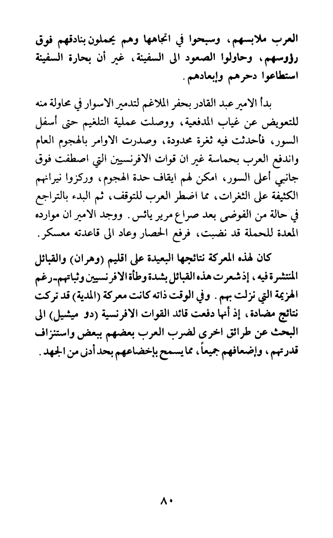بدأ الأمير عبد القادر بحفر الملاغم لتدمير الأسوار في محاولة منه للتعويض عن غياب المدفعية، ووصلت عملية التلغيم حتى أسفل السور، فأحدثت فيه ثغرة محدودة، وصدرت الأوامر بالهجوم العام واندفع العرب بحماسة غير أن قوات الإفرنسيين التي اصطفت فوق جانبي أعلى السور، أمكن لهم إيقاف حدة الهجوم، وركزوا نيرانهم الكثيفة على الثغرات، مما اضطر العرب للتوقف، ثم البدء بالتراجع في حالة من الفوضى بعد صراع مرير يائس. ووجد الأمير أن موارده المعدة للحملة قد نضبت، فرفع الحصار وعاد إلى قاعدته معسكر.