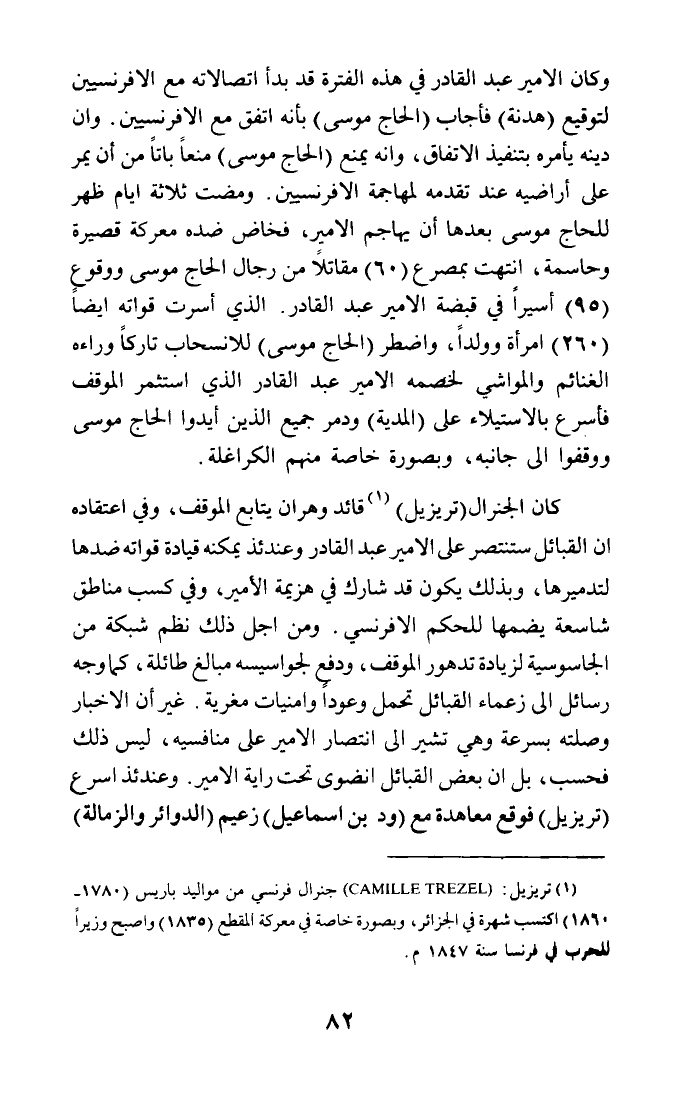 (¬1) تريزيل: (CAMILLE TREZEL) جنرال فرنسي من مواليد باريس (1780 - 1860) اكتسب شهرة في الجزائر، وبصورة خاصة في معركة المقطع (1835) وأصبح وزيرا للحرب في فرنسا سنة 1847 م.