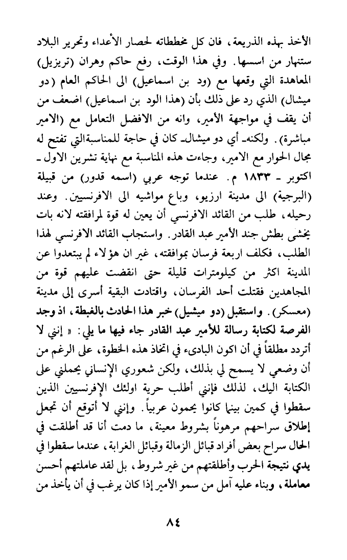 الأخذ بهذه الذريعة، فإن كل مخططاته لحصار الأعداء وتحرير البلاد ستنهار من أسسها. وفي هذا الوقت، رفع حاكم وهران (تريزيل) المعاهدة التي وقعها مع (ود بن إسماعيل) إلى الحاكم العام (دو ميشال) الذي رد على ذلك بأن (هذا الود بن إسماعيل) أضعف من أن يقف في مواجهة الأمير، وأنه من الأفضل التعامل مع (الأمير مباشرة). ولكنه - أي دو ميشال - كان في حاجة للمناسبة التي تفتح له مجال الحوار مع الأمير، وجاءت هذه المناسبة مع نهاية تشرين الأول - أكتوبر - 1833 م. عندما توجه عربي (اسمه قدور) من قبيلة (البرجية) إلى مدينة أرزيو، وباع مواشيه إلى الإفرنسيين. وعند رحيله، طلب من القائد الإفرنسي أن يعين له قوة لمرافقته لأنه بات يخشى بطش جند الأمير عبد القادر. واستجاب القائد الإفرنسي لهذا الطلب، فكلف أربعة فرسان بموافقته، غير أن هؤلاء لم يبتعدوا عن المدينة أكثر من كيلومترات قليلة حتى انقضت عليهم قوة من المجاهدين فقتلت أحد الفرسان، واقتادت البقية أسرى إلى مدينة (معسكر). واستقبل (دو ميشيل) خبر هذا الحادث بالغبطة، إذ وجد الفرصة لكتابة رسالة للأمير عبد القادر جاء فيها ما يلي: (إنني لا أتردد مطلقا في أن أكون البادىء في اتخاذ هذه الخطوة، على الرغم من أن وضعي لا يسمح لي بذلك، ولكن شعوري الإنساني يحملني على الكتابة إليك، لذلك فإنني أطلب حرية أولئك الإفرنسيين الذين سقطوا في كمين بينما كانوا يحمون عربيا. وإنني لا أتوقع أن تجعل إطلاق سراحهم مرهونا بشروط معينة، ما دمت أنا قد أطلقت في الحال سراح بعض أفراد قبائل الزمالة وقبائل الغرابة، عندما سقطوا في يدي نتيجة الحرب وأطلقتهم من غير شروط، بل لقد عاملتهم أحسن معاملة، وبناء عليه آمل من سمو الأمير إذا كان يرغب في أن يأخذ من