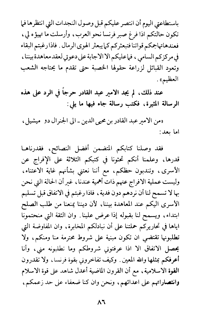 فقد وصلنا كتابكم المتضمن أفضل النصائح، فقدرناها قدرها، وعلمنا أنكم تحثونا في كتبكم الثلاثة على الإفراج عن الأسرى، وتندبون حظكم، مع أننا نعتني بشأنهم غاية الاعتناء، وليست عملية الإفراج عنهم ذات أهمية عندنا، غير أن الحالة التي نحن بها لا تسمح لنا أن نردهم دون فدية، فإذا رغبتم في الاتفاق قبل تسليم الأسرى إليكم عند المعاهدة بيننا، لأن ديننا يمنعنا من طلب الصلح ابتداء، ويسمح لنا بقبوله إذا عرض علينا. وأن الثقة التي منحتمونا إياها في تحاريركم حملتنا على أن نبادلكم المخابرة، وأن المفاوضة التي تطلبونها تقتضي أن تكون مبنية على شروط محترمة منا ومنكم، ولا يحصل الاتفاق إلا إذا عرفتوني شروطكم وما تطلبونه مني، وأنا أعرفكم بمثلها والله المعين. وكيف تفاخروني بقوة فرنسا، ولا تقدرون القوة الإسلامية، مع أن القرون الماضية أعدل شاهد على قوة الإسلام وانتصاراتهم على أعدائهم، ونحن وإن كنا ضعفاء على حد زعمكم،