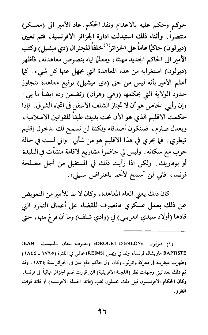 (¬1) ديرلون: (DROUET D'ERLON) ويعرف بجان بابتيست - JEAN BATISTE ماريشال فرنسا، ولد في ريمس (REIMS) عاش في الفترة (1765 - 1844) وظهرت عبقريته في معركة واترلو - وكان أول حاكم عام عين في الجزائر سنة 1834، وقد تم ذلك بعد تبني وجهات نظر (اللجنة الإفريقية) التي قررت ضم الجزائر نهائيا إلى فرنسا. وكان الحكام الإفرنسيون قبل ذلك يحملون لقب (قائد الحملة الإفرنسية) أو قائد قوات الغزو.