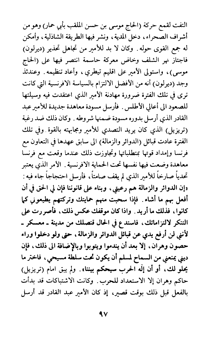 التفت لقمع حركة (الحاج موسى بن حسن الملقب بأبي حمار) وهو من أشراف الصحراء، دخل المدية، ونشر فيها الطريقة الثاذلية، وأمكن له جمع القوى حوله. وكان لا بد للأمير من تجاهل تحذير (ديرلون) فاجتاز نهر الشلف وخاض معركة حاسمة انتصر فيها على (الحاج موسى)، واستولى الأمير على إقليم تيطري، وأعاد تنظيمه. وعندئذ وجد (ديرلون) أنه من الأفضل الالتزام بالسياسة الإفرنسية التي كانت ترى في ملك الفترة ضرورة مهادنة الأمير الذي اعتقدت فيه وسيلتها للصعود إلى أعالي الأطلس. فأرسل مسودة معاهدة جديدة للأمير عبد القادر الذي أرسل بدوره مسودة ضمنها شروطه. وكان ذلك ضد رغبة (تريزيل) الذي كان يريد التصدي للأمير ومجابهته بالقوة , وفي تلك الفترة عادت قبائل (الدوائر والزمالة) إلى سابق عهدها في التعاون مع فرنسا وإمداد قوتها بمتطلباتها وتجاوزت ذلك عندما وقعث مع فرنسا معاهدة وضعت فيها نفسها تحت الحماية الإفرنسية. الأمر الذي يعتبر تحديا صارخا للأمير الذي لم يقف صامتا، فأرسل احتجاجا جاء فيه: (إن الدوائر والزمالة هم رعيتي، وبناء على قانوننا فإن لي الحق في أن أفعل بهم ما أشاء. فإذا سحبت منهم حمايتك وتركتهم يطيعوني كما كانوا، فذلك ما أريد. وإذا كان موقفك عكس ذلك، فأصررت على التنكر لالتزاماتك، فاستدع في الحال قنصلك من مدينة - معسكر- لأنني لن أرفع يدي عن قبائل الدوائر والزمالة، حتى ولو دخلوا وراء حصون وهران، إلا بعد أن يندموا ويتوبوا وبالإضافة إلى ذلك، فإن ديني يمنعي من السماح لمسلم أن يكون تحت سلطة مسيحي، فاختر ما يحلو لك، أو أن إله الحرب سيحكم بيننا). ولم يبق أمام (تريزيل) حاكم وهران إلا الاستعداد للحرب. وكانت الاشتباكات قد بدأت بالفعل قبل ذلك بوقت قصير، إذ كان الأمير عبد القادر قد أرسل
