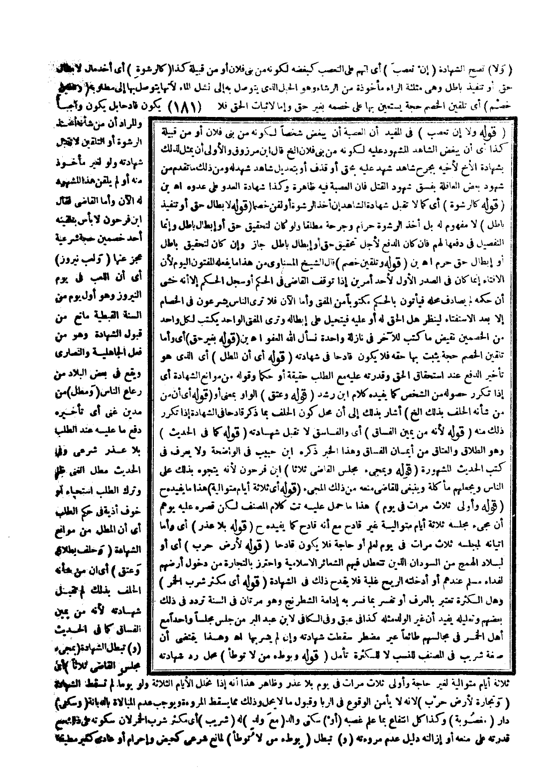 (وَلَا) تَصِحُّ الشَّهَادَةُ (إنْ تَعَصَّبَ) أَيْ اُتُّهِمَ عَلَى التَّعَصُّبِ كَبُغْضِهِ لِكَوْنِهِ مِنْ بَنِي فُلَانٍ أَوْ مِنْ قَبِيلَةِ كَذَا (كَالرِّشْوَةِ) أَيْ أَخْذُ مَالٍ لِإِبْطَالِ حَقٍّ أَوْ تَنْفِيذِ بَاطِلٍ وَهِيَ مُثَلَّثَةُ الرَّاءِ مَأْخُوذَةٌ مِنْ الرِّشَاءِ وَهُوَ الْحَبْلُ الَّذِي يُتَوَصَّلُ بِهِ إلَى نَشْلِ الْمَاءِ لِأَنَّهَا يَتَوَصَّلُ بِهَا إلَى مَطْلُوبِهِ (وَتَلْقِينِ خَصْمٍ) أَيْ تَلْقِينِ الْخَصْمِ حُجَّةً يَسْتَعِينُ بِهَا عَلَى خَصْمِهِ بِغَيْرِ حَقٍّ وَأَمَّا لِإِثْبَاتِ الْحَقِّ فَلَا يَكُونُ قَادِحًا بَلْ يَكُونُ وَاجِبًا وَالْمُرَادُ أَنَّ مِنْ شَأْنِهِ أَخْذُ الرِّشْوَةِ أَوْ التَّلْقِينِ لَا تُقْبَلُ شَهَادَتُهُ وَلَوْ لِغَيْرِ مَأْخُوذٍ مِنْهُ أَوْ لَمْ يُلَقَّنْ هَذَا الْمَشْهُودُ لَهُ الْآنَ وَأَمَّا الْقَاضِي فَقَالَ ابْنُ فَرْحُونٍ لَا بَأْسَ بِتَلْقِينِهِ أَحَدَ خَصْمَيْنِ حُجَّةً شَرْعِيَّةً عَجَزَ عَنْهَا