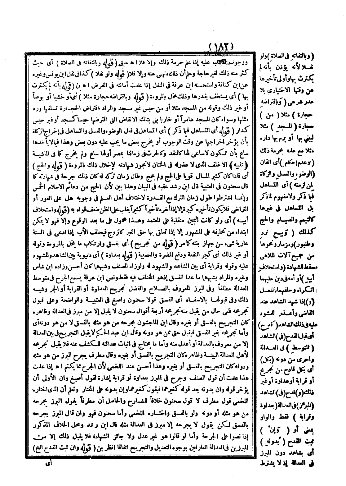 (قَوْلُهُ وَبِالْتِفَاتِهِ فِي الصَّلَاةِ) أَيْ حَيْثُ كَثُرَ مِنْهُ ذَلِكَ لِغَيْرِ حَاجَةٍ وَعَلِمَ أَنَّ ذَلِكَ مَنْهِيٌّ عَنْهُ وَإِلَّا فَلَا (قَوْلُهُ وَلَوْ نَفْلًا) كَذَا فِي نَقْلِ ابْنُ يُونُسَ وَغَيْرِهِ عَنْ ابْنِ كِنَانَةَ وَاسْتَحْسَنَهُ ابْنُ عَرَفَةَ فِي النَّفْلِ إذَا عُلِمَتْ أَمَانَتُهُ فِي الْفَرْضِ اهـ بْن (قَوْلُهُ بِأَنَّهُ لَمْ يَكْتَرِثْ بِهَا) أَيْ يَسْتَخِفَّ بِقَدْرِهَا وَذَلِكَ مُخِلٌّ بِالْمُرُوءَةِ (قَوْلُهُ وَبِاقْتِرَاضِهِ حِجَارَةً مَثَلًا) أَيْ أَوْ خَشَبًا أَوْ بُوصًا أَوْ غَيْرَ ذَلِكَ وَقَوْلُهُ مِنْ الْمَسْجِدِ مَثَلًا أَوْ مِنْ حَبْسِ غَيْرِ مَسْجِدٍ وَالْمُرَادُ بِاقْتِرَاضِ الْحِجَارَةِ تَسَلَّفَهَا وَرَدَّ مِثْلَهَا وَسَوَاءٌ كَانَ الْمَسْجِدُ عَامِرًا أَوْ خَارِبًا بَنَى بِتِلْكَ الْأَنْقَاضِ الَّتِي اقْتَرَضَهَا حَبْسًا كَمَسْجِدٍ أَوْ غَيْرِ حَبْسٍ كَدَارٍ (قَوْلُهُ أَيْ التَّسَاهُلُ فِيمَا ذُكِرَ) أَيْ التَّسَاهُلُ فِي فِعْلِ الْوُضُوءِ وَالْغُسْلِ وَالتَّسَاهُلُ فِي إخْرَاجِ الزَّكَاةِ بِأَنْ يُؤَخِّرَ إخْرَاجَهَا عَنْ وَقْتِ الْوُجُوبِ أَوْ يُخْرِجَ بَعْضَ مَا يَجِبُ عَلَيْهِ دُونَ بَعْضٍ وَهَذَا فِيمَا لَا يَأْخُذُهَا سَاعٍ بِأَنْ تَكُونَ لَا سَاعِيَ لَهَا كَالنَّقْدِ وَكَالْحَرْثِ فِي زَمَانِنَا بِمِصْرَ أَوْ لَهَا سَاعٍ وَلَمْ يُخْرِجْ كَمَا فِي الْمَاشِيَةِ (تَنْبِيهٌ) إلَّا غُلْفَ الَّذِي لَا عُذْرَ لَهُ فِي الْخِتَانِ لَا تَجُوزُ شَهَادَتُهُ لِإِخْلَالِ ذَلِكَ بِالْمُرُوءَةِ (قَوْلُهُ وَالْحَجُّ) أَيْ فَإِذَا كَانَ كَثِيرُ الْمَالِ قَوِيًّا عَلَى الْحَجِّ وَلَمْ يَحُجَّ وَطَالَ زَمَانُ تَرْكِهِ لَهُ كَانَ ذَلِكَ جُرْحَةً فِي شَهَادَتِهِ كَمَا قَالَ سَحْنُونٌ فِي الْعُتْبِيَّةِ قَالَ ابْنُ رُشْدٍ عَقِبَهُ فِي الْبَيَانِ وَهَذَا بَيِّنٌ لِأَنَّ الْحَجَّ مِنْ دَعَائِمِ الْإِسْلَامِ الْخَمْسِ وَإِنَّمَا اشْتَرَطُوا طُولَ زَمَانِ التَّرْكِ مَعَ الْقُدْرَةِ لِاخْتِلَافِ أَهْلِ الْعِلْمِ فِي وُجُوبِهِ هَلْ عَلَى الْفَوْرِ أَوْ التَّرَاخِي فَلَا يَكُونُ تَأْخِيرُهُ كَبِيرَةً إلَّا إذَا أَخَّرَهُ تَأْخِيرًا كَثِيرًا يَغْلِبُ عَلَى الظَّنِّ ضَعْفُ قُوَاهُ بِهِ (قَوْلُهُ وَاسْتِحْلَافِ أَبِيهِ) أَيْ وَلَوْ كَانَتْ الْيَمِينُ مُنْقَلِبَةً عَلَى الْمُعْتَمَدِ وَهَذَا مَحْمُولٌ عَلَى مَا بَعْدَ الْوُقُوعِ وَإِلَّا فَهُوَ لَا يُمْكِنُ ابْتِدَاءً مِنْ تَحْلِيفِهِ عَلَى الْمَشْهُورِ إلَّا إذَا تَعَلَّقَ بِهَا حَقُّ الْغَيْرِ كَالزَّوْجِ فَيَحْلِفُ الْأَبُ إذَا ادَّعَى فِي السَّنَةِ عَارِيَّةَ شَيْءٍ مِنْ جِهَازِ بِنْتِهِ كَمَا مَرَّ