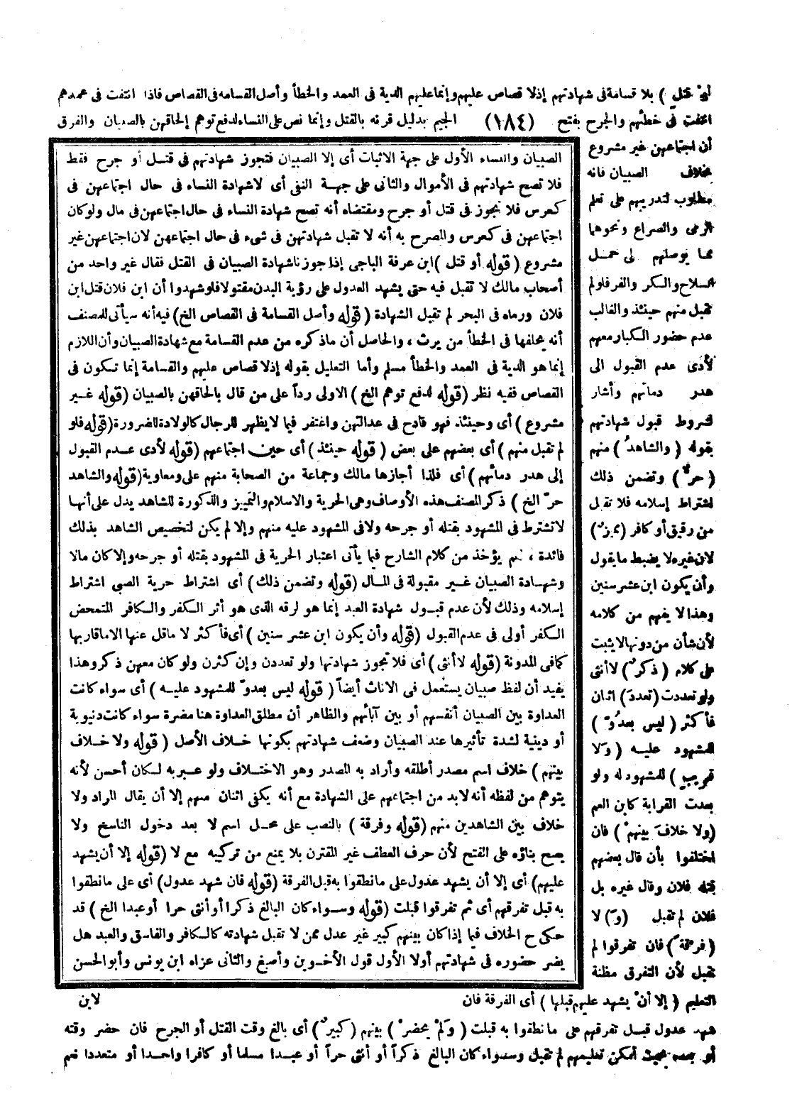 ـــــــــــــــــــــــــــــQالصِّبْيَانِ وَالنِّسَاءِ الْأَوَّلُ عَلَى جِهَةِ الْإِثْبَاتِ أَيْ إلَّا الصِّبْيَانَ فَتَجُوزُ شَهَادَتُهُمْ فِي قَتْلٍ أَوْ جُرْحٍ فَقَطْ فَلَا تَصِحُّ شَهَادَتُهُمْ فِي الْأَمْوَالِ وَالثَّانِي عَلَى جِهَةِ النَّفْيِ أَيْ لَا شَهَادَةَ النِّسَاءِ فِي حَالِ اجْتِمَاعِهِنَّ فِي كَعُرْسٍ فَلَا تَجُوزُ فِي قَتْلٍ أَوْ جُرْحٍ وَمُقْتَضَاهُ أَنَّهُ تَصِحُّ شَهَادَةُ النِّسَاءِ فِي حَالَ اجْتِمَاعِهِنَّ فِي مَالٍ وَلَوْ كَانَ اجْتِمَاعُهُنَّ فِي كَعُرْسٍ وَالْمُصَرِّحُ بِهِ أَنَّهُ لَا تُقْبَلُ شَهَادَتُهُنَّ فِي شَيْءٍ فِي حَالِ اجْتِمَاعِهِنَّ لِأَنَّ اجْتِمَاعَهُنَّ غَيْرُ مَشْرُوعٍ (قَوْلُهُ أَوْ قَتْلٍ) ابْنُ عَرَفَةَ الْبَاجِيَّ إذَا جَوَّزْنَا شَهَادَةَ الصِّبْيَانِ فِي الْقَتْلِ فَقَالَ غَيْرُ وَاحِدٍ مِنْ أَصْحَابِ مَالِكٍ لَا تُقْبَلُ فِيهِ حَتَّى يَشْهَدَ الْعُدُولُ عَلَى رُؤْيَةِ الْبَدَنِ مَقْتُولًا فَلَوْ شَهِدُوا أَنَّ ابْنَ فُلَانٍ قَتَلَ ابْنَ فُلَانٍ وَرَمَاهُ فِي الْبَحْرِ لَمْ تُقْبَلْ الشَّهَادَةُ (قَوْلُهُ وَأَصْلُ الْقَسَامَةِ فِي الْقِصَاصِ إلَخْ) فِيهِ أَنَّهُ سَيَأْتِي لَلْمُصَنِّفِ أَنَّهُ يُحَلِّفُهَا فِي الْخَطَأِ مَنْ يَرِثُ، وَالْحَاصِلُ أَنَّ مَا ذَكَرَهُ مِنْ عَدَمِ الْقَسَامَةِ مَعَ شَهَادَةِ الصِّبْيَانِ وَأَنَّ اللَّازِمَ إنَّمَا هُوَ الدِّيَةُ فِي الْعَمْدِ وَالْخَطَأِ مُسَلَّمٌ وَأَمَّا التَّعْلِيلُ بِقَوْلِهِ إذْ لَا قِصَاصَ وَالْقَسَامَةُ إنَّمَا تَكُونُ فِي الْقِصَاصِ فَفِيهِ نَظَرٌ (قَوْلُهُ لِدَفْعِ تَوَهُّمِ إلَخْ) الْأَوْلَى رَدًّا عَلَى مَنْ قَالَ بِإِلْحَاقِهِنَّ بِالصِّبْيَانِ (قَوْلُهُ غَيْرُ مَشْرُوعٍ) أَيْ وَحِينَئِذٍ فَهُوَ قَادِحٌ فِي عَدَالَتِهِنَّ وَاغْتُفِرَ فِيمَا لَا يَظْهَرُ لِلرِّجَالِ كَالْوِلَادَةِ لِلضَّرُورَةِ (قَوْلُهُ فَلَوْ لَمْ تُقْبَلْ مِنْهُمْ) أَيْ بَعْضِهِمْ عَلَى بَعْضٍ (قَوْلُهُ حِينَئِذٍ) أَيْ حِينَ اجْتِمَاعِهِمْ (قَوْلُهُ لَأَدَّى عَدَمُ الْقَبُولِ إلَى هَدَرِ دِمَائِهِمْ) أَيْ فَلِذَا أَجَازَهَا مَالِكٌ وَجَمَاعَةٌ مِنْ الصَّحَابَةِ مِنْهُمْ عَلِيٌّ وَمُعَاوِيَةُ