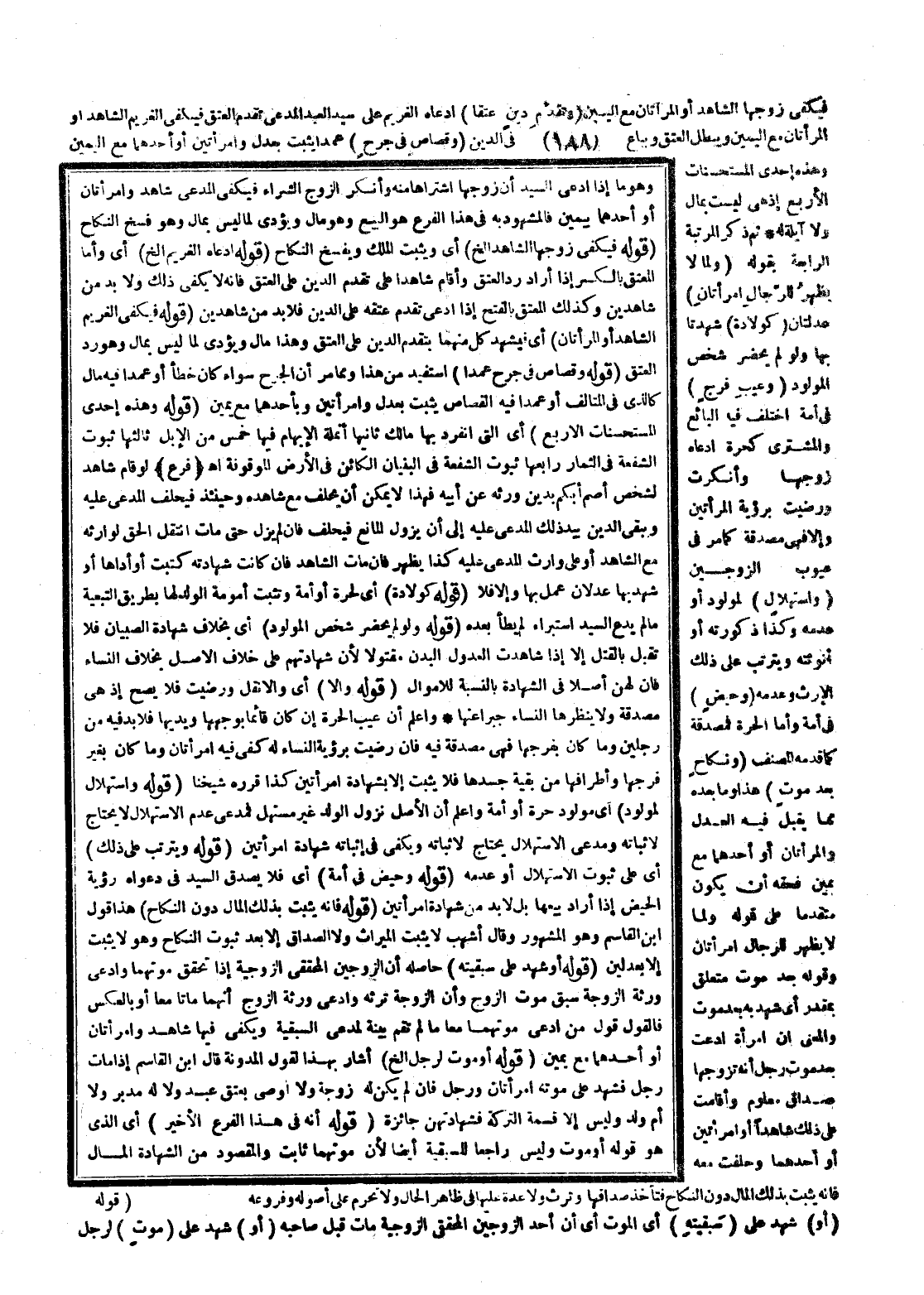 ـــــــــــــــــــــــــــــQوَهُوَ مَا إذَا ادَّعَى السَّيِّدُ أَنَّ زَوْجَهَا اشْتَرَاهَا مِنْهُ وَأَنْكَرَ الزَّوْجُ الشِّرَاءَ فَيَكْفِي الْمُدَّعِيَ شَاهِدٌ وَامْرَأَتَانِ أَوْ أَحَدُهُمَا بِيَمِينٍ فَالْمَشْهُودُ بِهِ فِي هَذَا الْفَرْعِ هُوَ الْبَيْعُ وَيُؤَدِّي لِمَا لَيْسَ بِمَالٍ وَهُوَ فَسْخُ النِّكَاحِ (قَوْلُهُ فَيَكْفِي زَوْجُهَا الشَّاهِدُ إلَخْ) أَيْ وَيَثْبُتُ الْمِلْكُ وَيُفْسَخُ النِّكَاحُ (قَوْلُهُ ادَّعَاهُ الْغَرِيمُ إلَخْ) أَيْ وَأَمَّا الْمُعْتِقُ بِالْكَسْرِ إذَا أَرَادَ رَدَّ الْعِتْقَ وَأَقَامَ شَاهِدًا عَلَى تَقْدِيمِ الدَّيْنِ عَلَى الْعِتْقِ فَإِنَّهُ لَا يَكْفِي ذَلِكَ وَلَا بُدَّ مِنْ شَاهِدَيْنِ وَكَذَلِكَ الْمُعْتَقُ بِالْفَتْحِ إذَا ادَّعَى تَقَدَّمَ عِتْقِهِ عَلَى الدَّيْنِ فَلَا بُدَّ مِنْ شَاهِدَيْنِ (قَوْلُهُ فَيَكْفِي الْغَرِيمَ الشَّاهِدُ أَوْ الْمَرْأَتَانِ) أَيْ فَيَشْهَدُ كُلٌّ مِنْهُمَا بِتَقَدُّمِ الدَّيْنِ عَلَى الْعِتْقِ وَهَذَا مَالٌ وَيُؤَدَّى لِمَا لَيْسَ بِمَالٍ وَهُوَ رَدُّ الْعِتْقِ (قَوْلُهُ وَقِصَاصٍ فِي جُرْحٍ عَمْدًا) اُسْتُفِيدَ مِنْ هَذَا وَمِمَّا مَرَّ أَنَّ الْجَرْحَ سَوَاءٌ كَانَ خَطَأً أَوْ عَمْدًا فِيهِ مَالٌ كَاَلَّذِي فِي الْمَتَالِفِ أَوْ عَمْدًا فِيهِ الْقِصَاصُ يَثْبُتُ بِعَدْلٍ وَامْرَأَتَيْنِ وَبِأَحَدِهِمَا مَعَ يَمِينٍ (قَوْلُهُ وَهَذِهِ إحْدَى الْمُسْتَحْسَنَاتِ الْأَرْبَعِ) أَيْ الَّتِي انْفَرَدَ بِهَا مَالِكٌ ثَانِيهَا أُنْمُلَةُ الْإِبْهَامِ فِيهَا خَمْسٌ مِنْ الْإِبِلِ ثَالِثُهَا ثُبُوتُ الشُّفْعَةِ فِي الثِّمَارِ رَابِعُهَا ثُبُوتُ الشُّفْعَةِ فِي الْبُنْيَانِ الْكَائِنِ فِي الْأَرْضِ الْمَوْقُوفَةِ اهـ (فَرْعٌ) لَوْ قَامَ شَاهِدٌ لِشَخْصٍ أَصَمَّ أَبْكَمَ بِدَيْنٍ وَرِثَهُ عَنْ أَبِيهِ فَهَذَا لَا يُمْكِنُ أَنْ يَحْلِفَ مَعَ شَاهِدِهِ وَحِينَئِذٍ فَيَحْلِفُ الْمُدَّعَى عَلَيْهِ وَيَبْقَى الدَّيْنُ بِيَدِ ذَلِكَ الْمُدَّعَى عَلَيْهِ إلَى أَنْ يَزُولَ الْمَانِعُ فَيَحْلِفَ فَإِنْ لَمْ يَزُلْ حَتَّى مَاتَ انْتَقَلَ الْحَقُّ لِوَارِثِهِ مَعَ الشَّاهِدِ أَوْ عَلَى وَارِثِ الْمُدَّعَى عَلَيْهِ كَذَا يَظْهَرُ فَإِنْ مَاتَ الشَّاهِدُ فَإِنْ كَانَتْ شَهَادَتُهُ كُتِبَتْ أَوْ أَدَّاهَا أَوْ شَهِدَ بِهَا عَدْلَانِ عُمِلَ بِهَا وَإِلَّا فَلَا