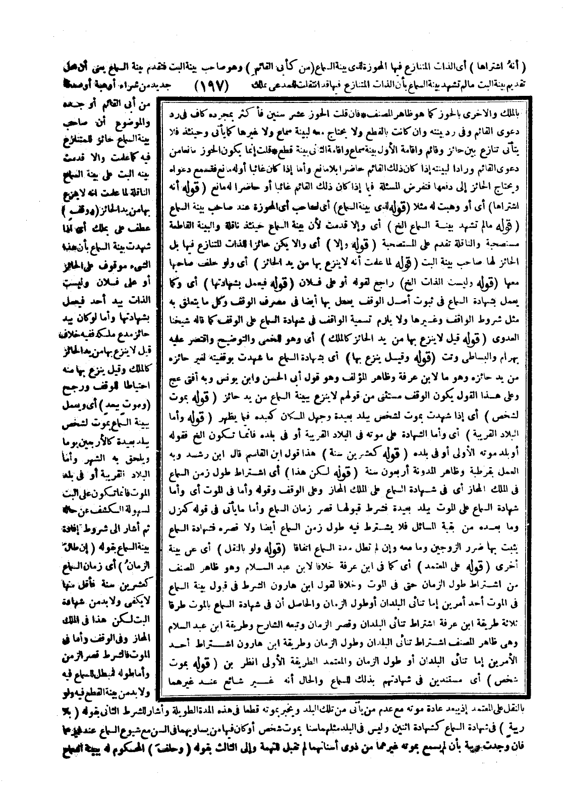 ثُمَّ أَشَارَ إلَى شُرُوطِ إفَادَةِ بَيِّنَةِ السَّمَاعِ بِقَوْلِهِ (إنْ طَالَ الزَّمَانُ) أَيْ زَمَانُ السَّمَاعِ كَعِشْرِينَ سَنَةً فَأَقَلَّ مِنْهَا لَا يَكْفِي وَلَا بُدَّ مِنْ شَهَادَةِ الْبَتِّ لَكِنْ هَذَا فِي الْمِلْكِ الْمُحَازِ وَفِي الْوَقْفِ وَأَمَّا فِي الْمَوْتِ فَالشَّرْطُ قِصَرُ الزَّمَنِ وَأَمَّا طُولُهُ فَمُبْطِلٌ لِلسَّمَاعِ فِيهِ وَلَا بُدَّ مِنْ بَيِّنَةِ الْقَطْعِ فِيهِ وَلَوْ بِالنَّقْلِ عَلَى الْمُعْتَمَدِ إذْ يَبْعُدُ عَادَةً مَوْتُهُ مَعَ عَدَمِ مَنْ يَأْتِي مِنْ تِلْكَ الْبِلَادِ وَيُخْبِرُ بِمَوْتِهِ قَطْعًا فِي هَذِهِ الْمُدَّةِ الطَّوِيلَةِ
