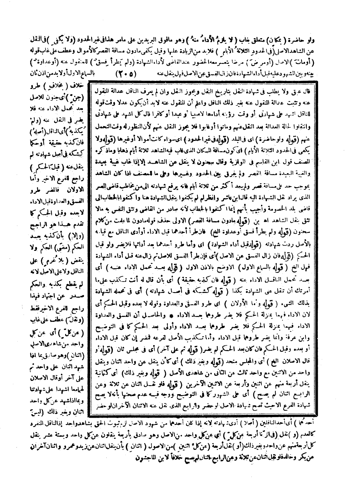 وَلَوْ حَاضِرَةً (بِمَكَانٍ) مُتَعَلِّقٌ بِغَابَ (لَا يَلْزَمُ الْأَدَاءُ مِنْهُ) وَهُوَ مَا فَوْقَ الْبَرِيدَيْنِ عَلَى مَا مَرَّ هَذَا فِي غَيْرِ الْحُدُودِ (وَلَا يَكْفِي) فِي النَّقْلِ عَنْ الشَّاهِدِ الْأَصْلِيِّ (فِي الْحُدُودِ الثَّلَاثَةُ الْأَيَّامُ) فَلَا بُدَّ مِنْ الزِّيَادَةِ عَلَيْهَا وَقِيلَ يَكْفِي مَا دُونَ مَسَافَةِ الْقَصْرِ كَالْأَمْوَالِ وَعَطَفَ عَلَى غَابَ قَوْلَهُ (أَوْ مَاتَ) الْأَصْلُ (أَوْ مَرِضَ) مَرَضًا يَتَعَسَّرُ مَعَهُ الْحُضُورُ عِنْدَ الْقَاضِي لِأَدَاءِ الشَّهَادَةِ (وَلَمْ يَطْرَأْ فِسْقٌ) لِلْمَنْقُولِ عَنْهُ (أَوْ عَدَاوَةٌ) بَيْنَهُ وَبَيْنَ الْمَشْهُودِ عَلَيْهِ قَبْلَ أَدَاءِ الشَّهَادَةِ فَإِنْ زَالَ الْفِسْقُ عَنْ الْأَصْلِ فَهَلْ يُنْقَلُ عَنْهُ بِالسَّمَاعِ الْأَوَّلِ أَوْ لَا بُدَّ مِنْ إذْنٍ ثَانٍ خِلَافٌ (بِخِلَافِ) طُرُوُّ (جَنٍّ) أَيْ جُنُونٍ لِلْأَصْلِ بَعْدَ تَحَمُّلِ الْأَدَاءِ عَنْهُ فَلَا يَضُرُّ فِي النَّقْلِ عَنْهُ (وَلَمْ يُكَذِّبْهُ) أَيْ النَّاقِلُ (أَصْلُهُ) فَإِنْ كَذَّبَهُ حَقِيقَةً أَوْ حُكْمًا كَشَكِّهِ فِي أَصْلِ شَهَادَتِهِ لَمْ يُنْقَلْ عَنْهُ (قَبْلَ الْحُكْمِ) رَاجِعٌ لِلْفَرْعِ الْأَخِيرِ وَأَمَّا الْأَوَّلَانِ فَالْمُضِرُّ طُرُوُّ الْفِسْقِ وَالْعَدَاوَةِ قَبْلَ الْأَدَاءِ لَا بَعْدَهُ وَقَبْلَ الْحُكْمِ كَمَا تَقَدَّمَ هَذَا هُوَ الرَّاجِحُ (وَإِلَّا) بِأَنْ كَذَّبَهُ بَعْدَ الْحُكْمِ (مَضَى) الْحُكْمُ وَلَا يُنْقَضُ (بِلَا غُرْمٍ) عَلَى النَّاقِلِ وَلَا عَلَى الْأَصْلِ لِأَنَّهُ لَمْ يُقْطَعْ بِكَذِبِهِ وَالْحُكْمُ صَدَرَ عَنْ اجْتِهَادٍ فَهَذَا رَاجِعٌ لِلْفَرْعِ الْأَخِيرِ فَقَطْ (وَنَقَلَ) عَطْفٌ عَلَى غَابَ (عَنْ كُلٍّ) أَيْ عَنْ كُلِّ وَاحِدٍ مِنْ شَاهِدَيْ الْأَصْلِ (اثْنَانِ) وَهُوَ صَادِقٌ بِمَا إذَا شَهِدَ اثْنَانِ عَلَى وَاحِدٍ ثُمَّ عَلَى آخَرَ أَوْ قَالَ الْأَصْلَانِ لَهُمَا مَعًا اشْهَدَا عَلَى شَهَادَتِنَا وَبِمَا إذَا شَهِدَ عَنْ كُلِّ وَاحِدٍ اثْنَانِ وَبِغَيْرِ ذَلِكَ (لَيْسَ أَحَدُهُمَا) أَيْ أَحَدُ النَّاقِلِينَ (إلَّا) أَدَّى شَهَادَتَهُ لِأَنَّهُ إذَا كَانَ أَحَدُهُمَا مِنْ شُهُودِ الْأَصْلِ لَزِمَ ثُبُوتُ الْحَقِّ بِشَاهِدٍ وَاحِدٍ إذْ النَّاقِلُ الْمُنْفَرِدُ كَالْعَدَمِ