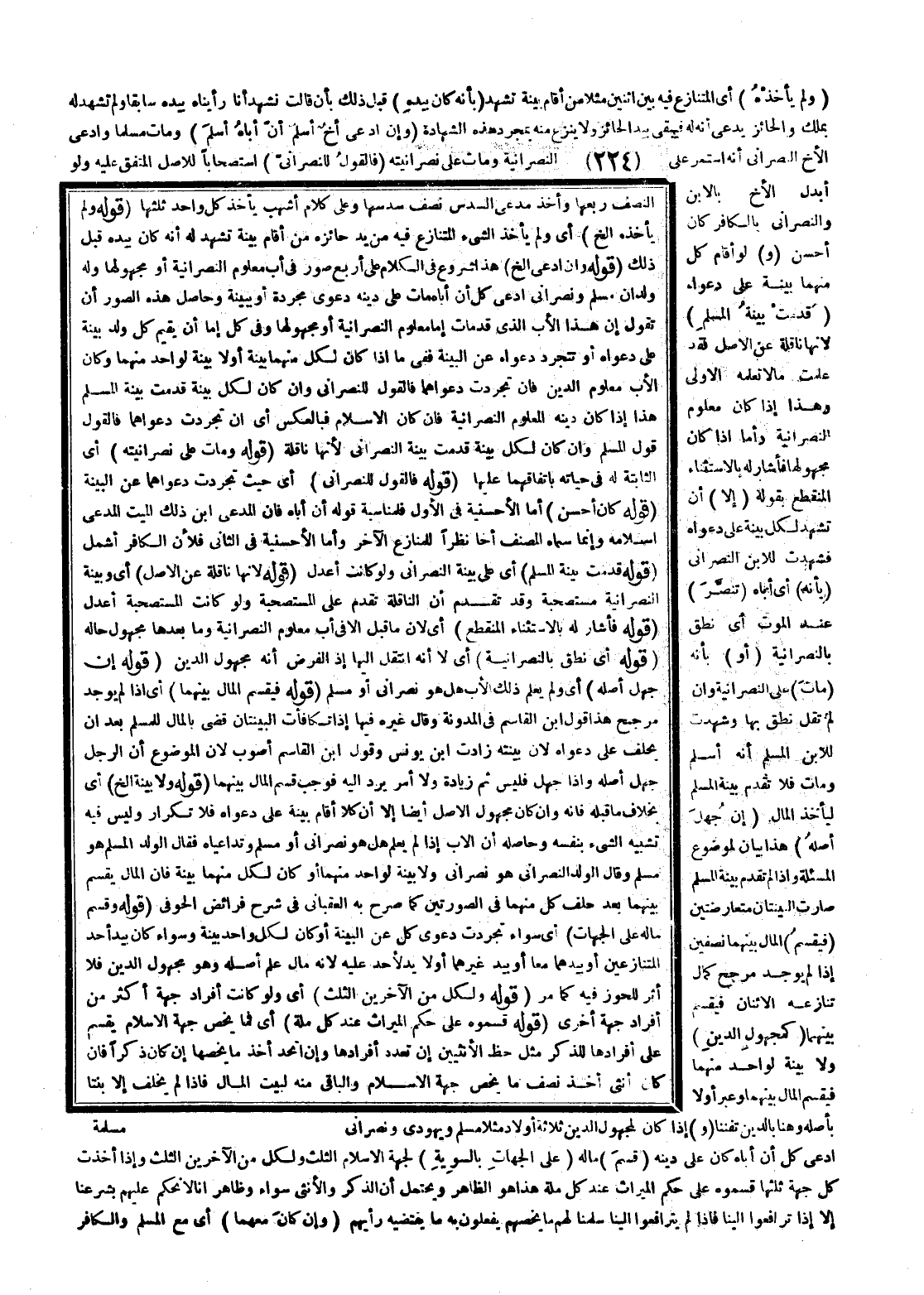 (قَوْلُهُ وَإِنْ ادَّعَى إلَخْ) هَذَا شُرُوعٌ فِي الْكَلَامِ عَلَى أَرْبَعِ صُوَرٍ فِي أَبٍ مَعْلُومِ النَّصْرَانِيَّةِ أَوْ مَجْهُولِهَا وَلَهُ وَلَدَانِ مُسْلِمٌ وَنَصْرَانِيٌّ ادَّعَى كُلٌّ أَنَّ أَبَاهُ مَاتَ عَلَى دِينِهِ دَعْوَى مُجَرَّدَةً أَوْ بِبَيِّنَةٍ وَحَاصِلُ هَذِهِ الصُّوَرِ أَنْ تَقُولَ إنَّ هَذَا الْأَبَ الَّذِي قَدْ مَاتَ إمَّا مَعْلُومُ النَّصْرَانِيَّةِ أَوْ مَجْهُولُهَا وَفِي كُلٍّ إمَّا أَنْ يُقِيمَ كُلُّ وَلَدٍ بَيِّنَةً عَلَى دَعْوَاهُ أَوْ تَتَجَرَّدُ دَعْوَاهُ عَنْ الْبَيِّنَةِ فَفِي مَا إذَا كَانَ لِكُلٍّ مِنْهُمَا بَيِّنَةٌ أَوْ لَا بَيِّنَةَ لِوَاحِدٍ مِنْهُمَا وَكَانَ الْأَبُ مَعْلُومَ الدِّينِ فَإِنْ تَجَرَّدَتْ دَعْوَاهُمَا فَالْقَوْلُ لِلنَّصْرَانِيِّ وَإِنْ كَانَ لِكُلٍّ بَيِّنَةٌ قُدِّمَتْ بَيِّنَةُ الْمُسْلِمِ هَذَا إذَا كَانَ دِينُهُ الْمَعْلُومُ النَّصْرَانِيَّةَ فَإِنْ كَانَ الْإِسْلَامُ فَبِالْعَكْسِ أَيْ إنْ تَجَرَّدَتْ دَعْوَاهُمَا فَالْقَوْلُ قَوْلُ الْمُسْلِمِ وَإِنْ كَانَ لِكُلٍّ بَيِّنَةٌ قُدِّمَتْ بَيِّنَةُ النَّصْرَانِيِّ لِأَنَّهَا نَاقِلَةٌ (قَوْلُهُ وَمَاتَ عَلَى نَصْرَانِيَّتِهِ) أَيْ الثَّابِتَةِ لَهُ فِي حَيَاتِهِ بِاتِّفَاقِهِمَا عَلَيْهَا (قَوْلُهُ فَالْقَوْلُ لِلنَّصْرَانِيِّ) أَيْ حَيْثُ تَجَرَّدَتْ دَعْوَاهُمَا عَنْ الْبَيِّنَةِ (قَوْلُهُ كَانَ أَحْسَنَ) أَمَّا الْأَحْسَنِيَّةُ فِي الْأَوَّلِ فَلِمُنَاسَبَةِ قَوْلِهِ إنَّ أَبَاهُ فَإِنَّ الْمُدَّعِيَ ابْنُ ذَلِكَ الْمَيِّتِ الْمُدَّعِي إسْلَامَهُ وَإِنَّمَا سَمَّاهُ الْمُصَنِّفُ أَخًا نَظَرًا لِلْمُنَازِعِ الْآخَرِ وَأَمَّا الْأَحْسَنِيَّةُ فِي الثَّانِي فَلِأَنَّ الْكَافِرَ أَشْمَلُ (قَوْلُهُ قُدِّمَتْ بَيِّنَةُ الْمُسْلِمِ) أَيْ بَيِّنَةُ النَّصْرَانِيِّ وَلَوْ كَانَتْ أَعْدَلَ (قَوْلُهُ لِأَنَّهَا نَاقِلَةٌ عَنْ الْأَصْلِ) أَيْ وَبَيِّنَةُ النَّصْرَانِيَّةِ مُسْتَصْحَبَةٌ وَقَدْ تَقَدَّمَ أَنَّ النَّاقِلَةَ تُقَدَّمُ عَلَى الْمُسْتَصْحَبَةِ وَلَوْ كَانَتْ الْمُسْتَصْحَبَةُ أَعْدَلَ (قَوْلُهُ فَأَشَارَ لَهُ بِالِاسْتِثْنَاءِ الْمُنْقَطِعِ) أَيْ لِأَنَّ مَا قَبْلُ إلَّا فِي أَبٍ مَعْلُومِ النَّصْرَانِيَّةِ وَمَا بَعْدَهَا مَجْهُولٌ حَالُهُ (قَوْلُهُ أَيْ نَطَقَ بِالنَّصْرَانِيَّةِ) أَيْ لَا أَنَّهُ انْتَقَلَ إلَيْهَا إذْ الْفَرْضُ أَنَّهُ مَجْهُولُ الدِّينِ (قَوْلُهُ إنْ جُهِلَ أَصْلُهُ) أَيْ وَلَمْ يُعْلَمْ ذَلِكَ الْأَبُ هَلْ هُوَ نَصْرَانِيٌّ أَوْ مُسْلِمٌ (قَوْلُهُ فَيُقَسَّمُ الْمَالُ بَيْنَهُمَا) أَيْ إذَا لَمْ يُوجَدْ مُرَجِّحٌ هَذَا قَوْلُ ابْنِ الْقَاسِمِ فِي الْمُدَوَّنَةِ وَقَالَ غَيْرُهُ فِيهَا إذَا تَكَافَأَتْ الْبَيِّنَتَانِ قُضِيَ بِالْمَالِ لِلْمُسْلِمِ بَعْدَ أَنْ يَحْلِفَ عَلَى دَعْوَاهُ لِأَنَّ بَيِّنَتَهُ زَادَتْ ابْنُ يُونُسَ وَقَوْلُ ابْنِ الْقَاسِمِ أَصْوَبُ لِأَنَّ الْمَوْضُوعَ أَنَّ الرَّجُلَ جُهِلَ أَصْلُهُ وَإِذَا جُهِلَ فَلَيْسَ ثَمَّ زِيَادَةٌ وَلَا أَمْرٌ يُرَدُّ إلَيْهِ فَوَجَبَ قَسْمُ الْمَالِ بَيْنَهُمَا