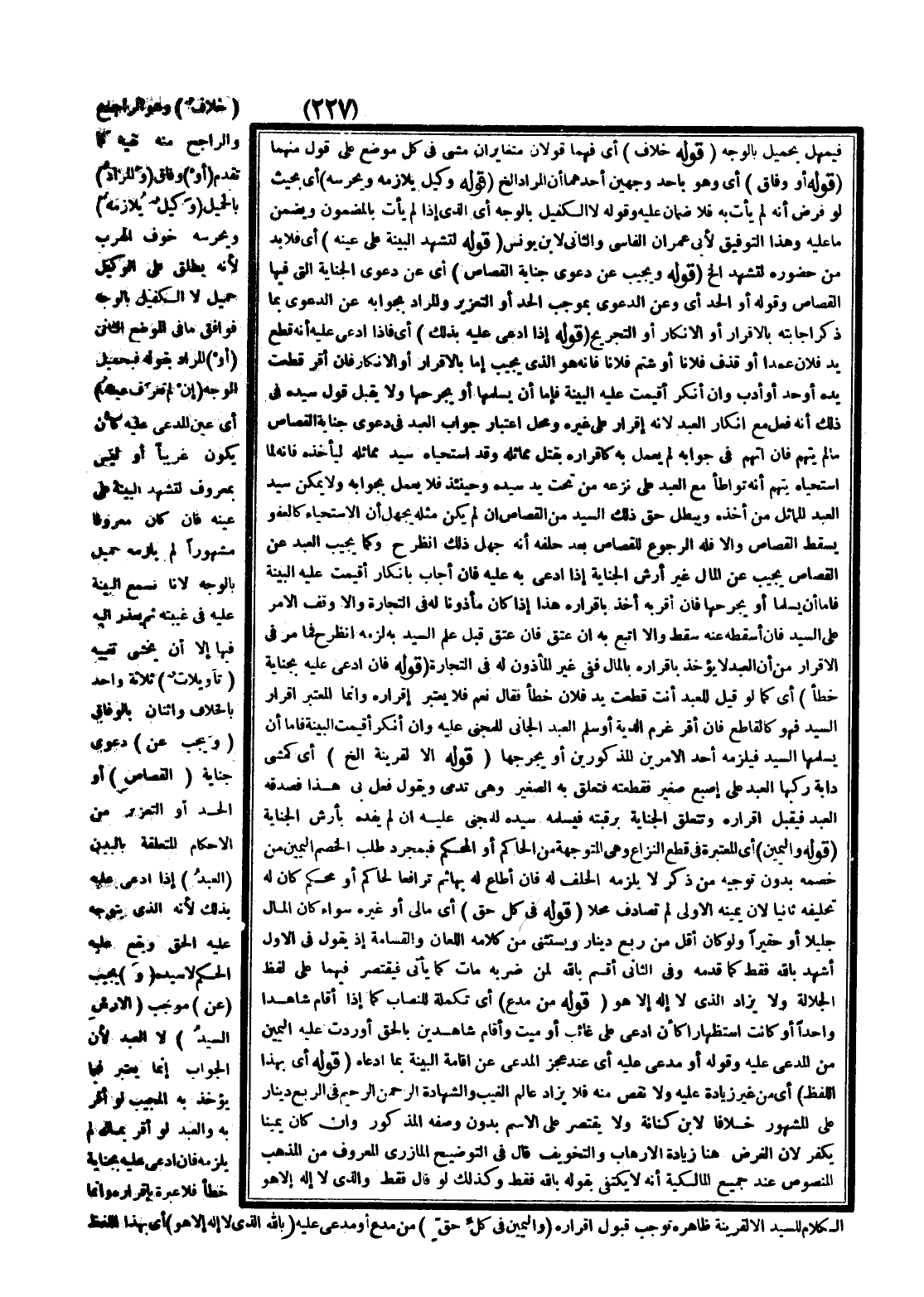 (قَوْلُهُ وَيُجِيبُ عَنْ دَعْوَى جِنَايَةِ الْقِصَاصِ) أَيْ عَنْ دَعْوَى الْجِنَايَةِ الَّتِي فِيهَا الْقِصَاصُ وَقَوْلُهُ أَوْ الْحَدُّ أَيْ وَعَنْ الدَّعْوَى بِمُوجِبِ الْحَدِّ أَوْ التَّعْزِيرِ وَالْمُرَادُ بِجَوَابِهِ عَنْ الدَّعْوَى بِمَا ذَكَرَا إجَابَتُهُ بِالْإِقْرَارِ أَوْ الْإِنْكَارِ أَوْ التَّجْرِيحِ (قَوْلُهُ إذَا ادَّعَى عَلَيْهِ بِذَلِكَ) أَيْ فَإِذَا ادَّعَى عَلَيْهِ أَنَّهُ قَطَعَ يَدَ فُلَانٍ عَمْدًا أَوْ قَذَفَ فُلَانًا أَوْ شَتَمَ فُلَانًا فَإِنَّهُ هُوَ الَّذِي يُجِيبُ إمَّا بِالْإِقْرَارِ أَوْ الْإِنْكَارِ فَإِنْ أَقَرَّ قُطِعَتْ يَدُهُ أَوْ حُدَّ أَوْ أُدِّبَ وَإِنْ أَنْكَرَ أُقِيمَتْ عَلَيْهِ الْبَيِّنَةُ فَإِمَّا أَنْ يُسَلِّمَهَا أَوْ يَجْرَحَهَا وَلَا يُقْبَلُ قَوْلُ سَيِّدِهِ فِي ذَلِكَ أَنَّهُ فَعَلَ مَعَ إنْكَارِ الْعَبْدِ لِأَنَّهُ إقْرَارٌ عَلَى غَيْرِهِ وَمَحَلُّ اعْتِبَارِ جَوَابِ الْعَبْدِ فِي دَعْوَى جِنَايَةِ الْقِصَاصِ مَا لَمْ يُتَّهَمْ فَإِنْ اُتُّهِمَ فِي جَوَابِهِ لَمْ يَعْمَلْ بِهِ كَإِقْرَارِهِ بِقَتْلِ مُمَاثِلِهِ وَقَدْ اسْتَحْيَاهُ سَيِّدُ مُمَاثِلِهِ لِيَأْخُذَهُ فَإِنَّهُ لَمَّا اسْتَحْيَاهُ يُتَّهَمُ أَنَّهُ تَوَاطَأَ مَعَ الْعَبْدِ عَلَى نَزْعِهِ مِنْ تَحْتِ يَدِ سَيِّدِهِ وَحِينَئِذٍ فَلَا يُعْمَلُ بِجَوَابِهِ وَلَا يُمَكَّنُ سَيِّدُ الْعَبْدِ الْمُمَاثِلِ مِنْ أَخْذِهِ وَيَبْطُلُ حَقُّ ذَلِكَ السَّيِّدِ مِنْ الْقِصَاصِ إنْ لَمْ يَكُنْ مِثْلُهُ يَجْهَلُ أَنَّ الِاسْتِحْيَاءَ كَالْعَفْوِ يُسْقِطُ الْقِصَاصَ وَإِلَّا فَلَهُ الرُّجُوعُ لِلْقِصَاصِ بَعْدَ حَلِفِهِ أَنَّهُ جَهِلَ ذَلِكَ اُنْظُرْ ح وَكَمَا يُجِيبُ الْعَبْدُ عَنْ الْقِصَاصِ يُجِيبُ عَنْ الْمَالِ غَيْرِ أَرْشِ الْجِنَايَةِ إذَا ادَّعَى بِهِ عَلَيْهِ فَإِنْ أَجَابَ بِإِنْكَارٍ أُقِيمَتْ عَلَيْهِ الْبَيِّنَةُ فَأَمَّا أَنْ يُسَلِّمَهَا أَوْ يُجَرِّحَهَا فَإِنْ أَقَرَّ بِهِ أُخِذَ بِإِقْرَارِهِ هَذَا إذَا كَانَ مَأْذُونًا لَهُ فِي التِّجَارَةِ وَإِلَّا وَقَفَ الْأَمْرُ عَلَى السَّيِّدِ فَإِنْ أَسْقَطَهُ عَنْهُ سَقَطَ وَإِلَّا اُتُّبِعَ بِهِ إنْ عَتَقَ فَإِنْ عَتَقَ قَبْلَ عِلْمِ السَّيِّدِ بِهِ لَزِمَهُ اُنْظُرْ ح فَمَا مَرَّ فِي الْإِقْرَارِ مِنْ أَنَّ الْعَبْدَ لَا يُؤْخَذُ بِإِقْرَارِهِ بِالْمَالِ فَفِي غَيْرِ الْمَأْذُونِ لَهُ فِي التِّجَارَةِ (قَوْلُهُ فَإِنْ ادَّعَى عَلَيْهِ بِجِنَايَةِ خَطَأٍ) أَيْ كَمَا لَوْ قِيلَ لِلْعَبْدِ أَنْت قَطَعْت يَدَ فُلَانٍ خَطَأً فَقَالَ نَعَمْ فَلَا يُعْتَبَرُ إقْرَارُهُ وَإِنَّمَا الْمُعْتَبَرُ إقْرَارُ السَّيِّدِ فَهُوَ كَالْقَاطِعِ فَإِنْ أَقَرَّ غَرِمَ الدِّيَةَ أَوْ سَلَّمَ الْعَبْدَ الْجَانِيَ لِلْمَجْنِيِّ عَلَيْهِ وَإِنْ أَنْكَرَ أُقِيمَتْ الْبَيِّنَةُ فَإِمَّا أَنْ يُسَلِّمَهَا السَّيِّدُ فَيَلْزَمَهُ أَحَدُ الْأَمْرَيْنِ الْمَذْكُورَيْنِ أَوْ يُجَرِّحَهَا (قَوْلُهُ إلَّا لِقَرِينَةٍ إلَخْ) أَيْ كَمَشْيِ دَابَّةٍ رَكِبَهَا الْعَبْدُ عَلَى إصْبَعٍ صَغِيرٍ فَقَطَعَتْهُ فَتَعَلَّقَ بِهِ الصَّغِيرُ وَهِيَ تُدْمِي وَيَقُولُ فَعَلَ بِي هَذَا فَصَدَّقَهُ الْعَبْدُ فَيُقْبَلُ إقْرَارُهُ وَتَتَعَلَّقُ الْجِنَايَةُ بِرَقَبَتِهِ فَيُسَلِّمُهُ سَيِّدُهُ لِلْمَجْنِيِّ عَلَيْهِ إنْ لَمْ يَفْدِهِ بِأَرْشِ الْجِنَايَةِ (قَوْلُهُ وَالْيَمِينُ) أَيْ الْمُعْتَبَرَةُ فِي قَطْعِ النِّزَاعِ وَهِيَ الْمُتَوَجِّهَةُ مِنْ الْحَاكِمِ أَوْ الْمُحَكَّمِ فَبِمُجَرَّدِ طَلَبِ الْخَصْمِ الْيَمِينَ مِنْ خَصْمِهِ بِدُونِ تَوْجِيهِ مَنْ ذَكَرَ لَا يَلْزَمُهُ الْحَلِفُ لَهُ فَإِنْ أَطَاعَ لَهُ بِهَا ثُمَّ تَرَافَعَ