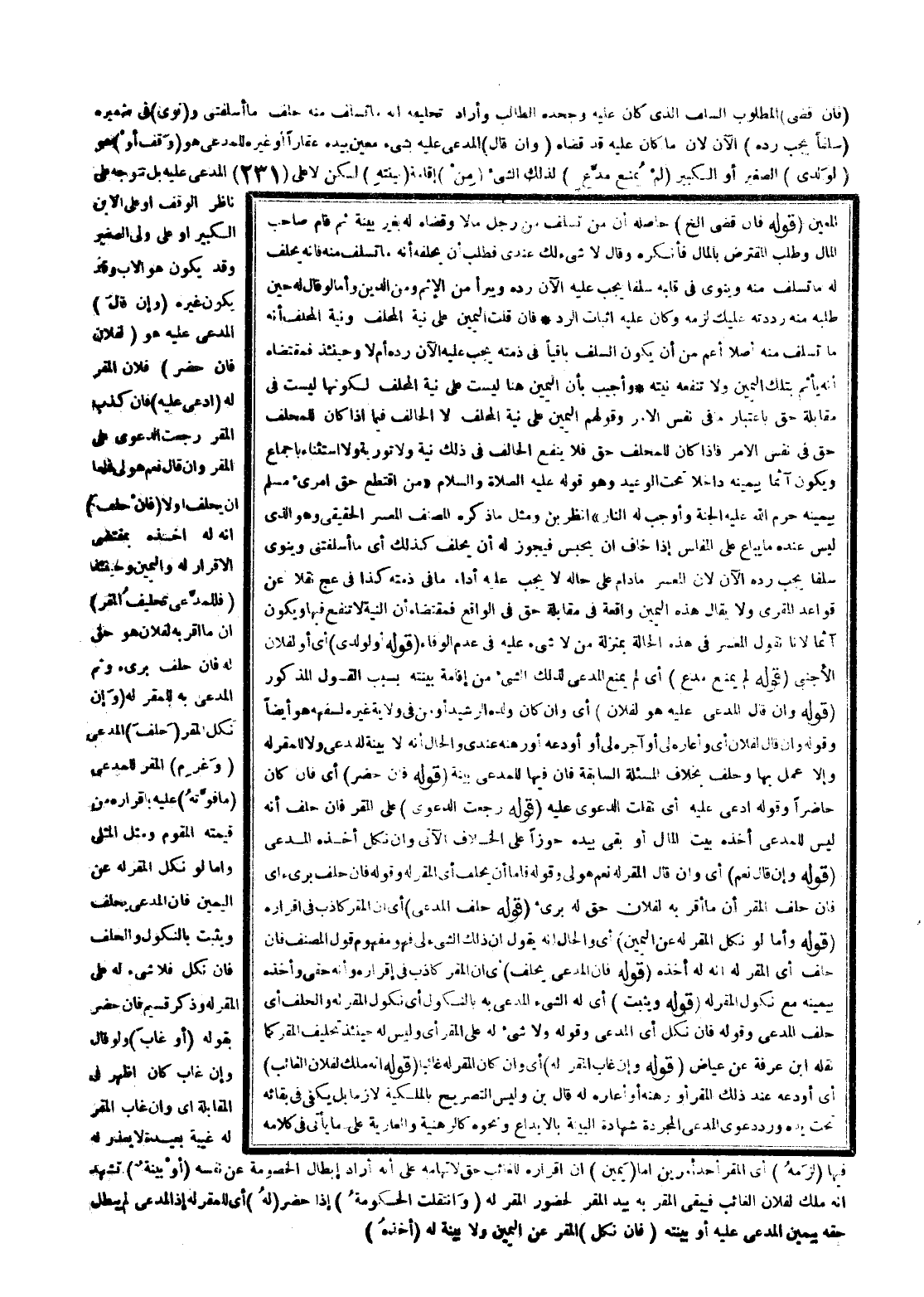 ـــــــــــــــــــــــــــــQالْمُعَيَّنِ (قَوْلُهُ فَإِنْ قَضَى إلَخْ) حَاصِلُهُ أَنَّ مَنْ تَسَلَّفَ مِنْ رَجُلٍ مَالًا وَقَضَاهُ لَهُ بِغَيْرِ بَيِّنَةٍ ثُمَّ قَامَ صَاحِبُ الْمَالِ وَطَلَبَ الْمُقْتَرِضَ بِالْمَالِ فَأَنْكَرَهُ وَقَالَ لَا شَيْءَ لَك عِنْدِي فَطَلَبَ أَنْ يُحَلِّفَهُ أَنَّهُ مَا تَسَلَّفَ مِنْهُ فَإِنَّهُ يَحْلِفُ لَهُ مَا تَسَلَّفَ مِنْهُ وَيَنْوِي فِي قَلْبِهِ سَلَفًا يَجِبُ عَلَيْهِ الْآنَ رَدُّهُ وَيَبْرَأُ مِنْ الْإِثْمِ وَمِنْ الدَّيْنِ وَأَمَّا لَوْ قَالَ لَهُ حِينَ طَلَبَهُ مِنْهُ رَدَدْته عَلَيْك لَزِمَهُ وَكَانَ عَلَيْهِ إثْبَاتُ الرَّدِّ، فَإِنْ قُلْت الْيَمِينُ عَلَى نِيَّةِ الْمُحَلِّفِ وَنِيَّةُ الْمُحَلِّفِ أَنَّهُ مَا تَسَلَّفَ مِنْهُ أَصْلًا أَعَمُّ مِنْ أَنْ يَكُونَ السَّلَفُ بَاقِيًا فِي ذِمَّتِهِ يَجِبُ عَلَيْهِ الْآنَ رَدُّهُ أَمْ لَا وَحِينَئِذٍ فَمُقْتَضَاهُ أَنَّهُ يَأْثَمُ بِتِلْكَ الْيَمِينِ وَلَا تَنْفَعُهُ نِيَّتُهُ وَأُجِيبَ بِأَنَّ الْيَمِينَ هُنَا لَيْسَتْ عَلَى نِيَّةِ الْمُحَلِّفِ لِكَوْنِهَا لَيْسَتْ فِي مُقَابَلَةِ حَقٍّ بِاعْتِبَارِ مَا فِي نَفْسِ الْأَمْرِ وَقَوْلُهُمْ الْيَمِينُ عَلَى نِيَّةِ الْمُحَلِّفِ لَا الْحَالِفِ فِيمَا إذَا كَانَ لِلْمُحَلِّفِ حَقٌّ فِي نَفْسِ الْأَمْرِ فَإِذَا كَانَ لِلْمُحَلِّفِ حَقٌّ فَلَا يَنْفَعُ الْحَالِفَ فِي ذَلِكَ نِيَّةٌ وَلَا تَوْرِيَةٌ وَلَا اسْتِثْنَاءٌ بِإِجْمَاعٍ وَيَكُونُ آثِمًا بِيَمِينِهِ دَاخِلًا تَحْتَ الْوَعِيدِ وَهُوَ قَوْلُهُ - عَلَيْهِ الصَّلَاةُ وَالسَّلَامُ - «مَنْ اقْتَطَعَ حَقَّ امْرِئٍ مُسْلِمٍ بِيَمِينِهِ حَرَّمَ اللَّهُ عَلَيْهِ الْجَنَّةَ وَأَوْجَبَ لَهُ النَّارَ» اُنْظُرْ بْن وَمِثْلُ مَا ذَكَرَهُ الْمُصَنِّفُ الْمُعْسِرُ الْحَقِيقِيُّ وَهُوَ الَّذِي لَيْسَ عِنْدَهُ مَا يُبَاعُ عَلَى الْمُفْلِسِ إذَا خَافَ أَنْ يُحْبَسَ فَيَجُوزُ لَهُ أَنْ يَحْلِفَ كَذَلِكَ أَيْ مَا أَسْلَفْتنِي وَيَنْوِي سَلَفًا يَجِبُ رَدُّهُ الْآنَ لِأَنَّ الْمُعْسِرَ مَا دَامَ عَلَى حَالِهِ لَا يَجِبُ عَلَيْهِ أَدَاءُ مَا فِي ذِمَّتِهِ كَذَا فِي عج نَقْلًا عَنْ قَوَاعِدِ الْمُقْرِي وَلَا يُقَالُ هَذِهِ الْيَمِينُ وَاقِعَةٌ فِي مُقَابَلَةِ حَقٍّ فِي الْوَاقِعِ فَمُقْتَضَاهُ أَنَّ النِّيَّةَ لَا تَنْفَعُ فِيهَا وَيَكُونُ آثِمًا لِأَنَّا نَقُولُ الْمُعْسِرُ فِي هَذِهِ الْحَالَةِ بِمَنْزِلَةِ مَنْ لَا شَيْءَ عَلَيْهِ فِي عَدَمِ الْوَفَاءِ