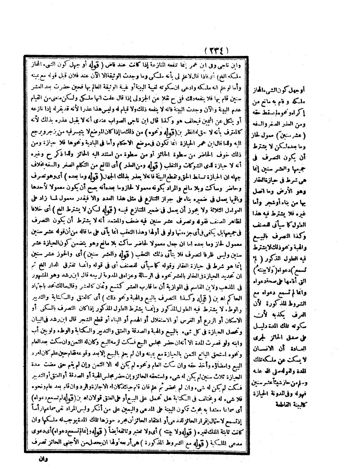 أَوْ جَهِلَ كَوْنَ الشَّيْءِ الْمُحَازِ مِلْكُهُ أَوْ قَامَ بِهِ مَانِعٌ مِنْ إكْرَاهٍ وَنَحْوِهِ لَمْ يَسْقُطْ حَقُّهُ وَمِنْ الْعُذْرِ الصِّغَرُ وَالسَّفَهُ (عَشْرَ سِنِينَ) مَعْمُولٌ لَحَازَ وَمَا بَعْدَهُ لَكِنْ لَا يُشْتَرَطُ أَنْ يَكُونَ التَّصَرُّفُ فِي جَمِيعِهَا وَالْعَشْرُ سِنِينَ إنَّمَا هِيَ شَرْطٌ فِي حِيَازَةِ الْعَقَارِ وَهُوَ الْأَرْضُ وَمَا اتَّصَلَ بِهَا مِنْ بِنَاءٍ أَوْ شَجَرٍ وَأَمَّا غَيْرُهُ فَلَا يُشْتَرَطُ فِيهِ هَذَا الطُّولُ كَمَا سَيَأْتِي لَلْمُصَنِّفِ وَكَذَا التَّصَرُّفُ بِالْبَيْعِ وَالْهِبَةِ وَنَحْوِ ذَلِكَ لَا يُشْتَرَطُ فِيهِ الطُّولُ الْمَذْكُورُ (لَمْ تُسْمَعْ) دَعْوَاهُ (وَلَا بَيِّنَتُهُ) الَّتِي أَقَامَهَا عَلَى صِحَّةِ دَعْوَاهُ وَإِنَّمَا لَمْ تُسْمَعْ دَعْوَاهُ مَعَ الشُّرُوطِ الْمَذْكُورَةِ لِأَنَّ الْعُرْفَ يُكَذِّبُهُ لِأَنَّ سُكُوتَهُ تِلْكَ الْمُدَّةَ دَلِيلٌ عَلَى صِدْقِ الْحَائِزِ لِجَرْيِ الْعَادَةِ أَنَّ الْإِنْسَانَ لَا يَسْكُتُ عَنْ مِلْكِهِ تِلْكَ الْمُدَّةَ وَلِقَوْلِهِ - صَلَّى اللَّهُ عَلَيْهِ وَسَلَّمَ - «مَنْ حَازَ شَيْئًا عَشْرَ سِنِينَ فَهُوَ لَهُ» وَفِي الْمُدَوَّنَةِ الْحِيَازَةُ كَالْبَيِّنَةِ الْقَاطِعَةِ