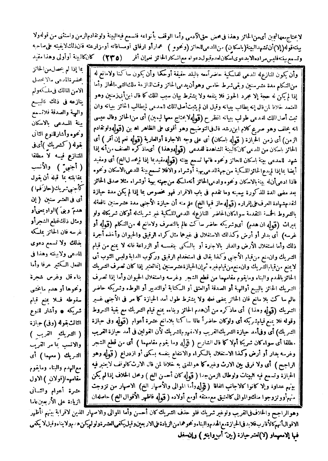 وَأَشَارَ لِلنَّوْعِ الثَّالِثِ بِقَوْلِهِ (وَفِي) حِيَازَةِ (الشَّرِيكِ الْقَرِيبِ) وَالْأَنْسَبُ بِمَا مَرَّ الْقَرِيبُ الشَّرِيكُ (مَعَهُمَا) أَيْ مَعَ الْهَدْمِ وَالْبِنَاءِ وَمَا يَقُومُ مَقَامَهُمَا (قَوْلَانِ) الْأَوَّلُ عَشَرَةُ أَعْوَامٍ وَالثَّانِي الزِّيَادَةُ عَلَى الْأَرْبَعِينَ عَامًا وَهُوَ الرَّاجِحُ وَالْخِلَافُ فِي الْقَرِيبِ وَلَوْ غَيْرَ شَرِيكٍ فَلَوْ حُذِفَ الشَّرِيكُ كَانَ أَحْسَنَ وَأَمَّا الْمَوَالِي وَالْأَصْهَارُ الَّذِينَ لَا قَرَابَةَ بَيْنَهُمْ فَأَظْهَرُ الْأَقْوَالِ أَنَّهُمْ كَالْأَقَارِبِ فَلَا بُدَّ فِي الْحِيَازَةِ مَعَ الْهَدْمِ وَالْبِنَاءِ وَنَحْوِهِمَا مِنْ الزِّيَادَةِ عَلَى الْأَرْبَعِينَ وَقِيلَ يَكْفِي الْعَشَرَةُ وَلَوْ لَمْ يَكُنْ هَدْمٌ وَلَا بِنَاءٌ وَقِيلَ لَا يَكْفِي فِيهَا إلَّا مَعَهُمَا
