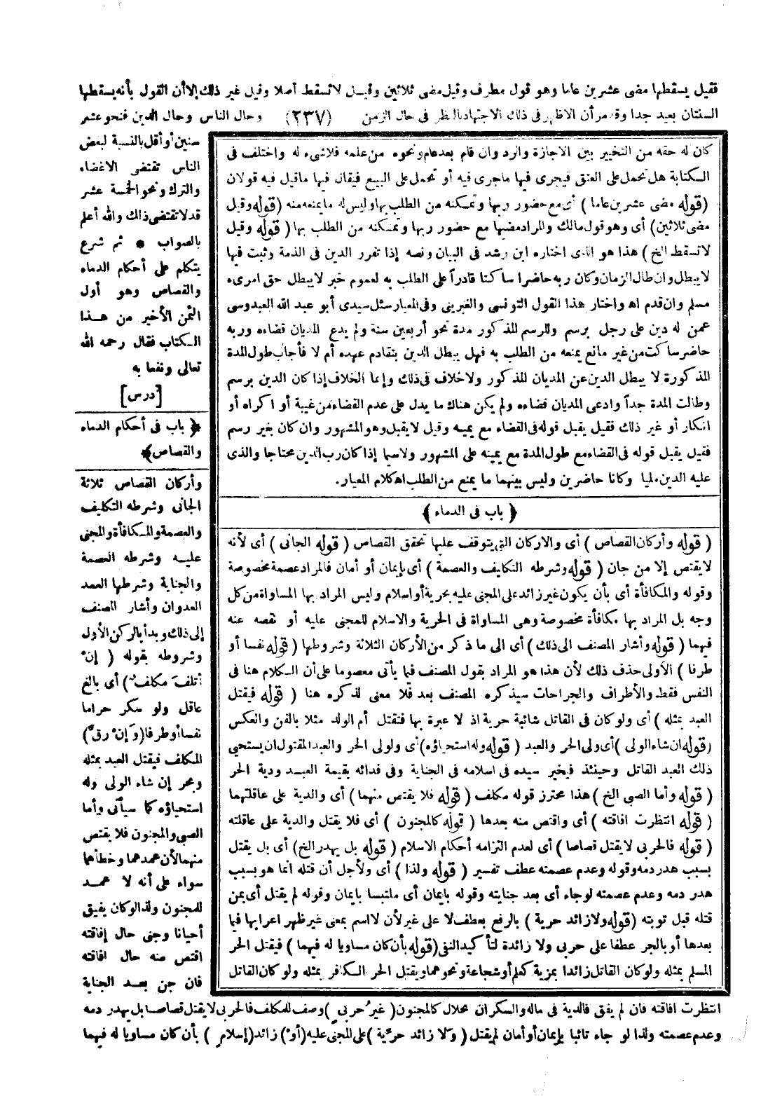 [دَرْسٌ] (بَابٌ فِي أَحْكَامِ الدِّمَاءِ، وَالْقِصَاصِ) وَأَرْكَانُ الْقِصَاصِ ثَلَاثَةٌ الْجَانِي وَشَرْطُهُ التَّكْلِيفُ، وَالْعِصْمَةُ، وَالْمُكَافَأَةُ، وَالْمَجْنِيُّ عَلَيْهِ وَشَرْطُهُ الْعِصْمَةُ، وَالْجِنَايَةُ وَشَرْطُهَا الْعَمْدُ، وَالْعُدْوَانُ وَأَشَارَ الْمُصَنِّفُ إلَى ذَلِكَ وَبَدَأَ بِالرُّكْنِ الْأَوَّلِ وَشُرُوطِهِ بِقَوْلِهِ (إنْ) (أَتْلَفَ مُكَلَّفٌ) أَيْ بَالِغٌ عَاقِلٌ وَلَوْ سَكِرَ حَرَامًا نَفْسًا، أَوْ طَرَفًا (وَإِنْ رَقَّ) الْمُكَلَّفُ فَيُقْتَلُ الْعَبْدُ بِمِثْلِهِ وَبِحُرٍّ إنْ شَاءَ الْوَلِيُّ وَلَهُ اسْتِحْيَاؤُهُ كَمَا سَيَأْتِي وَأَمَّا الصَّبِيُّ، وَالْمَجْنُونُ فَلَا يُقْتَصُّ مِنْهُمَا؛ لِأَنَّ عَمْدَهُمَا وَخَطَأَهُمَا سَوَاءٌ عَلَى أَنَّهُ لَا عَمْدَ لِلْمَجْنُونِ وَلِذَا لَوْ كَانَ يُفِيقُ أَحْيَانَا وَجَنَى حَالَ إفَاقَتِهِ اُقْتُصَّ مِنْهُ حَالَ إفَاقَتِهِ فَإِنْ جُنَّ بَعْدَ الْجِنَايَةِ اُنْتُظِرَتْ إفَاقَتُهُ فَإِنْ لَمْ يُفِقْ، فَالدِّيَةُ فِي مَالِهِ، وَالسَّكْرَانُ بِحَلَالٍ كَالْمَجْنُونِ (غَيْرُ حَرْبِيٍّ) وَصْفٌ لِلْمُكَلَّفِ، فَالْحَرْبِيُّ لَا يُقْتَلُ قِصَاصًا بَلْ يُهْدَرُ دَمُهُ وَعَدَمُ عِصْمَتِهِ وَلِذَا لَوْ جَاءَ تَائِبًا بِإِيمَانٍ، أَوْ أَمَانٍ لَمْ يُقْتَلْ (وَلَا زَائِدُ حُرِّيَّةٍ) عَلَى الْمَجْنِيِّ عَلَيْهِ (أَوْ) زَائِدُ (إسْلَامٍ) بِأَنْ كَانَ مُسَاوِيًا لَهُ فِيهِمَا