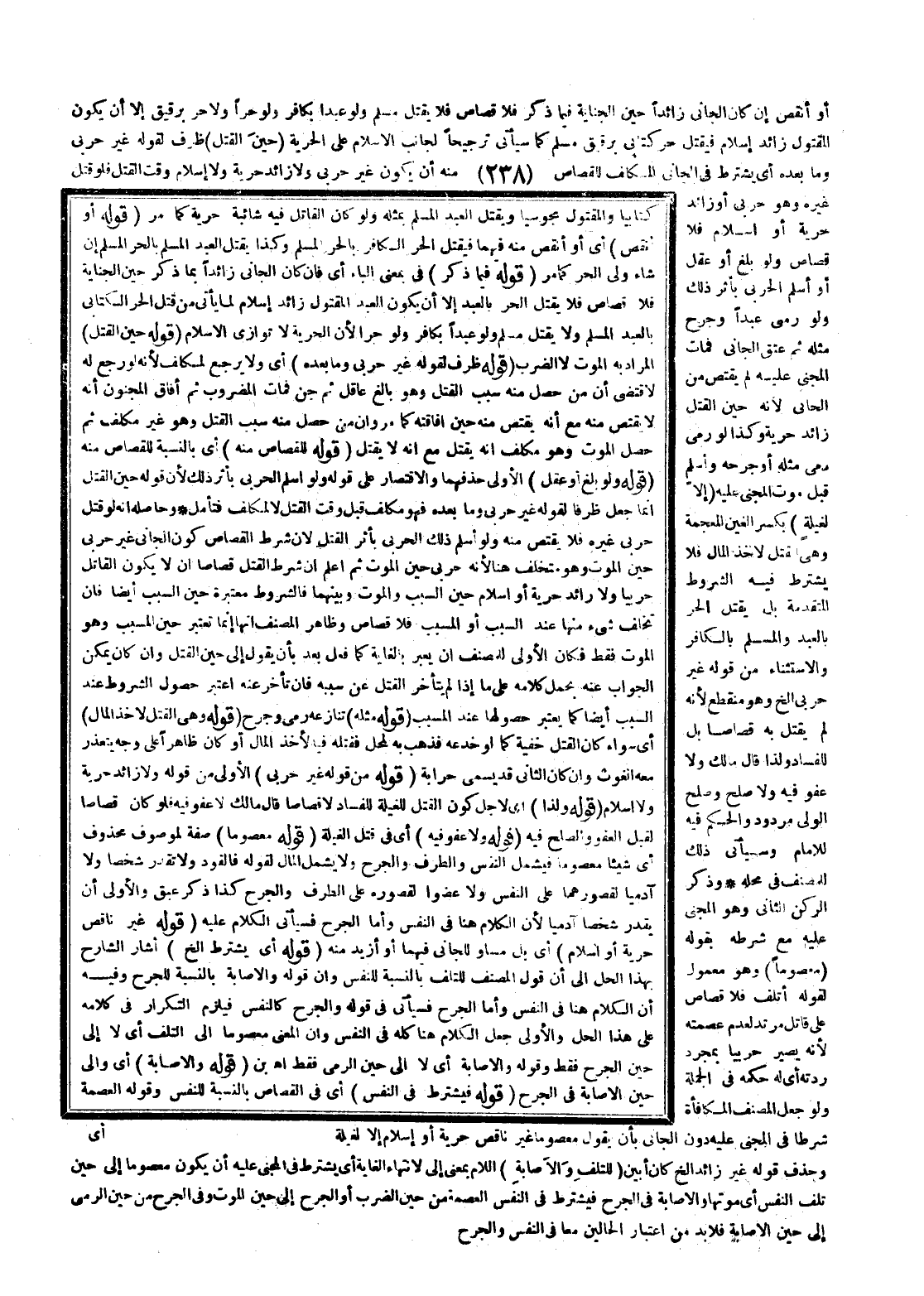 ـــــــــــــــــــــــــــــQكِتَابِيًّا، وَالْمَقْتُولُ مَجُوسِيًّا وَيُقْتَلُ الْعَبْدُ الْمُسْلِمُ بِمِثْلِهِ وَلَوْ كَانَ الْقَاتِلُ فِيهِ شَائِبَةُ حُرِّيَّةٍ كَمَا مَرَّ (قَوْلُهُ: أَوْ أَنْقَصَ) أَيْ، أَوْ أَنْقَصَ مِنْهُ فِيهِمَا فَيُقْتَلُ الْحُرُّ الْكَافِرُ بِالْحُرِّ الْمُسْلِمِ، وَكَذَا يُقْتَلُ الْعَبْدُ الْمُسْلِمُ بِالْحُرِّ الْمُسْلِمِ إنْ شَاءَ وَلِيُّ الْحُرِّ كَمَا مَرَّ (قَوْلُهُ: فِيمَا ذُكِرَ) فِي بِمَعْنَى الْبَاءِ أَيْ فَإِنْ كَانَ الْجَانِي زَائِدًا بِمَا ذُكِرَ حِينَ الْجِنَايَةِ فَلَا قِصَاصَ فَلَا يُقْتَلُ الْحُرُّ بِالْعَبْدِ إلَّا أَنْ يَكُونَ الْعَبْدُ الْمَقْتُولُ زَائِدَ إسْلَامٍ لِمَا يَأْتِي مِنْ قَتْلِ الْحُرِّ الْكِتَابِيِّ بِالْعَبْدِ الْمُسْلِمِ وَلَا يُقْتَلُ مُسْلِمٌ وَلَوْ عَبْدًا بِكَافِرٍ وَلَوْ حُرًّا؛ لِأَنَّ الْحُرِّيَّةَ لَا تُوَازِي الْإِسْلَامَ (قَوْلُهُ حِينَ الْقَتْلِ) الْمُرَادُ بِهِ الْمَوْتُ لَا الضَّرْبُ (قَوْلُهُ: ظَرْفٌ لِقَوْلِهِ غَيْرَ حَرْبِيٍّ وَمَا بَعْدَهُ) أَيْ وَلَا يَرْجِعُ لِمُكَلَّفٍ؛ لِأَنَّهُ لَوْ رَجَعَ لَهُ لَاقْتَضَى أَنَّ مَنْ حَصَلَ مِنْهُ سَبَبُ الْقَتْلِ، وَهُوَ بَالِغٌ عَاقِلٌ، ثُمَّ جُنَّ فَمَاتَ الْمَضْرُوبُ، ثُمَّ أَفَاقَ الْمَجْنُونُ أَنَّهُ لَا يُقْتَصُّ مِنْهُ مَعَ أَنَّهُ يُقْتَصُّ مِنْهُ حِينَ إفَاقَتِهِ كَمَا مَرَّ وَأَنَّ مَنْ حَصَلَ مِنْهُ سَبَبُ الْقَتْلِ، وَهُوَ غَيْرُ مُكَلَّفٍ، ثُمَّ حَصَلَ الْمَوْتُ، وَهُوَ مُكَلَّفٌ أَنَّهُ يُقْتَلُ مَعَ أَنَّهُ لَا يُقْتَلُ (قَوْلُهُ: لِلْقِصَاصِ مِنْهُ) أَيْ بِالنِّسْبَةِ لِلْقِصَاصِ مِنْهُ (قَوْلُهُ: وَلَوْ بَلَغَ، أَوْ عَقَلَ) الْأَوْلَى حَذْفُهُمَا، وَالِاقْتِصَارُ عَلَى قَوْلِهِ وَلَوْ أَسْلَمَ الْحَرْبِيُّ بِأَثَرِ ذَلِكَ؛ لِأَنَّ قَوْلَهُ حِينَ الْقَتْلِ إنَّمَا جُعِلَ ظَرْفًا لِقَوْلِهِ غَيْرُ حَرْبِيٍّ وَمَا بَعْدَهُ، فَهُوَ مُكَلَّفٌ قَبْلَ وَقْتِ الْقَتْلِ لَا لِمُكَلَّفٍ فَتَأَمَّلْ.