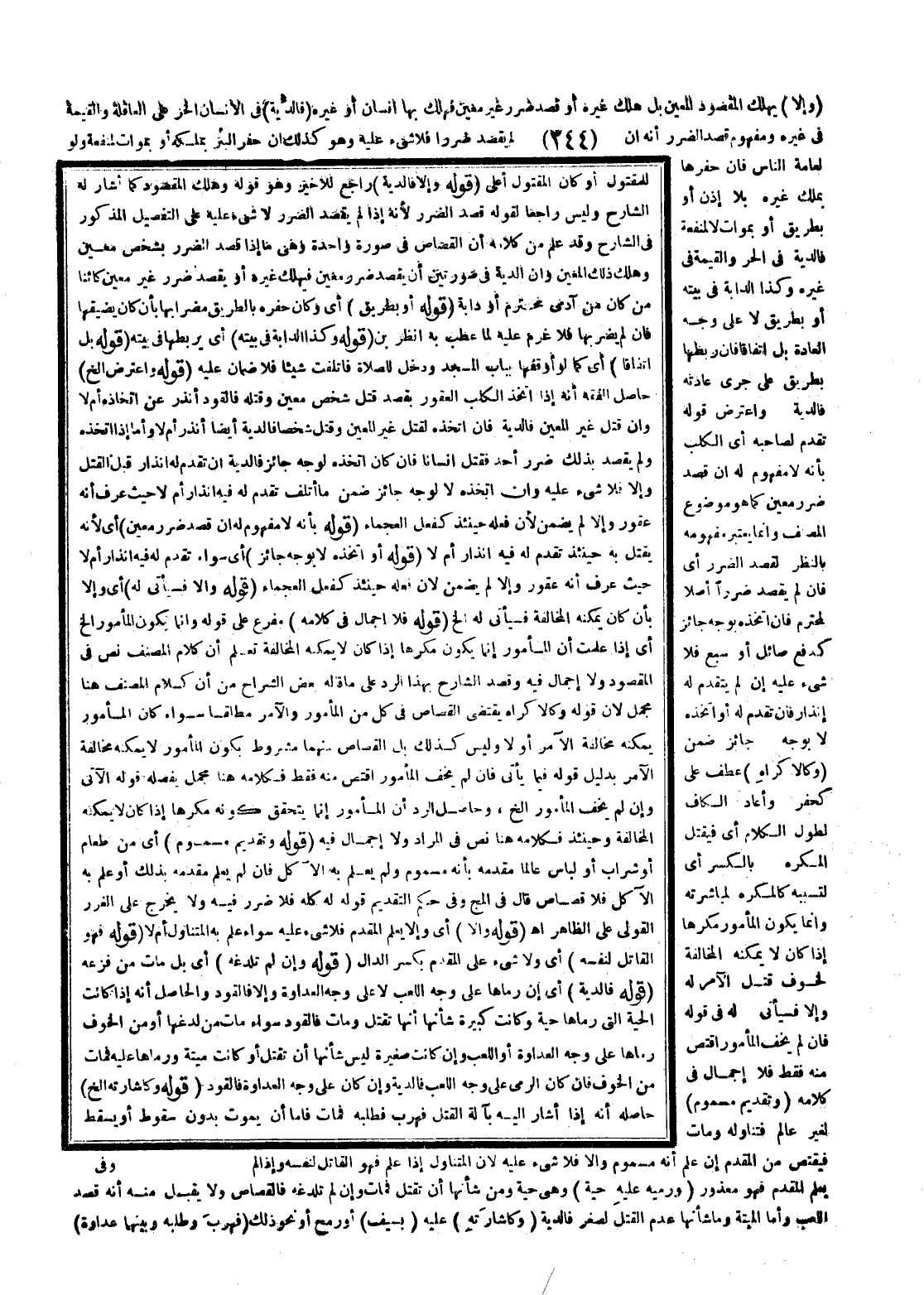 (وَإِلَّا) يَهْلِكُ الْمَقْصُودُ الْمُعَيَّنُ بَلْ هَلَكَ غَيْرُهُ، أَوْ قَصَدَ ضَرَرَ غَيْرِ مُعَيَّنٍ، فَهَلَكَ بِهَا إنْسَانٌ، أَوْ غَيْرُهُ (فَالدِّيَةُ) فِي الْإِنْسَانِ الْحُرِّ عَلَى الْعَاقِلَةِ، وَالْقِيمَةُ فِي غَيْرِهِ وَمَفْهُومُ قَصْدِ الضَّرَرِ أَنَّهُ إنْ لَمْ يَقْصِدْ ضَرَرًا فَلَا شَيْءَ عَلَيْهِ، وَهُوَ كَذَلِكَ إنْ حَفَرَ الْبِئْرَ بِمِلْكِهِ، أَوْ بِمَوَاتٍ لِمَنْفَعَةٍ وَلَوْ لِعَامَّةِ النَّاسِ فَإِنْ حَفَرَهَا بِمِلْكِ غَيْرِهِ بِلَا إذْنٍ، أَوْ بِطَرِيقٍ، أَوْ بِمَوَاتٍ لَا لِمَنْفَعَةٍ، فَالدِّيَةُ فِي الْحُرِّ، وَالْقِيمَةُ فِي غَيْرِهِ، وَكَذَا الدَّابَّةُ فِي بَيْتِهِ، أَوْ بِطَرِيقٍ لَا عَلَى وَجْهِ الْعَادَةِ بَلْ اتِّفَاقًا فَإِنْ رَبَطَهَا بِطَرِيقٍ عَلَى جَرْيِ عَادَتِهِ، فَالدِّيَةُ.