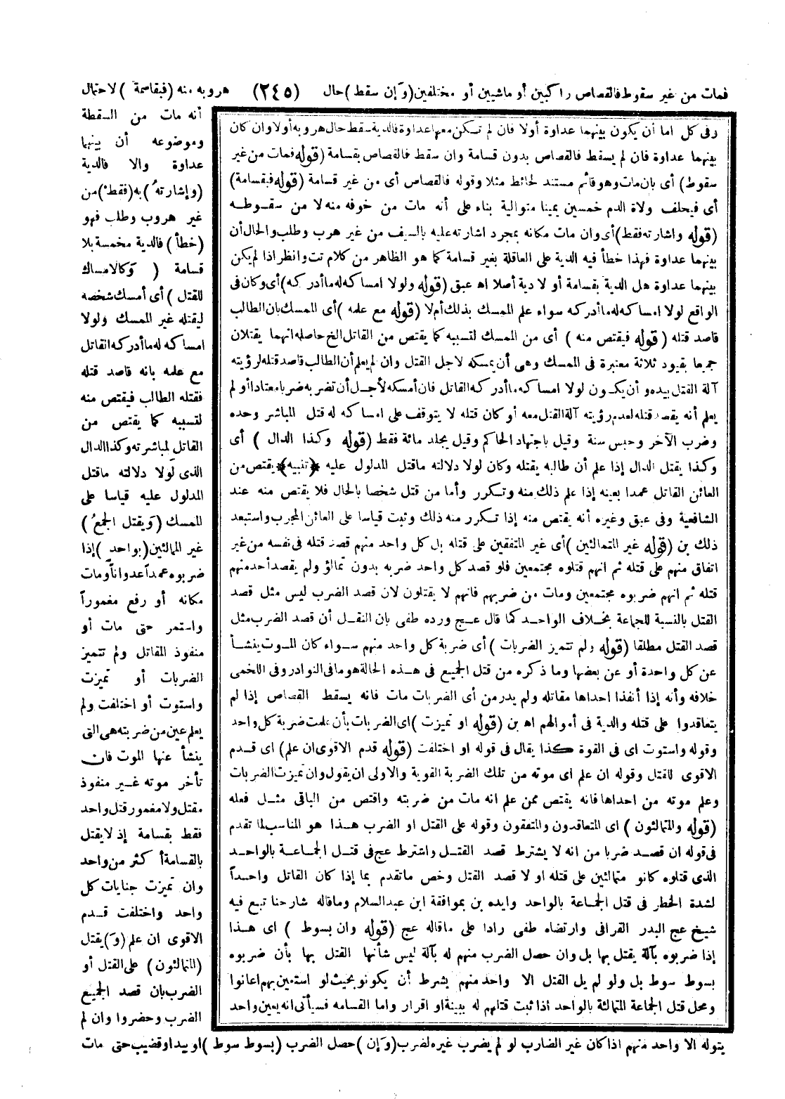 (قَوْلُهُ: غَيْرُ الْمُمَالِئِينَ) أَيْ غَيْرُ الْمُتَّفِقِينَ عَلَى قَتْلِهِ بَلْ كُلُّ وَاحِدٍ مِنْهُمْ قَصَدَ قَتْلَهُ فِي نَفْسِهِ مِنْ غَيْرِ اتِّفَاقٍ مِنْهُمْ عَلَى قَتْلِهِ، ثُمَّ أَنَّهُمْ قَتَلُوهُ مُجْتَمِعِينَ فَلَوْ قَصَدَ كُلُّ وَاحِدٍ ضَرْبَهُ بِدُونِ تَمَالُؤٍ وَلَمْ يَقْصِدْ أَحَدٌ مِنْهُمْ قَتْلَهُ، ثُمَّ أَنَّهُمْ ضَرَبُوهُ مُجْتَمِعِينَ وَمَاتَ مِنْ ضَرْبِهِمْ فَإِنَّهُمْ لَا يُقْتَلُونَ؛ لِأَنَّ قَصْدَ الضَّرْبِ لَيْسَ مِثْلَ قَصْدِ الْقَتْلِ بِالنِّسْبَةِ لِلْجَمَاعَةِ بِخِلَافِ الْوَاحِدِ كَمَا قَالَ عج وَرَدَّهُ طفى بِأَنَّ النَّقْلَ أَنَّ قَصْدَ الضَّرْبِ مِثْلُ قَصْدِ الْقَتْلِ مُطْلَقًا.