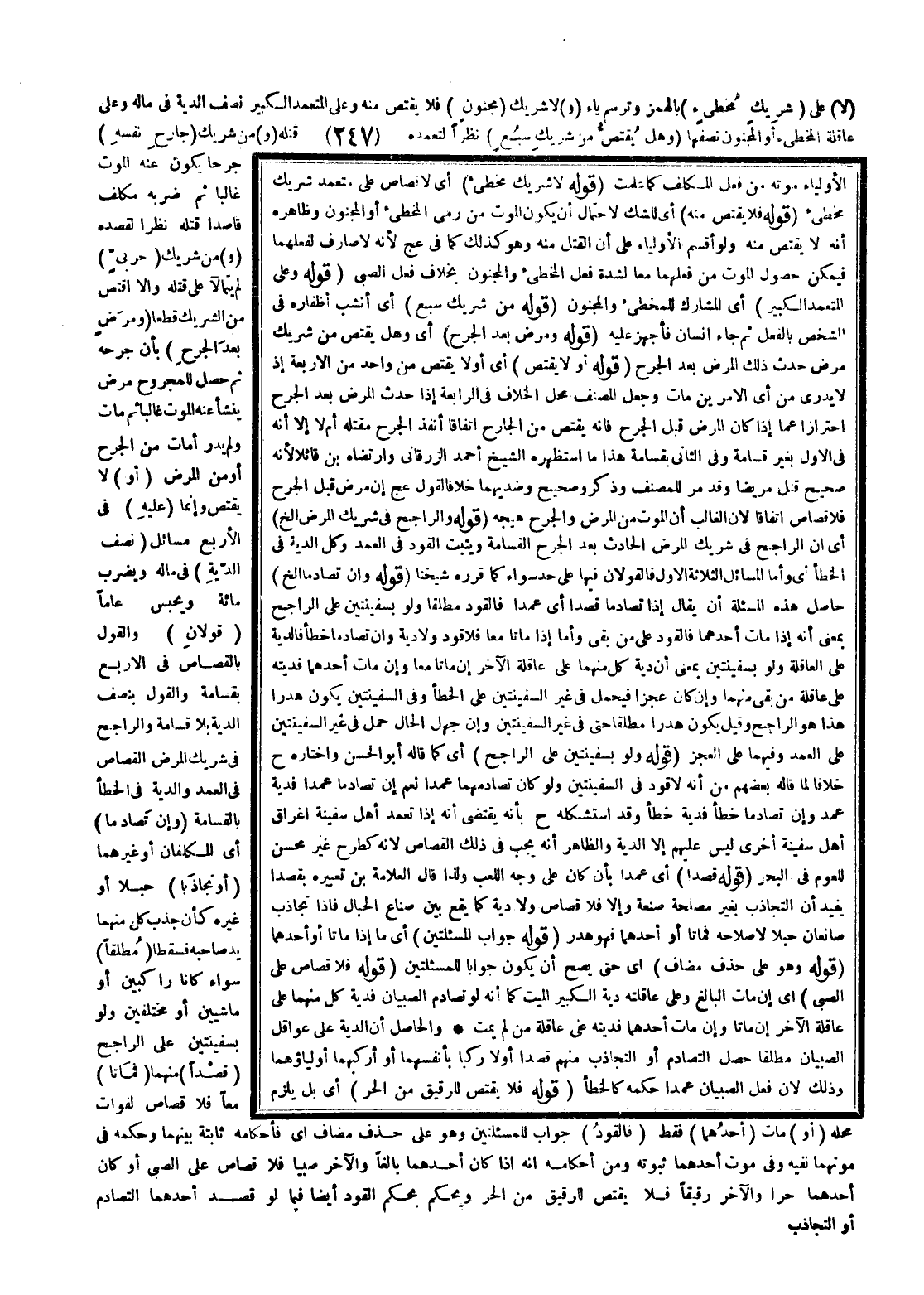 (لَا) عَلَى (شَرِيكِ مُخْطِئٍ) بِالْهَمْزِ وَتُرْسَمُ يَاءً (و) لَا شَرِيكِ (مَجْنُونٍ) فَلَا يُقْتَصُّ مِنْهُ وَعَلَى الْمُتَعَمِّدِ الْكَبِيرِ نِصْفُ الدِّيَةِ فِي مَالِهِ وَعَلَى عَاقِلَةِ الْمُخْطِئِ، أَوْ الْمَجْنُونِ نِصْفُهَا (وَهَلْ يُقْتَصُّ مِنْ شَرِيكِ سَبُعٍ) نَظَرًا لِتَعَمُّدِهِ قَتْلَهُ (و) مِنْ شَرِيكِ (جَارِحٍ نَفْسَهُ) جُرْحًا يَكُونُ عِنْدَ الْمَوْتِ غَالِبًا، ثُمَّ ضَرَبَهُ مُكَلَّفٌ قَاصِدًا قَتْلَهُ نَظَرًا لِقَصْدِهِ (و) مِنْ شَرِيكِ (حَرْبِيٍّ) لَمْ يَتَمَالَآ عَلَى قَتْلِهِ، وَإِلَّا اُقْتُصَّ مِنْ الشَّرِيكِ قَطْعًا (وَمَرِضَ بَعْدَ الْجُرْحِ) بِأَنْ جَرَحَهُ، ثُمَّ حَصَلَ لِلْمَجْرُوحِ مَرَضٌ يَنْشَأُ عَنْهُ الْمَوْتُ غَالِبًا، ثُمَّ مَاتَ وَلَمْ يُدْرَ أَمَاتَ مِنْ الْجُرْحِ، أَوْ مِنْ الْمَرَضِ (أَوْ) لَا يُقْتَصُّ، وَإِنَّمَا (عَلَيْهِ) فِي الْأَرْبَعِ مَسَائِلَ (نِصْفُ الدِّيَةِ) فِي مَالِهِ وَيُضْرَبُ مِائَةً وَيُحْبَسُ عَامًا (قَوْلَانِ) ، وَالْقَوْلُ بِالْقِصَاصِ فِي الْأَرْبَعِ بِقَسَامَةٍ، وَالْقَوْلُ بِنِصْفِ الدِّيَةِ بِلَا قَسَامَةٍ، وَالرَّاجِحُ فِي شَرِيكِ الْمَرَضِ الْقِصَاصُ فِي الْعَمْدِ، وَالدِّيَةُ فِي الْخَطَإِ بِالْقَسَامَةِ (وَإِنْ) (تَصَادَمَا) أَيْ الْمُكَلَّفَانِ، أَوْ غَيْرُهُمَا (أَوْ تَجَاذَبَا) حَبْلًا، أَوْ غَيْرَهُ كَأَنْ جَذَبَ كُلٌّ مِنْهُمَا يَدَ صَاحِبِهِ فَسَقَطَا (مُطْلَقًا) سَوَاءٌ كَانَا رَاكِبَيْنِ، أَوْ مَاشِيَيْنِ، أَوْ مُخْتَلِفَيْنِ وَلَوْ بِسَفِينَتَيْنِ عَلَى الرَّاجِحِ (قَصْدًا) مِنْهُمَا (فَمَاتَا) مَعًا فَلَا قِصَاصَ لِفَوَاتِ مَحَلِّهِ (أَوْ) مَاتَ (أَحَدُهُمَا) فَقَطْ (فَالْقَوَدُ) جَوَابٌ لِلْمَسْأَلَتَيْنِ، وَهُوَ عَلَى حَذْفِ مُضَافٍ أَيْ فَأَحْكَامُهُ ثَابِتَةٌ بَيْنَهُمَا وَحُكْمُهُ فِي مَوْتِهِمَا نَفْيُهُ وَفِي مَوْتِ أَحَدِهِمَا ثُبُوتُهُ وَمِنْ أَحْكَامِهِ أَنَّهُ إذَا كَانَ أَحَدُهُمَا بَالِغًا، وَالْآخَرُ صَبِيًّا فَلَا قِصَاصَ عَلَى الصَّبِيِّ، أَوْ كَانَ أَحَدُهُمَا حُرًّا، وَالْآخَرُ رَقِيقًا فَلَا يُقْتَصُّ لِلرَّقِيقِ مِنْ الْحُرِّ وَيُحْكَمُ بِحُكْمِ الْقَوَدِ أَيْضًا فِيمَا لَوْ قَصَدَ أَحَدُهُمَا التَّصَادُمَ، أَوْ التَّجَاذُبَ
