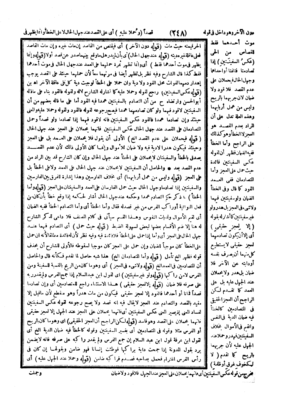 (قَوْلُهُ وَأَمَّا الْمُتَصَادِمَانِ إلَخْ) هَذَا شِبْهُ حَاصِلٍ لِمَا تَقَدَّمَ فَكَأَنَّهُ قَالَ، وَالْحَاصِلُ أَنَّ الْمُتَصَادِمَيْنِ فِي الْعَمْدِ إلَخْ (قَوْلُهُ: وَلَا شَيْءَ فِي الْعَجْزِ) أَيْ، وَهُوَ مَا كَانَ مِنْ الرِّيحِ بِالنِّسْبَةِ لِلسَّفِينَةِ وَمِنْ الْفَرَسِ لَا مِنْ رَاكِبِهَا (قَوْلُهُ: وَلَوْ غَيْرَ سَفِينَتَيْنِ) أَيْ لِقَوْلِ ابْنِ عَبْدِ السَّلَامِ إذَا جَمَحَ الْفَرَسُ وَلَمْ يَقْدِرْ رَبُّهُ عَلَى صَرْفِهِ فَلَا ضَمَانَ (قَوْلُهُ إلَّا لِعَجْزٍ حَقِيقِيٍّ) هَذَا الِاسْتِثْنَاءُ رَاجِعٌ لِلْمُتَصَادَمَيْنِ أَيْ، وَإِنْ تَصَادَمَا قَصْدًا فَمَاتَا، أَوْ أَحَدُهُمَا، فَالْقَوَدُ إلَّا لِعَجْزٍ حَقِيقِيٍّ فَيَكُونُ مَنْ مَاتَ هَدَرًا، وَهُوَ مُنْقَطِعٌ؛ لِأَنَّ مَا قَبْلَ إلَّا مُقَيَّدٌ بِالْقَصْدِ، وَالتَّصَادُمِ عِنْدَ الْعَجْزِ لَا يُقَالُ فِيهِ أَنَّهُ قَصْدٌ وَلَا يَصِحُّ رُجُوعُهُ لِقَوْلِهِ عَكْسُ السَّفِينَتَيْنِ لِفَسَادِ الْمَعْنَى؛ إذْ يَصِيرُ الْمَعْنَى عَكْسَ السَّفِينَتَيْنِ أَيْ فَإِنَّهُمَا يُحْمَلَانِ عَلَى الْعَجْزِ عِنْدَ الْجَهْلِ إلَّا لِعَجْزٍ حَقِيقِيٍّ فَإِنَّهُمَا يُحْمَلَانِ عَلَى الْقَصْدِ، وَهُوَ فَاسِدٌ.