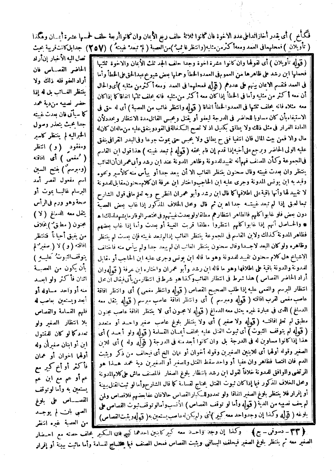 وَالْحَاصِلُ أَنَّهُمْ إذَا غَابُوا كُلُّهُمْ اُنْتُظِرُوا مُطْلَقًا قَرُبَتْ الْغَيْبَةُ، أَوْ بَعُدَتْ وَأَمَّا إذَا غَابَ بَعْضُهُمْ فَظَاهِرُ الْمُدَوَّنَةِ كَذَلِكَ وَلِابْنِ الْقَاسِمِ فِي الْمَجْمُوعَةِ يُنْتَظَرُ الْغَائِبُ إذَا لَمْ تَبْعُدْ غَيْبَتُهُ فَإِنْ بَعُدَتْ لَمْ يُنْتَظَرْ وَظَاهِرُهُ وَلَوْ كَانَ الْبُعْدُ لَا جِدًّا وَقَالَ سَحْنُونٌ يُنْتَظَرُ الْغَائِبُ إنْ لَمْ يَبْعُدْ جِدًّا وَلَمْ يُيْأَسْ مِنْهُ فَاخْتَلَفَ الْأَشْيَاخُ هَلْ كَلَامُ سَحْنُونٍ تَقْيِيدٌ لِلْمُدَوَّنَةِ، وَهُوَ مَا قَالَهُ ابْنُ يُونُسَ وَجَرَى عَلَيْهِ ابْنُ الْحَاجِبِ، أَوْ مُقَابِلٌ لِلْمُدَوَّنَةِ، وَالْمُدَوَّنَةِ بَاقِيَةٌ عَلَى إطْلَاقِهَا، وَهُوَ مَا قَالَهُ ابْنُ رُشْدٍ وَأَبُو عِمْرَانَ وَاخْتَارَهُ ابْنُ عَرَفَةَ (قَوْلُهُ: وَإِنْ أَرَادَ الْحَاضِرُ الْقِصَاصَ) هَذَا شَرْطٌ فِي انْتِظَارِ الْغَائِبِ، وَكَذَا هُوَ شَرْطٌ فِي انْتِظَارِ مَنْ يَأْتِي فَيُقَالُ إنَّ مَحَلَّ انْتِظَارِ الْمُبَرْسَمِ، وَالْمُغْمَى عَلَيْهِ إذَا طَلَبَ الصَّحِيحُ الْقِصَاصَ (قَوْلُهُ: وَانْتُظِرَ مُغْمًى) أَيْ وَانْتُظِرَ إفَاقَةُ عَاصِبٍ مُغْمَى لِقُرْبِ إفَاقَتِهِ (قَوْلُهُ: وَمُبَرْسَمٌ) أَيْ وَانْتُظِرَ إفَاقَةُ عَاصِبٍ مُبَرْسَمٍ (قَوْلُهُ يَثْقُلُ مَعَهُ الدِّمَاغُ) الَّذِي فِي عِبَارَةِ غَيْرِهِ يَعْتَلُّ مَعَهُ الدِّمَاغُ.