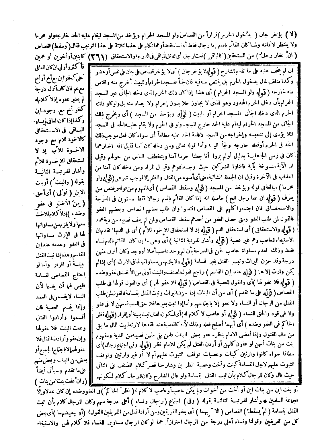 وَقِيلَ الْمُرَادُ {وَمَنْ دَخَلَهُ كَانَ آمِنًا} [آل عمران: 97] مِنْ الْعَذَابِ فِي الْآخِرَةِ وَقِيلَ أَنَّ الْجُمْلَةَ إنْشَائِيَّةٌ مَعْنَى أَيْ أَمَّنُوهُ مِنْ الْقَتْلِ، وَالظُّلْمِ إلَّا لِمُوجِبٍ شَرْعِيٍّ (قَوْلُهُ: وَلَوْ مُحْرِمًا) مُبَالَغَةٌ فِي قَوْلِهِ وَيُؤْخَذُ مِنْ الْمَسْجِدِ (قَوْلُهُ: وَسَقَطَ الْقِصَاصُ) أَيْ الْمَفْهُومُ مِنْ قَوْلِهِ وَيَقْتَصُّ مَنْ يَعْرِفُ (قَوْلُهُ: إنْ عَفَا رَجُلٌ إلَخْ) حَاصِلُهُ أَنَّهُ إذَا كَانَ الْقَائِمُ بِالدَّمِ رِجَالًا فَقَطْ مُسْتَوِينَ فِي الدَّرَجَةِ، وَالِاسْتِحْقَاقِ فَإِنْ اجْتَمَعُوا كُلُّهُمْ عَلَى الْقِصَاصِ اقْتَصُّوا، وَإِنْ طَلَبَ بَعْضُهُمْ الْقِصَاصَ وَبَعْضُهُمْ الْعَفْوَ، فَالْقَوْلُ لِمَنْ طَلَبَ الْعَفْوَ وَمَتَى حَصَلَ الْعَفْوُ مِنْ أَحَدِهِمْ سَقَطَ الْقِصَاصُ وَلِمَنْ لَمْ يَعْفُ نَصِيبُهُ مِنْ دِيَةِ عَمْدٍ (قَوْلُهُ: وَالِاسْتِحْقَاقِ) أَيْ اسْتِحْقَاقِ الدَّمِ (قَوْلُهُ: إذْ لَا اسْتِحْقَاقَ لِلْإِخْوَةِ لِلْأُمِّ) أَيْ فِي الدَّمِ لِمَا تَقَدَّمَ أَنَّ الِاسْتِيفَاءَ لِلْعَاصِبِ، وَهُمْ غَيْرُ عَصَبَةٍ (قَوْلُهُ: وَأَشَارَ لِلْمَرْتَبَةِ الثَّانِيَةِ) أَيْ، وَهِيَ مَا إذَا كَانَ الْقَائِمُ بِالدَّمِ نِسَاءً فَقَطْ وَذَلِكَ لِعَدَمِ مُسَاوَاةِ عَاصِبٍ لَهُنَّ فِي الدَّرَجَةِ بِأَنْ لَمْ يُوجَدْ عَاصِبٌ أَصْلًا، أَوْ وُجِدَ وَكَانَ أَنْزَلَ مِنْهُنَّ دَرَجَةً وَقَدْ حُزْنَ الْمِيرَاثَ وَثَبَتَ الْقَتْلُ بِغَيْرِ قَسَامَةٍ.