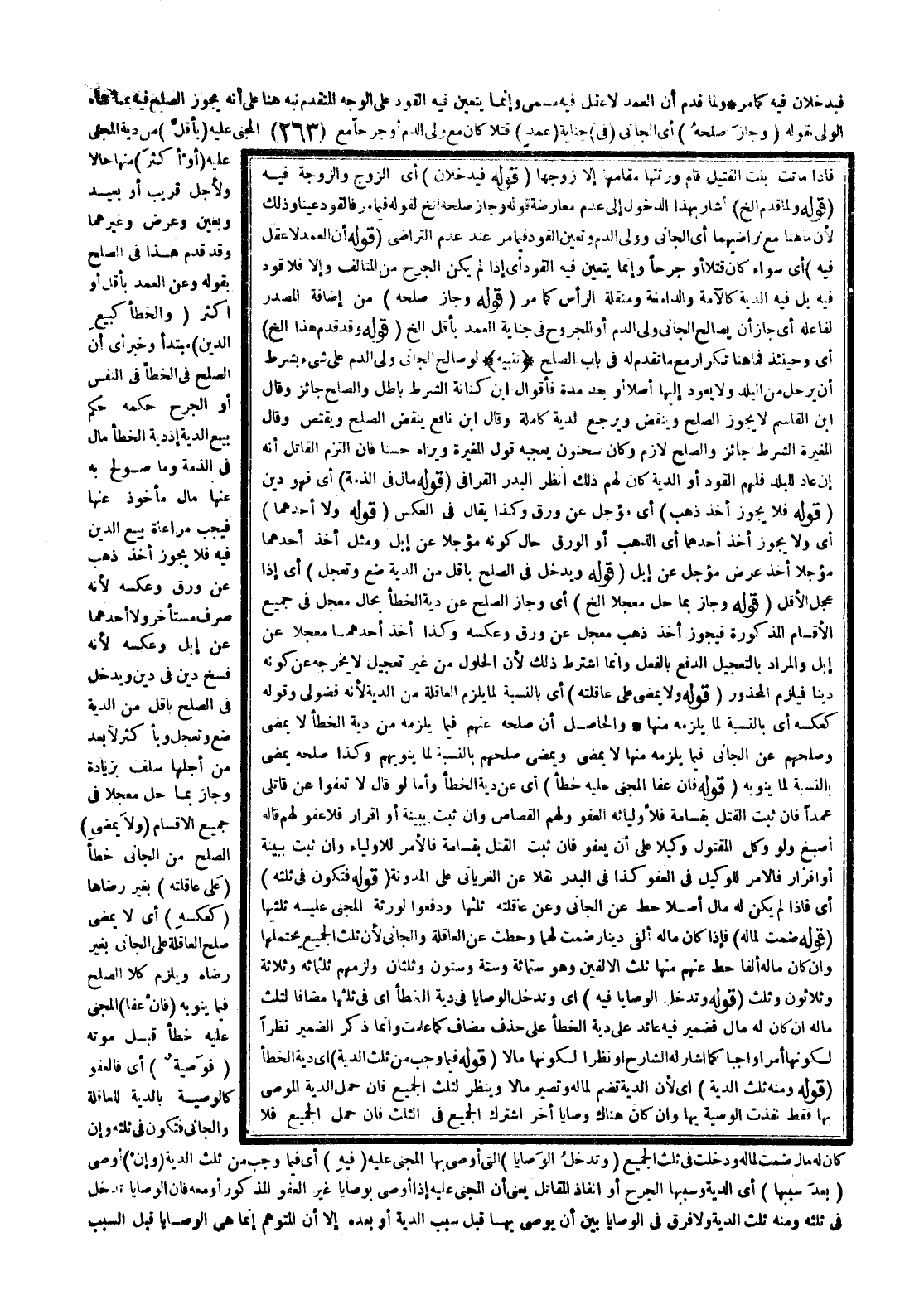 وَلَمَّا قَدَّمَ أَنَّ الْعَمْدَ لَا عَقْلَ فِيهِ مُسَمًّى، وَإِنَّمَا يَتَعَيَّنُ فِيهِ الْقَوَدُ عَلَى الْوَجْهِ الْمُتَقَدِّمِ نَبَّهَ هُنَا عَلَى أَنَّهُ يَجُوزُ الصُّلْحُ فِيهِ بِمَا شَاءَ الْوَلِيُّ بِقَوْلِهِ (وَجَازَ صُلْحُهُ) أَيْ الْجَانِي (فِي) جِنَايَةِ (عَمْدٍ) قَتْلًا كَانَ مَعَ وَلِيِّ الدَّمِ، أَوْ جُرْحًا مَعَ الْمَجْنِيِّ عَلَيْهِ (بِأَقَلَّ) مِنْ دِيَةِ الْمَجْنِيِّ عَلَيْهِ (أَوْ أَكْثَرَ) مِنْهَا حَالًّا وَلِأَجَلٍ قَرِيبٍ، أَوْ بَعِيدٍ وَبِعَيْنٍ وَعَرْضٍ وَغَيْرِهِمَا وَقَدْ قَدَّمَ هَذَا فِي الصُّلْحِ بِقَوْلِهِ، وَعَنْ الْعَمْدِ بِأَقَلَّ، أَوْ أَكْثَرَ (وَالْخَطَأُ كَبَيْعِ الدَّيْنِ) مُبْتَدَأٌ وَخَبَرٌ أَيْ أَنَّ الصُّلْحَ فِي الْخَطَإِ فِي النَّفْسِ، أَوْ الْجُرْحِ حُكْمُهُ حُكْمُ بَيْعِ الدِّيَةِ؛ إذْ دِيَةُ الْخَطَإِ مَالٌ فِي الذِّمَّةِ وَمَا صُولِحَ بِهِ عَنْهَا مَالٌ مَأْخُوذٌ عَنْهَا فَيَجِبُ مُرَاعَاةُ بَيْعِ الدَّيْنِ فِيهِ فَلَا يَجُوزُ أَخْذُ ذَهَبٍ عَنْ وَرِقٍ وَعَكْسُهُ؛ لِأَنَّهُ صَرْفٌ مُسْتَأْخِرٌ وَلَا أَحَدُهُمَا عَنْ إبِلٍ وَعَكْسُهُ؛ لِأَنَّهُ فَسْخُ دَيْنٍ فِي دَيْنٍ وَيَدْخُلُ فِي الصُّلْحِ بِأَقَلَّ مِنْ الدِّيَةِ ضَعْ وَتَعَجَّلْ وَبِأَكْثَرَ لِأَبْعَدَ مِنْ أَجَلِهَا سَلَفٌ بِزِيَادَةٍ وَجَازَ بِمَا حَلَّ مُعَجَّلًا فِي جَمِيعِ الْأَقْسَامِ (وَلَا يَمْضِي) الصُّلْحُ مِنْ الْجَانِي خَطَأً (عَلَى عَاقِلَتِهِ) بِغَيْرِ رِضَاهَا (كَعَكْسِهِ) أَيْ لَا يَمْضِي صُلْحُ الْعَاقِلَةِ عَلَى الْجَانِي بِغَيْرِ رِضَاهُ وَيَلْزَمُ كُلًّا الصُّلْحُ فِيمَا يَنُوبُهُ (فَإِنْ) (عَفَا) الْمَجْنِيُّ عَلَيْهِ خَطَأً قَبْلَ مَوْتِهِ (فَوَصِيَّةٌ) أَيْ، فَالْعَفْوُ كَالْوَصِيَّةِ بِالدِّيَةِ لِلْعَاقِلَةِ وَالْجَانِي، فَتَكُونُ فِي ثُلُثِهِ، وَإِنْ كَانَ لَهُ مَالٌ ضُمَّتْ لِمَالِهِ وَدَخَلَتْ فِي ثُلُثِ الْجَمِيعِ (وَتَدْخُلُ الْوَصَايَا) الَّتِي، أَوْصَى بِهَا الْمَجْنِيُّ عَلَيْهِ (فِيهِ) أَيْ فِيمَا وَجَبَ مِنْ ثُلُثِ الدِّيَةِ (وَإِنْ) ، أَوْصَى (بَعْدَ سَبَبِهَا) أَيْ الدِّيَةِ وَسَبَبُهَا الْجُرْحُ، أَوْ إنْفَاذُ الْمَقَاتِلِ يَعْنِي أَنَّ الْمَجْنِيَّ عَلَيْهِ إذَا أَوْصَى بِوَصَايَا غَيْرِ الْعَفْوِ الْمَذْكُورِ أَوْ مَعَهُ، فَإِنَّ الْوَصَايَا تَدْخُلُ فِي ثُلُثِهِ وَمِنْهُ ثُلُثُ الدِّيَةِ، وَلَا فَرْقَ فِي الْوَصَايَا بَيْنَ أَنْ يُوصِيَ بِهَا قَبْلَ سَبَبِ الدِّيَةِ، أَوْ بَعْدَهُ إلَّا أَنَّ الْمُتَوَهَّمَ إنَّمَا هِيَ الْوَصَايَا قَبْلَ السَّبَبِ