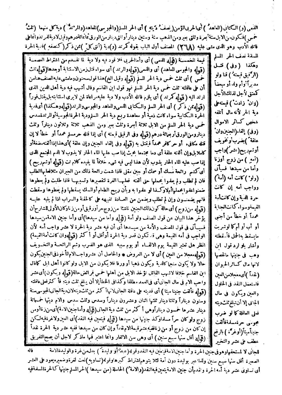 (قَوْلُهُ: وَهَكَذَا) أَيْ فِدْيَةُ الْحُرَّةِ الْكِتَابِيَّةِ سَوَاءٌ كَانَتْ ذِمِّيَّةً، أَوْ مُعَاهَدَةً رُبُعُ دِيَةِ الْحُرِّ الْمُسْلِمِ وَدِيَةُ الْحُرَّةِ الْمَجُوسِيَّةِ، أَوْ الْمُرْتَدَّةِ سُدُسُ خُمُسِ دِيَةِ الْحُرِّ الْمُسْلِمِ مِنْ الْإِبِلِ ثَلَاثَةُ أَبْعِرَةٍ وَثُلُثُ بَعِيرٍ وَمِنْ الذَّهَبِ ثَلَاثَةٌ وَثَلَاثُونَ دِينَارًا وَثُلُثُ دِينَارٍ وَمِنْ الْوَرِقِ أَرْبَعُمِائَةِ دِرْهَمٍ (قَوْلُهُ: وَفِي الرَّقِيقِ قِيمَتُهُ) أَيْ إذَا قَتَلَهُ حُرٌّ مُسْلِمٌ عَمْدًا، أَوْ خَطَأً لَا إنْ قَتَلَهُ مُكَافِئٌ، أَوْ حُرٌّ كَافِرٌ عَمْدًا فَيُقْتَلُ بِهِ.
