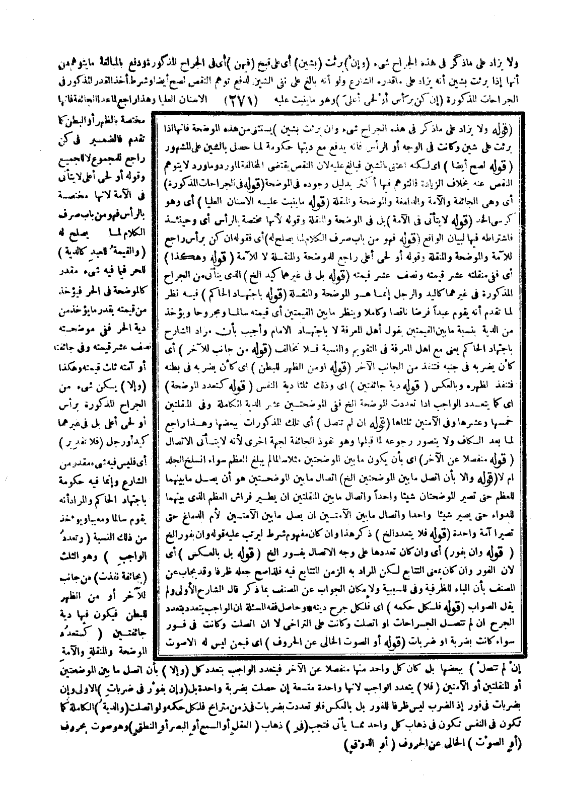 وَلَا يُزَادُ عَلَى مَا ذُكِرَ فِي هَذِهِ الْجِرَاحِ شَيْءٌ (وَإِنْ) بَرِئَتْ (بِشَيْنٍ) أَيْ عَلَى قُبْحٍ (فِيهِنَّ) أَيْ الْجِرَاحِ الْمَذْكُورَةِ وَدَفَعَ بِالْمُبَالَغَةِ مَا يُتَوَهَّمُ مِنْ أَنَّهَا إذَا بَرِئَتْ بِشَيْنٍ أَنَّهُ يُزَادُ عَلَى مَا قَدَّرَهُ الشَّارِعُ وَلَوْ أَنَّهُ بَالَغَ عَلَى نَفْيِ الشَّيْنِ لِدَفْعِ تَوَهُّمِ النَّقْصِ لَصَحَّ أَيْضًا وَشُرِطَ أَخْذُ الْقَدْرِ الْمَذْكُورِ فِي الْجِرَاحَاتِ الْمَذْكُورَةِ (إنْ كُنَّ بِرَأْسٍ، أَوْ لَحْيٍ أَعْلَى) ، وَهُوَ مَا يَنْبُتُ عَلَيْهِ الْأَسْنَانُ الْعُلْيَا، وَهَذَا رَاجِعٌ لِمَا عَدَا الْجَائِفَةَ فَإِنَّهَا مُخْتَصَّةٌ بِالظَّهْرِ، أَوْ الْبَطْنِ كَمَا تَقَدَّمَ، فَالضَّمِيرُ فِي كُنَّ رَاجِعٌ لِلْمَجْمُوعِ لَا لِلْجَمِيعِ وَقَوْلُهُ، أَوْ لَحْيٍ أَعْلَى لَا يَتَأَتَّى فِي الْآمَّةِ؛ لِأَنَّهَا مُخْتَصَّةٌ بِالرَّأْسِ، فَهُوَ مِنْ بَابِ صَرْفِ الْكَلَامِ لِمَا يَصْلُحُ لَهُ (وَالْقِيمَةُ لِلْعَبْدِ كَالدِّيَةِ) لِلْحُرِّ فِيمَا فِيهِ شَيْءٌ مُقَدَّرٌ كَالْمُوضِحَةِ فِي الْحُرِّ فَيُؤْخَذُ مِنْ قِيمَتِهِ بِقَدْرِ مَا يُؤْخَذُ مِنْ دِيَةِ الْحُرِّ فَفِي مُوضِحَتِهِ نِصْفُ عُشْرِ قِيمَتِهِ وَفِي جَائِفَتِهِ، أَوْ آمَّتِهِ ثُلُثُ قِيمَتِهِ، وَهَكَذَا (وَإِلَّا) يَكُنْ شَيْءٌ مِنْ الْجِرَاحِ الْمَذْكُورَةِ بِرَأْسٍ، أَوْ لَحْيٍ أَعْلَى بَلْ فِي غَيْرِهِمَا كَيَدٍ، أَوْ رِجْلٍ (فَلَا تَقْدِيرَ) أَيْ فَلَيْسَ فِيهِ شَيْءٌ مُقَدَّرٌ مِنْ الشَّارِعِ، وَإِنَّمَا فِيهِ حُكُومَةٌ بِاجْتِهَادِ الْحَاكِمِ، وَالْمُرَادُ أَنَّهُ يُقَوَّمُ سَالِمًا وَمَعِيبًا وَيُؤْخَذُ مِنْ ذَلِكَ النِّسْبَةُ (وَتَعَدُّدُ الْوَاجِبِ) ، وَهُوَ الثُّلُثُ (بِجَائِفَةٍ نَفَذَتْ) مِنْ جَانِبٍ لِلْآخَرِ، أَوْ مِنْ الظَّهْرِ لِلْبَطْنِ فَيَكُونُ فِيهَا دِيَةُ جَائِفَتَيْنِ (كَتَعَدُّدِ الْمُوضِحَةِ، وَالْمُنَقِّلَةِ، وَالْآمَّةِ إنْ لَمْ تَتَّصِلْ) بِبَعْضِهَا بَلْ كَانَ كُلُّ وَاحِدٍ مِنْهَا مُنْفَصِلًا عَنْ الْآخَرِ فَيَتَعَدَّدُ الْوَاجِبُ بِتَعَدُّدِ كُلٍّ (وَإِلَّا) بِأَنْ اتَّصَلَ مَا بَيْنَ الْمُوضِحَتَيْنِ، أَوْ الْمُنَقِّلَتَيْنِ، أَوْ الْآمَّتَيْنِ (فَلَا) يَتَعَدَّدُ الْوَاجِبُ؛ لِأَنَّهَا وَاحِدَةٌ مُتَّسَعَةٌ إنْ حَصَلَتْ بِضَرْبَةٍ وَاحِدَةٍ بَلْ (وَإِنْ بِفَوْرٍ فِي ضَرَبَاتٍ) الْأَوْلَى، وَإِنْ بِضَرَبَاتٍ فِي فَوْرٍ؛ إذْ الضَّرْبُ لَيْسَ ظَرْفًا لِلْفَوْرِ بَلْ بِالْعَكْسِ فَلَوْ تَعَدَّدَتْ بِضَرَبَاتٍ فِي زَمَنٍ مُتَرَاخٍ فَلِكُلٍّ حُكْمُهُ وَلَوْ اتَّصَلَتْ (وَالدِّيَةُ) الْكَامِلَةُ كَمَا تَكُونُ فِي النَّفْسِ تَكُونُ فِي ذَهَابِ كُلِّ وَاحِدٍ مِمَّا يَأْتِي فَتَجِبُ (فِي) ذَهَابِ (الْعَقْلِ، أَوْ السَّمْعِ، أَوْ الْبَصَرِ، أَوْ النُّطْقِ) ، وَهُوَ صَوْتٌ بِحُرُوفٍ (أَوْ الصَّوْتِ) الْخَالِي عَنْ الْحُرُوفِ (أَوْ الذَّوْقِ)