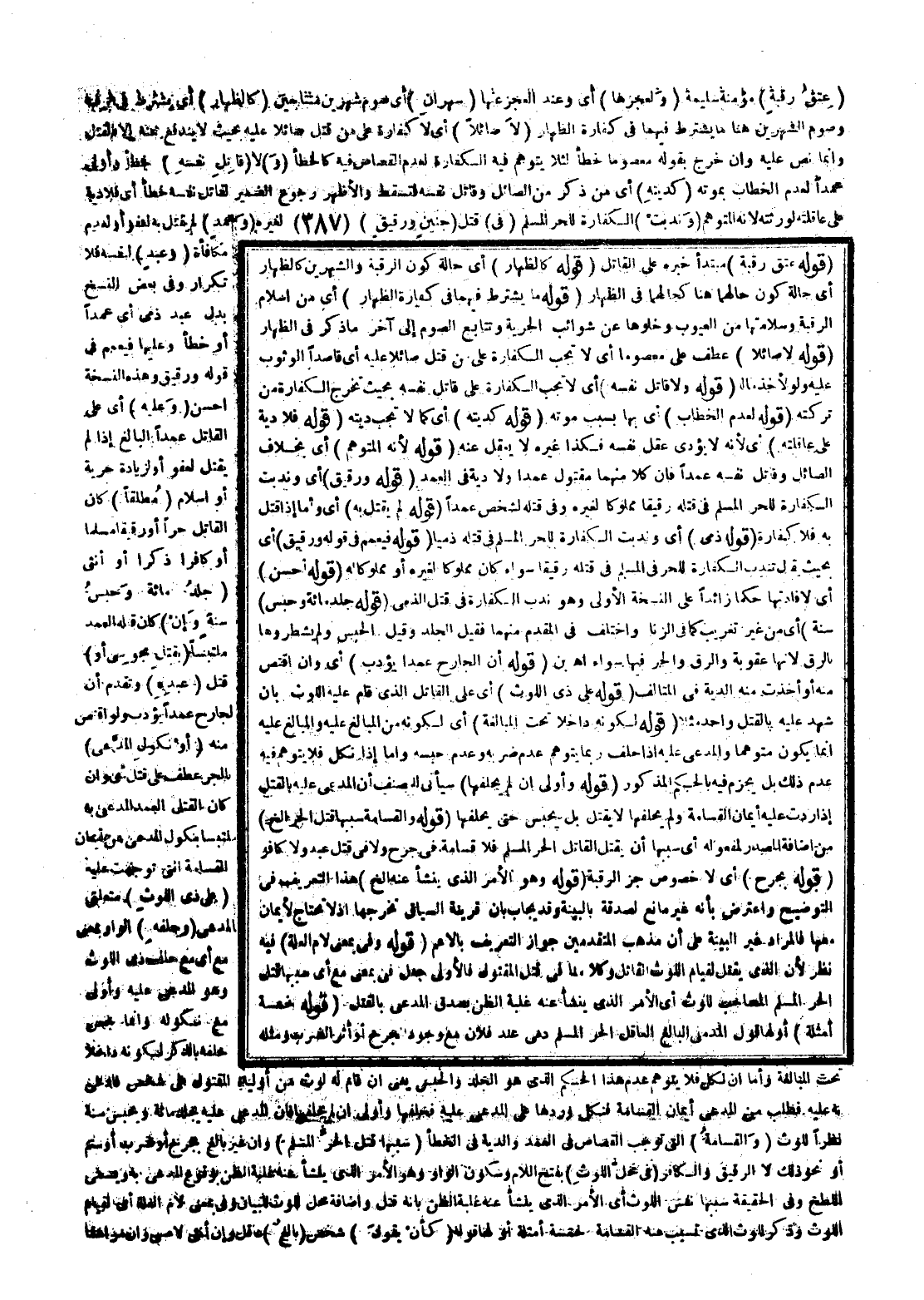 (عِتْقُ رَقَبَةٍ) مُؤْمِنَةٍ مُسْلِمَةٍ (وَلِعَجْزِهَا) أَيْ وَعِنْدَ الْعَجْزِ عَنْهَا (شَهْرَانِ) أَيْ صَوْمُ شَهْرَيْنِ مُتَتَابِعَيْنِ (كَالظِّهَارِ) أَيْ يُشْتَرَطُ فِي الرَّقَبَةِ وَصَوْمِ الشَّهْرَيْنِ هُنَا مَا يُشْتَرَطُ فِيهِمَا فِي كَفَّارَةِ الظِّهَارِ (لَا صَائِلًا) أَيْ لَا كَفَّارَةَ عَلَى مَنْ قَتَلَ صَائِلًا عَلَيْهِ بِحَيْثُ لَا يَنْدَفِعُ عَنْهُ إلَّا بِالْقَتْلِ، وَإِنَّمَا نَصَّ عَلَيْهِ، وَإِنْ خَرَجَ بِقَوْلِهِ مَعْصُومًا خَطَأً لِئَلَّا يُتَوَهَّمَ فِيهِ الْكَفَّارَةُ لِعَدَمِ الْقِصَاصِ فِيهِ كَالْخَطَإِ (و) لَا (قَاتِلِ نَفْسِهِ) خَطَأً وَأَوْلَى عَمْدًا لِعَدَمِ الْخِطَابِ بِمَوْتِهِ (كَدِيَتِهِ) أَيْ مِنْ ذَكَر مِنْ الصَّائِل وَقَاتِلِ نَفْسه فَتَسْقُط، وَالْأَظْهَر رُجُوع الضَّمِير لِقَاتِلِ نَفْسِهِ خَطَأ أَيْ فَلَا دِيَة عَلَى عَاقِلَته لِوَرَثَتِهِ؛ لِأَنَّهُ الْمُتَوَهَّمُ (وَنُدِبَتْ) الْكَفَّارَة لِلْحُرِّ الْمُسْلِم (فِي) قَتْلِ (جَنِين وَرَقِيق) لِغَيْرِهِ (وَعَمْد) لَمْ يُقْتَلْ بِهِ لِعَفْوِ، أَوْ لِعَدَمِ مُكَافَأَة (وَعَبْد) لِنَفْسِهِ فَلَا تَكْرَار وَفِي بَعْض النُّسَخ بَدَلَ عَبْد ذِمِّيّ أَيْ عَمْدًا، أَوْ خَطَأ وَعَلَيْهَا فَيَعْمُمْ فِي قَوْله وَرَقِيق، وَهَذِهِ النُّسْخَة أَحْسَن (وَعَلَيْهِ) أَيْ عَلَى الْقَاتِل عَمْدًا الْبَالِغ إذَا لَمْ يُقْتَلُ لِعَفْوٍ، أَوْ لِزِيَادَةِ حُرِّيَّة، أَوْ إسْلَامٍ (مُطْلَقًا) كَانَ الْقَاتِل حُرًّا، أَوْ رَقِيقًا مُسْلِمًا، أَوْ كَافِرًا ذَكَرًا، أَوْ أُنْثَى (جُلِدَ مِائَةً وَحُبِسَ سَنَةً) ، (وَإِنْ) كَانَ قَتَلَهُ الْعَمْدَ مُلْتَبِسًا (بِقَتْلِ مَجُوسِيّ، أَوْ) قَتَلَ (عَبْده) وَتَقَدَّمَ أَنَّ الْجَارِح عَمْدًا يُؤَدِّب وَلَوْ اُقْتُصَّ مِنْهُ (أَوْ نُكُولِ الْمُدَّعِي) بِالْجَرِّ عِطْف عَلَى قَتْلِ أَيْ، وَإِنْ كَانَ الْقَتْلُ الْعَمْدُ الْمُدَّعَى بِهِ مُلْتَبِسًا بِنُكُولِ الْمُدَّعِي عَنْ أَيْمَان الْقَسَامَة الَّتِي تَوَجَّهَتْ عَلَيْهِ (عَلَى ذِي اللُّوث) مُتَعَلِّق بِالْمُدَّعَى (وَحَلَّفَهُ) الْوَاو بِمَعْنَى مَعَ أَيْ مَعَ حَلِفِ ذِي اللُّوث، وَهُوَ الْمُدَّعَى عَلَيْهِ وَأَوْلَى مَعَ نُكُوله، وَإِنَّمَا خَصَّ حَلَفَهُ بِالذَّكَرِ لِكَوْنِهِ دَاخِلًا تَحْت الْمُبَالَغَة وَأَمَّا إنْ نَكِل فَلَا يُتَوَهَّم عَدَم هَذَا الْحُكْم الَّذِي هُوَ الْجَلْدُ، وَالْحَبْس يَعْنِي إنْ قَامَ لَهُ لَوْثٌ مِنْ أَوْلِيَاء الْمَقْتُول عَلَى شَخْص فَادَّعَى بِهِ عَلَيْهِ فَطَلَب مِنْ الْمُدَّعِي أَيْمَان الْقَسَامَة فَنَكِل وَرَدَّهَا عَلَى الْمُدَّعَى عَلَيْهِ فَحَلَفَهَا وَأُولَى إنْ لَمْ يَحْلِفهَا فَإِنَّ الْمُدَّعَى عَلَيْهِ يُجْلَدُ مِائَةً وَيُحْبَسُ سَنَة نَظَّرَا لَلَوَّثَ (وَالْقَسَامَة) الَّتِي تُوجِب الْقِصَاص فِي الْعَمْد، وَالدِّيَة فِي الْخَطَأ (سَبَبُهَا قَتْلُ الْحُرّ الْمُسْلِم) وَإِنْ غَيْر بَالِغٍ بِجُرْحٍ، أَوْ ضَرْبٍ، أَوْ سُمٍّ، أَوْ نَحْو ذَلِكَ لَا الرَّقِيق، وَالْكَافِر (فِي مَحَلّ اللَّوْثِ) بِفَتْحِ اللَّام وَسُكُون الْوَاو، وَهُوَ الْأَمْر الَّذِي يَنْشَأ عَنْهُ غَلَبَة الظَّنّ بِوُقُوعِ الْمُدَّعَى بِهِ وَيُسَمَّى اللَّطْخ وَفِي الْحَقِيقَة سَبَبُهَا نَفْسُ اللُّوث أَيْ الْأَمْر الَّذِي يَنْشَأ عَنْهُ غَلَبَة الظَّنّ بِأَنَّهُ قَتَلَ، وَإِضَافَةُ مَحَلِّ اللَّوْثِ لِلْبَيَانِ وَفِي بِمَعْنَى لَامَ الْعِلَّة أَيْ لِقِيَامِ اللَّوْثِ وَذَكَر لِلَّوْثِ الَّذِي تَسَبَّبَ عَنْهُ الْقَسَامَة خَمْسَة أَمْثِلَة، أَوَّلُهَا قَوْله (كَأَنْ يَقُول) شَخْص (بَالِغٌ) عَاقِلٌ، وَإِنْ أُنْثَى لَا صَبِيّ، وَإِنْ مُرَاهِقًا