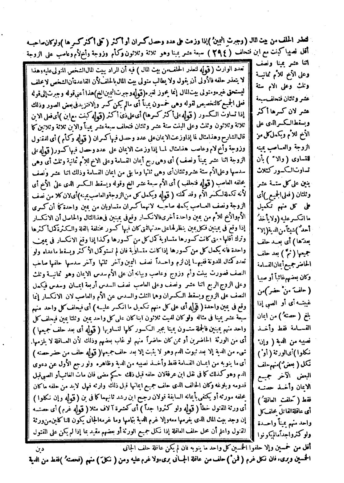 (وَجُبِرَتْ الْيَمِينُ) إذَا وُزِّعَتْ عَلَى عَدَدٍ وَحَصَلَ كَسْرَانِ، أَوْ أَكْثَرُ (عَلَى أَكْثَرِ كَسْرِهَا) وَلَوْ كَانَ صَاحِبُهُ أَقَلَّ نَصِيبًا كَبِنْتٍ مَعَ ابْنٍ فَتَحْلِفُ سَبْعَةَ عَشَرَ يَمِينًا، وَهُوَ ثَلَاثَةً وَثَلَاثِينَ وَكَأُمٍّ وَزَوْجَةٍ وَأَخٍ لِأُمٍّ وَعَاصِبٍ عَلَى الزَّوْجَةِ اثْنَا عَشَرَ يَمِينًا وَنِصْفٌ وَعَلَى الْأَخِ لِلْأُمِّ ثَمَانِيَةٌ وَثُلُثٌ وَعَلَى الْأُمِّ سِتَّةَ عَشَرَ وَثُلُثَانِ فَتَحْلِفُ بِسَبْعَةَ عَشَرَ؛ لِأَنَّ كَسْرَهَا أَكْثَرُ وَيَسْقُطُ الْكَسْرُ الَّذِي عَلَى الْأَخِ لِلْأُمِّ وَيُكَمِّلُ كُلٌّ مِنْ الزَّوْجَةِ، وَالْعَاصِبِ يَمِينَهُ لِلتَّسَاوِي (وَإِلَّا) بِأَنْ تَسَاوَتْ الْكُسُورُ كَثَلَاثِ بَنِينَ عَلَى كُلٍّ سِتَّةَ عَشَرَ وَثُلُثَانِ (فَعَلَى الْجَمِيعِ) أَيْ عَلَى كُلٍّ مِنْهُمْ تَكْمِيلُ مَا انْكَسَرَ عَلَيْهِ (وَلَا يَأْخُذُ أَحَدٌ) شَيْئًا مِنْ الدِّيَةِ (إلَّا بَعْدَهَا) أَيْ بَعْدَ حَلِفِ جَمِيعِهَا (ثُمَّ) بَعْدَ حَلِفِ الْحَاضِرِ جَمِيعَ أَيْمَانِ الْقَسَامَةِ وَكَانَ بَعْضُهُمْ غَائِبًا، أَوْ صَبِيًّا (حَلَفَ مَنْ حَضَرَ) مِنْ غَيْبَتِهِ أَيْ، أَوْ الصَّبِيُّ إذَا بَلَغَ (حِصَّتَهُ) مِنْ أَيْمَانِ الْقَسَامَةِ فَقَطْ وَأَخَذَ نَصِيبَهُ مِنْ الدِّيَةِ (وَإِنْ) (نَكَلُوا) أَيْ الْوَرَثَةُ (أَوْ) نَكَلَ (بَعْضٌ) مِنْهُمْ حَلَفَ الْبَعْضُ الْآخَرُ جَمِيعَ الْأَيْمَانِ وَأَخَذَ حِصَّتَهُ فَقَطْ (حَلَفَتْ الْعَاقِلَةُ) أَيْ عَاقِلَةُ الْقَاتِلِ يَحْلِفُ كُلٌّ مِنْهُمْ يَمِينًا وَاحِدَةً وَلَوْ كَثُرُوا جِدًّا مَا لَمْ يَكُونُوا أَقَلَّ مِنْ خَمْسِينَ، وَإِلَّا حَلَفُوا الْخَمْسِينَ كُلُّ وَاحِدٍ مَا يَنُوبُهُ فَإِنْ لَمْ يَكُنْ عَاقِلَةٌ حَلَفَ الْجَانِي الْخَمْسِينَ وَبَرِئَ فَإِنْ نَكَلَ غَرِمَ (فَمَنْ) حَلَفَ مِنْ عَاقِلَةِ الْجَانِي بَرِئَ وَلَا غُرْمَ عَلَيْهِ.