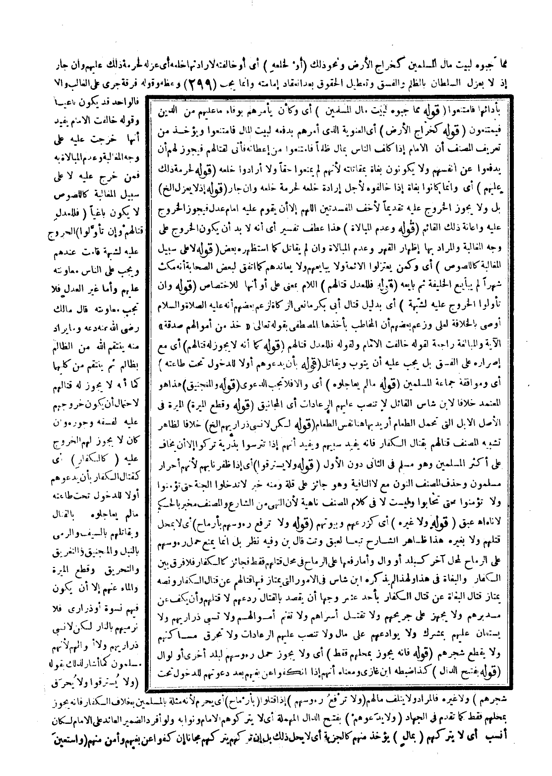 مِمَّا جَبَوْهُ لِبَيْتِ مَالِ الْمُسْلِمِينَ كَخَرَاجِ الْأَرْضِ وَنَحْوِ ذَلِكَ (أَوْ لِخَلْعِهِ) أَيْ، أَوْ خَالَفَتْهُ لِإِرَادَتِهَا خَلْعَهُ أَيْ عَزْلَهُ لِحُرْمَةِ ذَلِكَ عَلَيْهِمْ، وَإِنْ جَارٍ؛ إذْ لَا يُعْزَلُ السُّلْطَانُ بِالظُّلْمِ، وَالْفِسْقِ وَتَعْطِيلِ الْحُقُوقِ بَعْدَ انْعِقَادِ إمَامَتِهِ، وَإِنَّمَا يَجِبُ وَعْظُهُ وَقَوْلُهُ فِرْقَةٌ جَرْيٌ عَلَى الْغَالِبِ، وَإِلَّا، فَالْوَاحِدُ قَدْ يَكُونُ بَاغِيًا وَقَوْلُهُ خَالَفَتْ الْإِمَامَ يُفِيدُ أَنَّهَا خَرَجَتْ عَلَيْهِ عَلَى وَجْهِ الْمُغَالَبَةِ وَعَدَمِ الْمُبَالَاةِ بِهِ فَمَنْ خَرَجَ عَلَيْهِ لَا عَلَى سَبِيلِ الْمُغَالَبَةِ كَاللُّصُوصِ لَا يَكُونُ بَاغِيًا (فَلِلْعَدْلِ قِتَالُهُمْ، وَإِنْ تَأَوَّلُوا) الْخُرُوجَ عَلَيْهِ لِشُبْهَةٍ قَامَتْ عِنْدَهُمْ وَيَجِبُ عَلَى النَّاسِ مُعَاوَنَتُهُ عَلَيْهِمْ وَأَمَّا غَيْرُ الْعَدْلِ فَلَا تَجِبُ مُعَاوَنَتُهُ قَالَ مَالِكٌ - رَضِيَ اللَّهُ عَنْهُ - دَعْهُ وَمَا يُرَادُ مِنْهُ يَنْتَقِمُ اللَّهُ مِنْ الظَّالِمِ بِظَالِمٍ، ثُمَّ يَنْتَقِمُ مِنْ كِلَيْهِمَا كَمَا أَنَّهُ لَا يَجُوزُ قِتَالُهُمْ لِاحْتِمَالِ أَنْ يَكُونَ خُرُوجُهُمْ عَلَيْهِ لِفِسْقِهِ وَجَوْرِهِ، وَإِنْ كَانَ لَا يَجُوزُ لَهُمْ الْخُرُوجُ عَلَيْهِ.