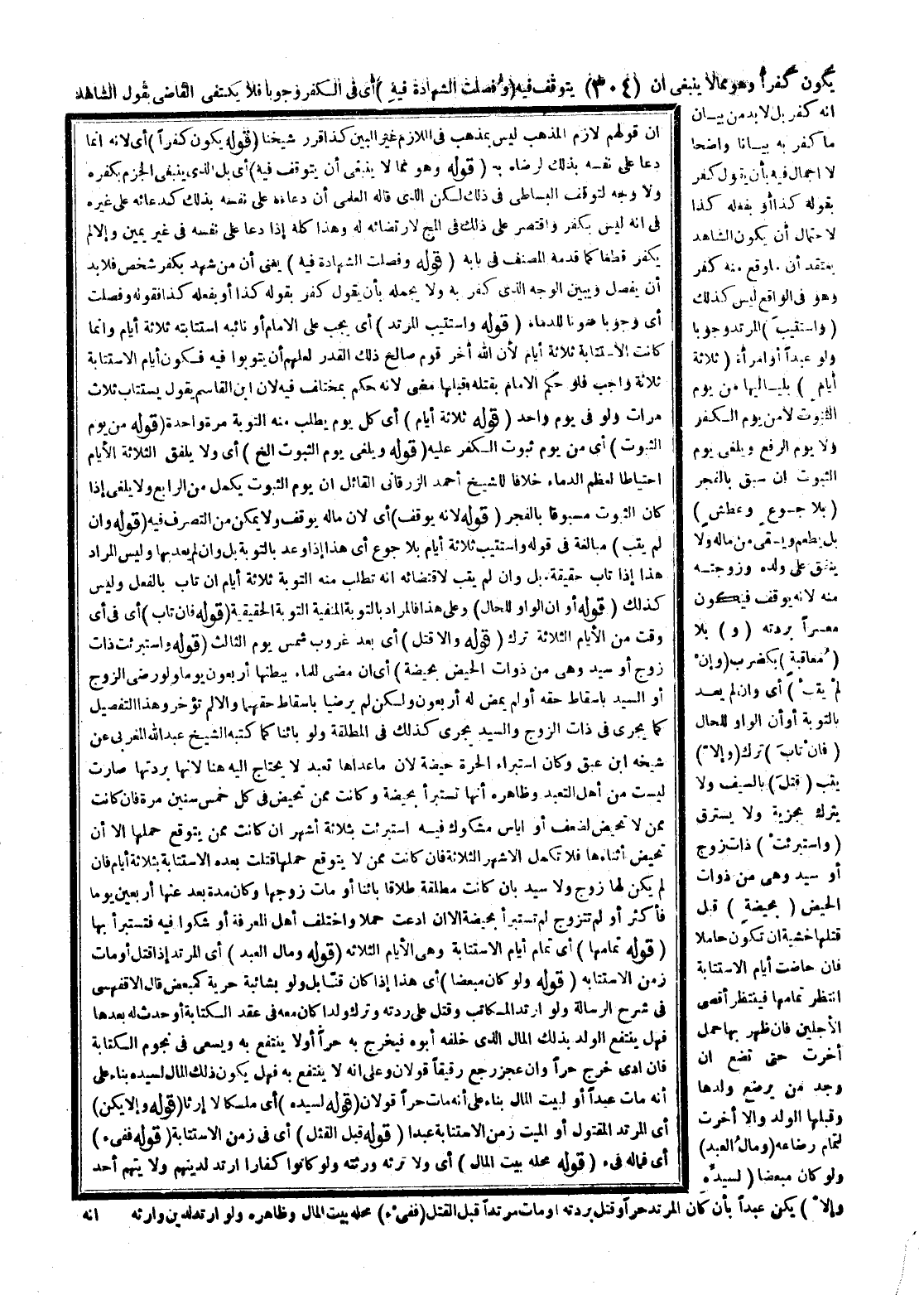 (وَاسْتُتِيبَ) الْمُرْتَدُّ وُجُوبًا وَلَوْ عَبْدًا أَوْ امْرَأَةً (ثَلَاثَةَ أَيَّامٍ) بِلَيَالِيِهَا مِنْ يَوْمِ الثُّبُوتِ لَا مِنْ يَوْمِ الْكُفْرِ وَلَا يَوْمِ الرَّفْعِ وَيُلْغَى يَوْمُ الثُّبُوتِ إنْ سَبَقَ بِالْفَجْرِ (بِلَا جُوعٍ وَعَطَشٍ) بَلْ يُطْعَمُ وَيُسْقَى مِنْ مَالِهِ وَلَا يُنْفَقُ عَلَى وَلَدِهِ وَزَوْجَتِهِ مِنْهُ لِأَنَّهُ يُوقَفُ فَيَكُونُ مُعْسِرًا بِرِدَّتِهِ (وَ) بِلَا (مُعَاقَبَةٍ) بِكَضَرْبٍ (وَإِنْ لَمْ يَتُبْ) أَيْ وَإِنْ لَمْ يَعِدْ بِالتَّوْبَةِ أَوْ أَنَّ الْوَاوَ لِلْحَالِ (فَإِنْ تَابَ) تُرِكَ (وَإِلَّا) يَتُبْ (قُتِلَ) بِالسَّيْفِ وَلَا يُتْرَكُ بِجِزْيَةٍ وَلَا يُسْتَرَقُّ (وَاسْتُبْرِئَتْ) ذَاتُ زَوْجٍ أَوْ سَيِّدٍ وَهِيَ مِنْ ذَوَاتِ الْحَيْضِ (بِحَيْضَةٍ) قَبْلَ قَتْلِهَا خَشْيَةَ أَنْ تَكُونَ حَامِلًا، فَإِنْ حَاضَتْ أَيَّامَ الِاسْتِتَابَةِ اُنْتُظِرَ تَمَامُهَا فَيُنْتَظَرُ أَقْضَى الْأَجَلَيْنِ، فَإِنْ ظَهَرَ بِهَا حَمْلٌ أُخِّرَتْ حَتَّى تَضَعَ إنْ وُجِدَ مَنْ يُرْضِعُ وَلَدَهَا وَقَبِلَهَا الْوَلَدُ وَإِلَّا أُخِّرَتْ لِتَمَامِ رَضَاعِهِ.