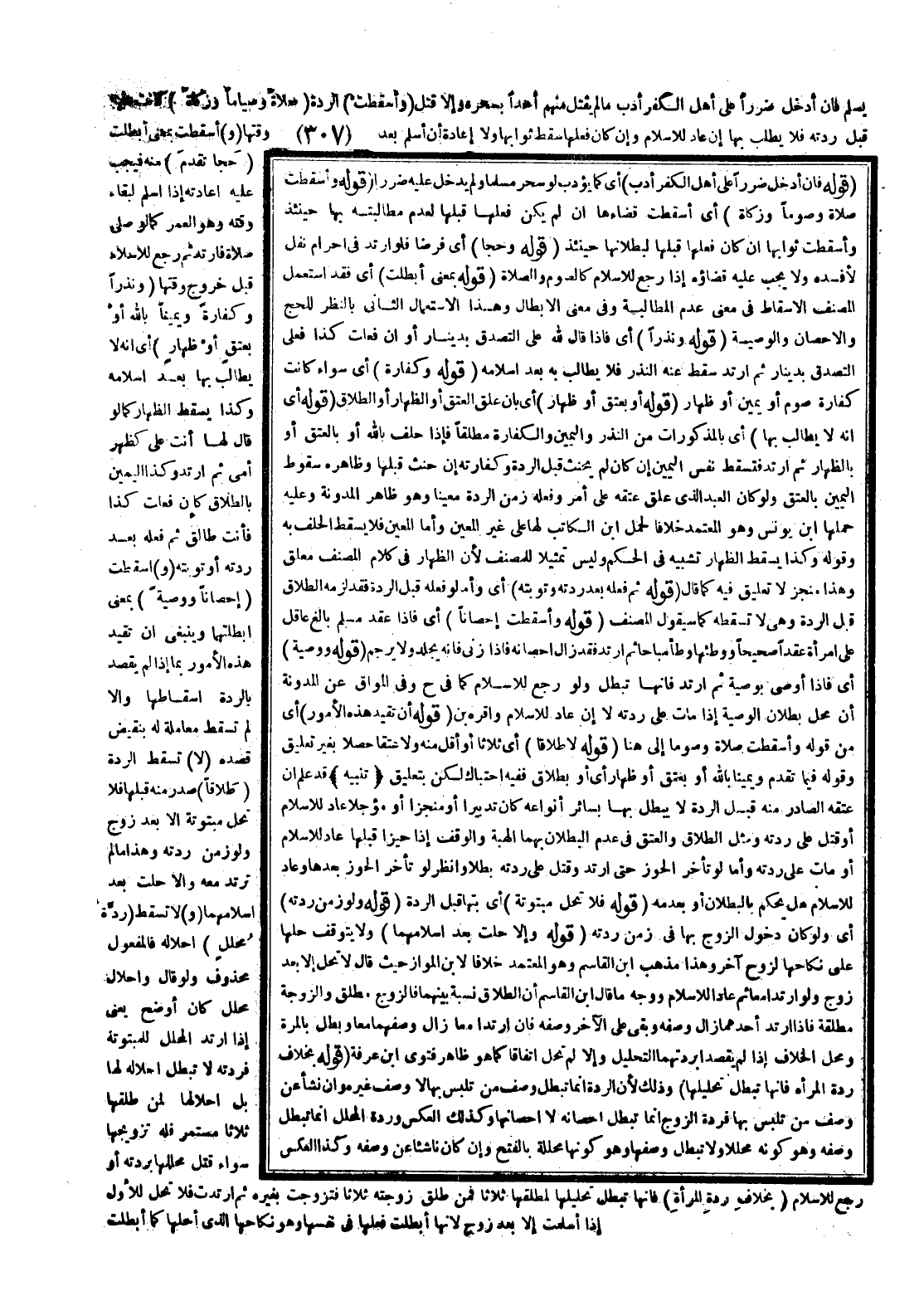 (وَأَسْقَطَتْ) الرِّدَّةُ (صَلَاةً وَصِيَامًا وَزَكَاةً) كَانَتْ عَلَيْهِ قَبْلَ رِدَّتِهِ فَلَا يُطْلَبُ بِهَا إنْ عَادَ لِلْإِسْلَامِ، وَإِنْ كَانَ فَعَلَهَا سَقَطَ ثَوَابُهَا وَلَا إعَادَةَ إنْ أَسْلَمَ بَعْدَ وَقْتِهَا (و) أَسْقَطَتْ بِمَعْنَى أَبْطَلَتْ (حَجًّا تَقَدَّمَ) مِنْهُ فَيَجِبُ عَلَيْهِ إعَادَتُهُ إذَا أَسْلَمَ لِبَقَاءِ وَقْتِهِ وَهُوَ الْعُمْرُ كَمَا لَوْ صَلَّى صَلَاةً فَارْتَدَّ ثُمَّ رَجَعَ لِلْإِسْلَامِ قَبْلَ خُرُوجِ وَقْتِهَا (وَنَذْرًا وَكَفَّارَةً وَيَمِينًا بِاَللَّهِ أَوْ بِعِتْقٍ أَوْ ظِهَارٍ) أَيْ لِأَنَّهُ لَا يُطَالَبُ بِهَا بَعْدَ إسْلَامِهِ، وَكَذَا يَسْقُطُ الظِّهَارُ كَمَا لَوْ قَالَ لَهَا أَنْت عَلَيَّ كَظَهْرِ أُمِّي ثُمَّ ارْتَدَّ وَكَذَا الْيَمِينُ بِالطَّلَاقِ كَإِنْ فَعَلْتُ كَذَا فَأَنْت طَالِقٌ ثُمَّ فَعَلَهُ بَعْدَ رِدَّتِهِ أَوْ تَوْبَتِهِ (وَ) أَسْقَطَتْ (إحْصَانًا وَوَصِيَّةً) بِمَعْنَى أَبْطَلَتْهُمَا وَيَنْبَغِي أَنْ تَقَيُّدَ هَذِهِ الْأُمُورُ بِمَا إذْ الَمْ يَقْصِدْ بِالرِّدَّةِ إسْقَاطَهَا وَإِلَّا لَمْ تُسْقِطْ مُعَامَلَةً لَهُ بِنَقِيضِ قَصْدِهِ.