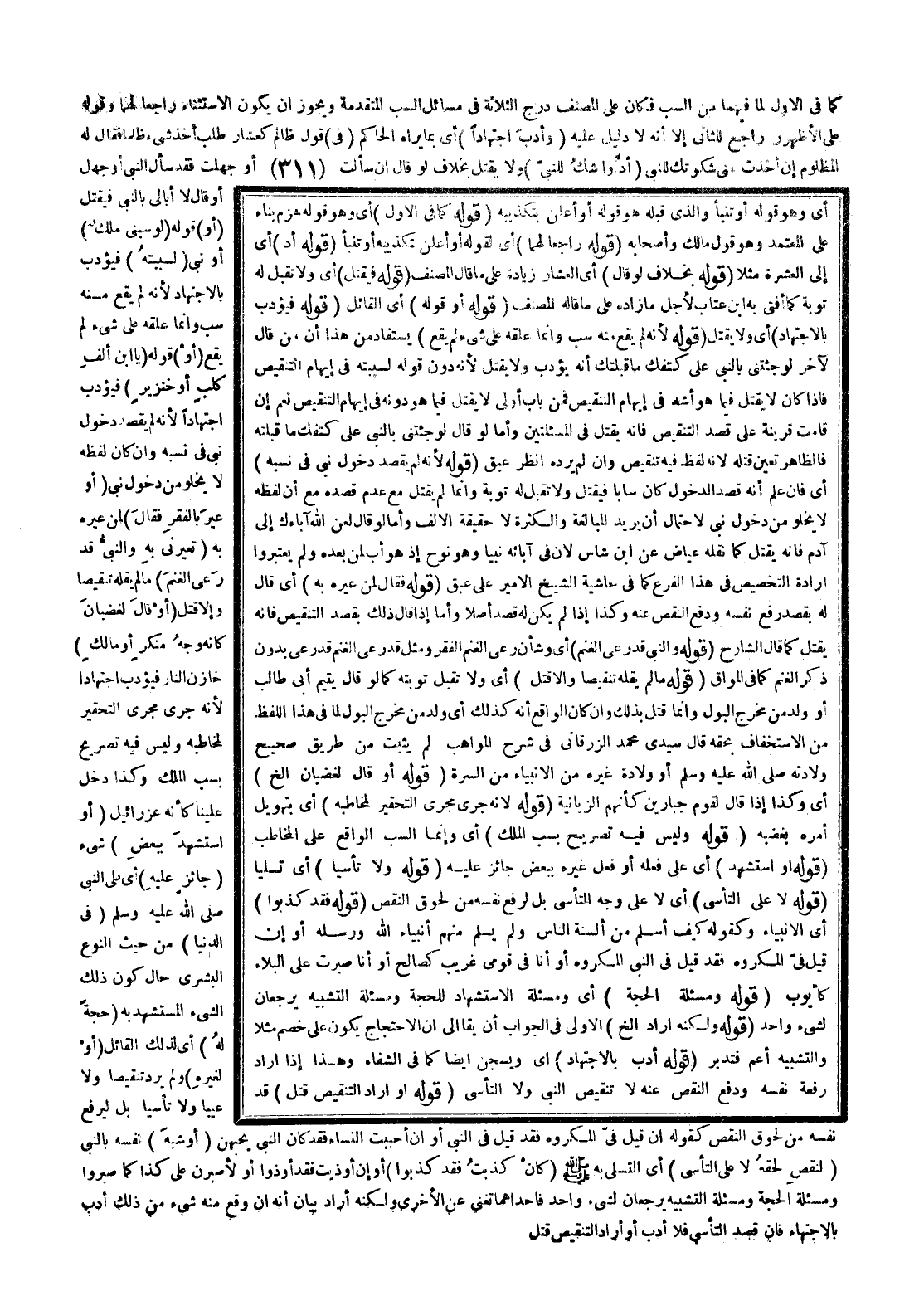(وَأُدِّبَ اجْتِهَادًا) أَيْ بِمَا يَرَاهُ الْحَاكِمُ (فِي) قَوْلِ ظَالِمٍ كَعَشَّارٍ طَلَبَ أَخْذَ شَيْءٍ ظُلْمًا فَقَالَ لَهُ الْمَظْلُومُ إنْ أَخَذْت مِنِّي شَكَوْتُك لِلنَّبِيِّ (أَدِّ وَاشْكُ لِلنَّبِيِّ) وَلَا يُقْتَلُ بِخِلَافِ لَوْ قَالَ: إنْ سَأَلْت أَوْ جَهِلْت فَقَدْ سَأَلَ النَّبِيُّ أَوْ جَهِلَ أَوْ قَالَ لَا أُبَالِي بِالنَّبِيِّ فَيُقْتَلُ (أَوْ) قَوْلِهِ (لَوْ سَبَّنِي مَلَكٌ) أَوْ نَبِيٌّ (لَسَبَبْته) فَيُؤَدَّبُ بِالِاجْتِهَادِ لِأَنَّهُ لَمْ يَقَعْ مِنْهُ سَبٌّ وَإِنَّمَا عَلَّقَهُ عَلَى شَيْءٍ لَمْ يَقَعْ (أَوْ) قَوْلُهُ: (يَا ابْنَ أَلْفِ كَلْبٍ أَوْ خِنْزِيرٍ) فَيُؤَدَّبُ اجْتِهَادًا؛ لِأَنَّهُ لَمْ يَقْصِدْ دُخُولَ نَبِيٍّ فِي نَسَبِهِ، وَإِنْ كَانَ لَفْظُهُ لَا يَخْلُو مِنْ دُخُولِ نَبِيٍّ (أَوْ عَيَّرَ بِالْفَقْرِ فَقَالَ) لِمَنْ عَيَّرَهُ بِهِ (تُعَيِّرُنِي بِهِ وَالنَّبِيُّ قَدْ رَعَى الْغَنَمَ) مَا لَمْ يَقُلْهُ تَنْقِيصًا وَإِلَّا قُتِلَ (أَوْ قَالَ لِغَضْبَانَ كَأَنَّهُ وَجْهٌ مُنْكَرٌ أَوْ مَالِكٌ) خَازِنُ النَّارِ فَيُؤَدَّبُ اجْتِهَادًا؛ لِأَنَّهُ جَرَى مَجْرَى التَّحْقِيرِ لِمُخَاطِبِهِ، وَلَيْسَ فِيهِ تَصْرِيحٌ بِسَبِّ الْمَلَكِ وَكَذَا دَخَلَ عَلَيْنَا كَأَنَّهُ عِزْرَائِيلُ (أَوْ اسْتَشْهَدَ بِبَعْضِ) شَيْءٍ (جَائِرٍ عَلَيْهِ) أَيْ عَلَى النَّبِيِّ - صَلَّى اللَّهُ عَلَيْهِ وَسَلَّمَ - (فِي الدُّنْيَا) مِنْ حَيْثُ النَّوْعُ الْبَشَرِيُّ حَالَ كَوْنِ ذَلِكَ الشَّيْءِ الْمُسْتَشْهَدِ بِهِ (حُجَّةً لَهُ) أَيْ لِذَلِكَ الْقَائِلِ (أَوْ لِغَيْرِهِ) وَلَمْ يُرِدْ تَنْقِيصًا وَلَا عَيْبًا وَلَا تَأَسِّيًا بَلْ لِيَرْفَعَ نَفْسَهُ مِنْ لُحُوقِ النَّقْصِ كَقَوْلِهِ: إنْ قِيلَ فِي الْمَكْرُوهِ فَقَدْ قِيلَ فِي النَّبِيِّ أَوْ إنْ أَحْبَبْت النِّسَاءَ فَقَدْ كَانَ النَّبِيُّ يُحِبُّهُنَّ (أَوْ) (شَبَّهَ) نَفْسَهُ بِالنَّبِيِّ (لِنَقْصٍ لَحِقَهُ لَا عَلَى التَّأَسِّي) أَيْ التَّسَلِّي بِهِ - صَلَّى اللَّهُ عَلَيْهِ وَسَلَّمَ - (كَأَنْ كُذِّبْت فَقَدْ كُذِّبُوا) أَوْ إنْ أُوذِيت فَقَدْ أُوذُوا أَوْ لَأَصْبِرَنَّ عَلَى كَذَا كَمَا صَبَرُوا وَمَسْأَلَةُ الْحُجَّةِ وَمَسْأَلَةُ التَّشْبِيهِ يَرْجِعَانِ لِشَيْءٍ وَاحِدٍ فَإِحْدَاهُمَا تُغْنِي عَنْ الْأُخْرَى وَلَكِنَّهُ أَرَادَ بَيَانَ أَنَّهُ إنْ وَقَعَ مِنْهُ شَيْءٌ مِنْ ذَلِكَ أُدِّبَ بِالِاجْتِهَادِ، فَإِنْ قَصَدَ التَّأَسِّي فَلَا أَدَبَ أَوْ أَرَادَ التَّنْقِيصَ قُتِلَ