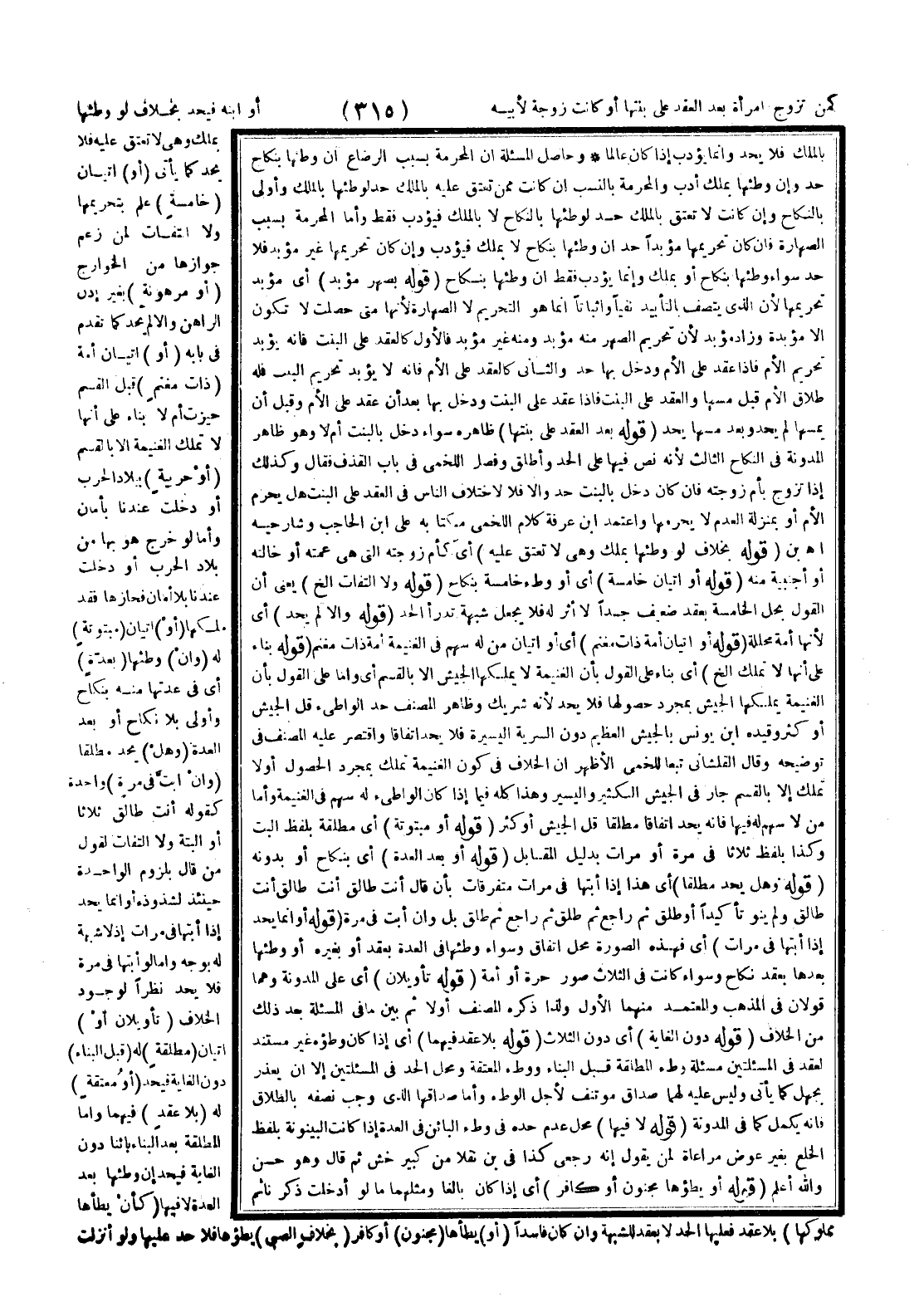 كَمَنْ تَزَوَّجَ امْرَأَةً بَعْدَ الْعَقْدِ عَلَى بِنْتِهَا أَوْ كَانَتْ زَوْجَةً لِأَبِيهِ أَوْ ابْنِهِ فَيُحَدُّ بِخِلَافِ لَوْ وَطِئَهَا بِمِلْكٍ وَهِيَ لَا تُعْتَقُ عَلَيْهِ فَلَا يُحَدُّ كَمَا يَأْتِي (أَوْ) إتْيَانَ (خَامِسَةٍ) عَلِمَ بِتَحْرِيمِهَا وَلَا الْتِفَاتَ لِمَنْ زَعَمَ جَوَازَهَا مِنْ الْخَوَارِجِ (أَوْ مَرْهُونَةٍ) بِغَيْرِ إذْنِ الرَّاهِنِ وَإِلَّا لَمْ يُحَدَّ كَمَا تَقَدَّمَ فِي بَابِهِ (أَوْ) إتْيَانَ أَمَةٍ (ذَاتِ مَغْنَمٍ) قَبْلَ الْقَسْمِ حِيزَتْ أَمْ لَا بِنَاءً عَلَى أَنَّهَا لَا تَمْلِكُ الْغَنِيمَةَ إلَّا بِالْقَسْمِ (أَوْ حَرْبِيَّةٍ) بِبِلَادِ الْحَرْبِ أَوْ دَخَلَتْ عِنْدَنَا بِأَمَانٍ، وَأَمَّا لَوْ خَرَجَ هُوَ بِهَا مِنْ بِلَادِ الْحَرْبِ أَوْ دَخَلَتْ عِنْدَنَا بِلَا أَمَانٍ فَحَازَهَا فَقَدْ مَلَكَهَا (أَوْ) إتْيَانَ (مَبْتُوتَةٍ) لَهُ (وَإِنْ) وَطِئَهَا (بِعِدَّةٍ) أَيْ فِي عِدَّتِهَا مِنْهُ بِنِكَاحٍ وَأَوْلَى بِلَا نِكَاحٍ أَوْ بَعْدَ الْعِدَّةِ.