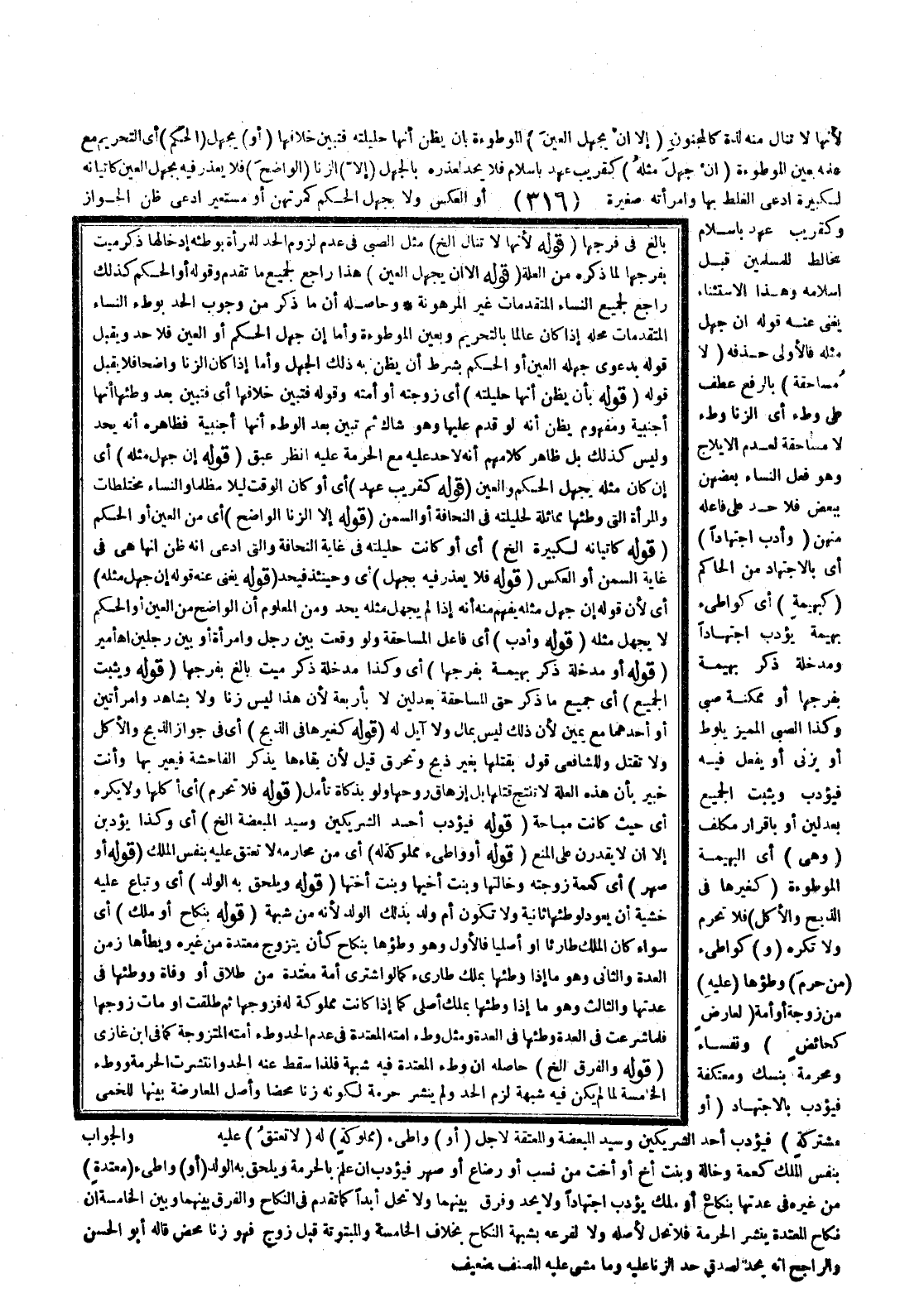(وَ) كَوَاطِئِ (مَنْ حَرُمَ) وَطْؤُهَا (عَلَيْهِ) مِنْ زَوْجَةٍ أَوْ أَمَةٍ (لِعَارِضٍ) (كَحَائِضٍ) وَنُفَسَاءَ وَمُحَرَّمَةٍ بِنُسُكٍ وَمُعْتَكِفَةٍ فَيُؤَدَّبُ بِالِاجْتِهَادِ (أَوْ مُشْتَرَكَةٍ) فَيُؤَدَّبُ أَحَدُ الشَّرِيكَيْنِ وَسَيِّدُ الْمُبَعَّضَةِ وَالْمُعْتَقَةِ لِأَجَلٍ (أَوْ) وَاطِئِ (مَمْلُوكَةٍ) لَهُ (لَا تُعْتَقُ) عَلَيْهِ بِنَفْسِ الْمِلْكِ كَعَمَّةٍ وَخَالَةٍ وَبِنْتِ أَخٍ أَوْ أُخْتٍ مِنْ نَسَبٍ أَوْ رَضَاعٍ أَوْ صِهْرٍ فَيُؤَدَّبُ إنْ عَلِمَ بِالْحُرْمَةِ وَيَلْحَقُ بِهِ الْوَلَدُ (أَوْ) وَاطِئِ (مُعْتَدَّةٍ) مِنْ غَيْرِهِ فِي عِدَّتِهَا بِنِكَاحٍ أَوْ مِلْكٍ يُؤَدَّبُ اجْتِهَادًا وَلَا يُحَدُّ وَفَرْقٌ بَيْنَهُمَا وَلَا تَحِلُّ أَبَدًا كَمَا تَقَدَّمَ فِي النِّكَاحِ وَالْفَرْقُ بَيْنَهُمَا وَبَيْنَ الْخَامِسَةِ أَنَّ نِكَاحَ الْمُعْتَدَّةِ يَنْشُرُ الْحُرْمَةَ فَلَا تَحِلُّ لِأَصْلِهِ وَلَا لِفَرْعِهِ بِشُبْهَةِ النِّكَاحِ بِخِلَافِ الْخَامِسَةِ وَالْمَبْتُوتَةِ قَبْلَ زَوْجٍ فَهُوَ زِنًا مُحَصِّنٌ قَالَهُ أَبُو الْحَسَنِ، وَالرَّاجِحُ أَنَّهُ يُحَدُّ لِصِدْقِ حَدِّ الزِّنَا عَلَيْهِ وَمَا مَشَى عَلَيْهِ الْمُصَنِّفُ ضَعِيفٌ
