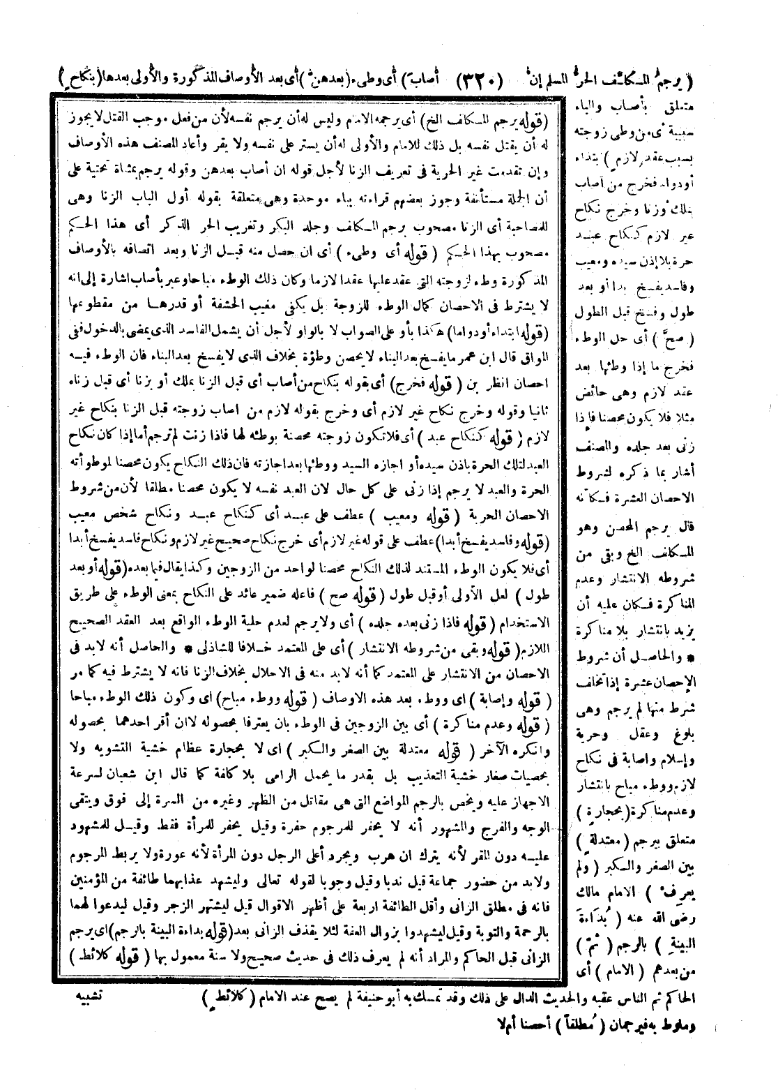 (يُرْجَمُ الْمُكَلَّفُ الْحُرُّ الْمُسْلِمُ إنْ أَصَابَ) أَيْ وَطِئَ (بَعْدَهُنَّ) أَيْ بَعْدَ الْأَوْصَافِ الْمَذْكُورَةِ وَالْأَوْلَى بَعْدَهَا (بِنِكَاحٍ) مُتَعَلِّقٍ بِأَصَابَ وَالْبَاءُ سَبَبِيَّةٌ أَيْ مَنْ وَطِئَ زَوْجَتَهُ بِسَبَبِ عَقْدٍ (لَازِمٍ) ابْتِدَاءً أَوْ دَوَامًا فَخَرَجَ مَنْ أَصَابَ بِمِلْكٍ أَوْ زِنًا وَخَرَجَ نِكَاحٌ غَيْرُ لَازِمٍ كَنِكَاحِ عَبْدٍ حُرَّةً بِلَا إذْنِ سَيِّدِهِ وَمَعِيبٍ وَفَاسِدٍ يُفْسَخُ أَبَدًا أَوْ بَعْدَ طُولٍ وَفَسْخٍ قَبْلَ الطُّولِ (صَحَّ) أَيْ حَلَّ الْوَطْءُ خَرَجَ مَا إذَا وَطِئَهَا بَعْدَ عَقْدٍ لَازِمٍ وَهِيَ حَائِضٌ مَثَلًا فَلَا يَكُونُ مُحْصَنًا فَإِذَا زَنَى بَعْدَ جَلْدِهِ وَالْمُصَنِّفُ أَشَارَ بِمَا ذَكَرَهُ لِشُرُوطِ الْإِحْصَانِ الْعَشَرَةِ فَكَأَنَّهُ قَالَ يُرْجَمُ الْمُحْصَنُ وَهُوَ الْمُكَلَّفُ إلَخْ وَبَقِيَ مِنْ شُرُوطِهِ الِانْتِشَارُ وَعَدَمُ الْمُنَاكَرَةِ فَكَانَ عَلَيْهِ أَنْ يَزِيدَ بِانْتِشَارٍ بِلَا مُنَاكَرَةٍ، وَالْحَاصِلُ أَنَّ شُرُوطَ الْإِحْصَانِ عَشَرَةٌ إذَا تَخَلَّفَ شَرْطٌ مِنْهَا لَمْ يُرْجَمْ وَهِيَ بُلُوغٌ وَعَقْلٌ وَحُرِّيَّةٌ وَإِسْلَامٌ وَإِصَابَةٌ فِي نِكَاحٍ لَازِمٍ وَوَطْءٌ مُبَاحٌ بِانْتِشَارٍ وَعَدَمِ مُنَاكَرَةٍ (بِحِجَارَةٍ) مُتَعَلِّقٌ بِرَجْمٍ (مُعْتَدِلَةٍ) بَيْنَ الصِّغَرِ وَالْكِبَرِ (وَلَمْ يَعْرِفْ) الْإِمَامُ مَالِكٌ - رَضِيَ اللَّهُ عَنْهُ - (بُدَاءَةَ الْبَيِّنَةِ) بِالرَّجْمِ (ثُمَّ) مِنْ بَعْدِهِمْ (الْإِمَامُ) أَيْ الْحَاكِمُ ثُمَّ النَّاسُ عَقِبَهُ وَالْحَدِيثُ الدَّالُ عَلَى ذَلِكَ وَقَدْ تَمَسَّك بِهِ أَبُو حَنِيفَةَ لَمْ يَصِحَّ عِنْدَ الْإِمَامِ (كَلَائِطٍ) وَمَلُوطٍ بِهِ فَيُرْجَمَانِ (مُطْلَقًا) أَحْصَنَا أَمْ لَا