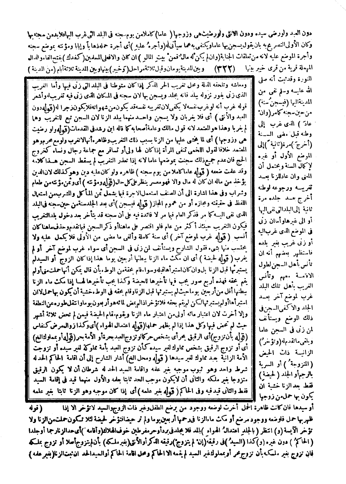 (قَوْلُهُ: دُونَ الْعَبْدِ وَالْأُنْثَى) أَيْ فَلَا يُغَرَّبَانِ وَلَا يُسْجَنُ وَاحِدٌ مِنْهُمَا بِبَلَدِ الزِّنَا؛ لِأَنَّ السَّجْنَ تَبَعٌ لِلتَّغْرِيبِ وَهُمَا لَمْ يُغَرَّبَا وَهَذَا هُوَ الْمُعْتَمَدُ؛ لِأَنَّهُ قَوْلُ مَالِكٍ وَعَامَّةِ أَصْحَابِهِ كَمَا قَالَهُ ابْنُ رُشْدٍ فِي الْمُقَدِّمَاتِ.