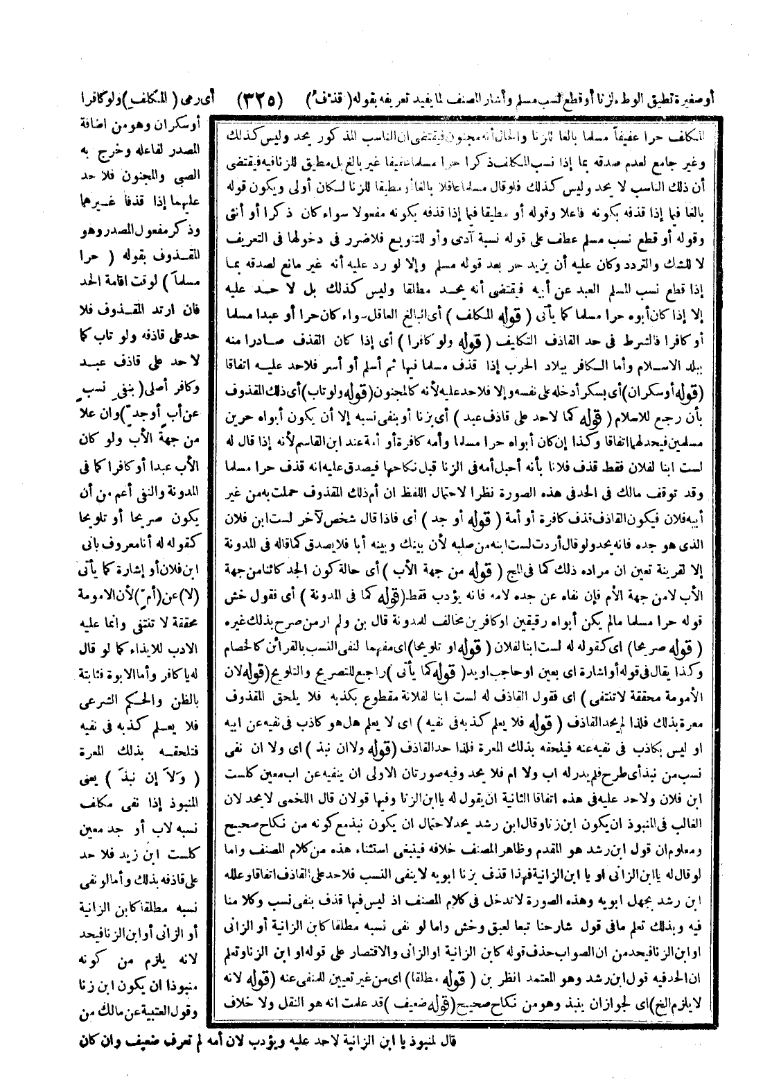 ـــــــــــــــــــــــــــــQالْمُكَلَّفُ حُرًّا عَفِيفًا بَالِغًا لِلزِّنَا، وَالْحَالُ أَنَّهُ مَجْنُونٌ فَيَقْتَضِي أَنَّ النَّاسِبَ الْمَذْكُورَ يُحَدُّ وَلَيْسَ كَذَلِكَ وَغَيْرُ جَامِعٍ لِعَدَمِ صِدْقِهِ بِمَا إذَا نَسَبَ الْمُكَلَّفُ ذَكَرًا حُرًّا مُسْلِمًا عَفِيفًا غَيْرَ بَالِغٍ بَلْ مُطِيقٌ لِلزِّنَا فِيهِ فَيَقْتَضِي أَنَّ ذَلِكَ النَّاسِبَ لَا يُحَدُّ وَلَيْسَ كَذَلِكَ فَلَوْ قَالَ مُسْلِمًا عَاقِلًا بَالِغًا أَوْ مُطِيقًا لِلزِّنَا لَكَانَ أَوْلَى وَيَكُونُ قَوْلُهُ: بَالِغًا فِيمَا إذَا قَذَفَهُ بِكَوْنِهِ فَاعِلًا وَقَوْلُهُ: أَوْ مُطِيقًا فِيمَا إذَا قَذَفَهُ بِكَوْنِهِ مَفْعُولًا سَوَاءٌ كَانَ ذَكَرًا أَوْ أُنْثَى وَقَوْلُهُ: أَوْ قَطَعَ نَسَبَ مُسْلِمٍ عَطْفٌ عَلَى قَوْلِهِ نِسْبَةُ آدَمِيٍّ وَأَوْ لِلتَّنْوِيعِ فَلَا ضَرَرَ فِي دُخُولِهَا فِي التَّعْرِيفِ لَا لِلشَّكِّ وَالتَّرَدُّدِ وَكَانَ عَلَيْهِ أَنْ يَزِيدَ حُرٍّ بَعْدَ قَوْلِهِ مُسْلِمٍ، وَإِلَّا لَوْ رَدَّ عَلَيْهِ أَنَّهُ غَيْرُ مَانِعٍ لِصِدْقِهِ بِمَا إذَا قَطَعَ نَسَبَ الْمُسْلِمِ الْعَبْدِ عَنْ أَبِيهِ فَيَقْتَضِي أَنَّهُ يُحَدُّ مُطْلَقًا وَلَيْسَ كَذَلِكَ بَلْ لَا حَدَّ عَلَيْهِ، إلَّا إذَا كَانَ أَبُوهُ حُرًّا مُسْلِمًا كَمَا يَأْتِي.