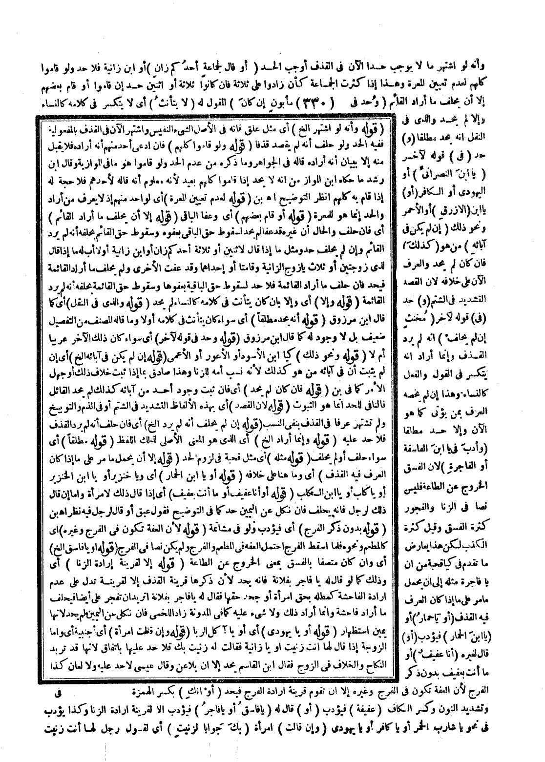 (قَوْلُهُ: وَلَوْ قَامُوا كُلُّهُمْ) ، فَإِنْ ادَّعَى أَحَدٌ مِنْهُمْ أَنَّهُ أَرَادَهُ فَلَا يُقْبَلُ مِنْهُ، إلَّا بِبَيَانِ أَنَّهُ أَرَادَهُ قَالَهُ فِي الْجَوَاهِرِ وَمَا ذَكَرَهُ مِنْ عَدَمِ الْحَدِّ وَلَوْ قَامُوا هُوَ مَا فِي الْمَوَّازِيَّةِ وَقَالَ ابْنُ رُشْدٍ مَا حَكَاهُ ابْنُ الْمَوَّازِ مِنْ أَنَّهُ لَا يُحَدُّ إذَا قَامُوا كُلُّهُمْ بَعِيدٌ؛ لِأَنَّهُ مَعْلُومٌ أَنَّهُ قَالَهُ لِأَحَدِهِمْ فَلَا حُجَّةَ لَهُ إذَا قَامَ بِهِ كُلُّهُمْ اُنْظُرْ التَّوْضِيحَ اهـ بْن.