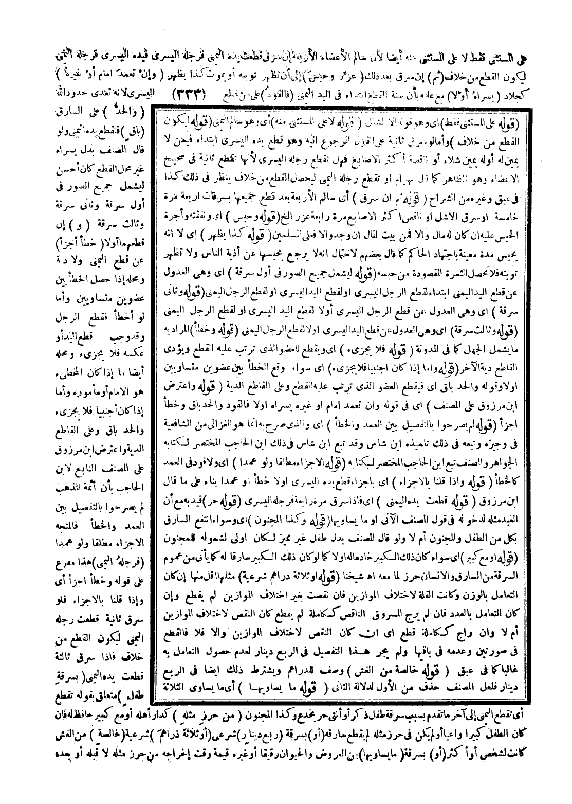 (قَوْلُهُ: أَوْ ثَلَاثَةِ دَرَاهِمَ شَرْعِيَّةٍ) مِثْلُهَا أَقَلُّ مِنْهَا إنْ كَانَ التَّعَامُلُ بِالْوَزْنِ وَكَانَتْ الْقِلَّةُ لِاخْتِلَافِ الْمَوَازِينِ، فَإِنْ نَقَصَتْ بِغَيْرِ اخْتِلَافِ الْمَوَازِينِ لَمْ يُقْطَعْ، وَإِنْ كَانَ التَّعَامُلُ بِالْعَدَدِ، فَإِنْ لَمْ يُرْجَ الْمَسْرُوقُ النَّاقِصُ كَكَامِلَةٍ لَمْ يُقْطَعْ كَانَ النَّقْصُ لِاخْتِلَافِ الْمَوَازِينِ أَمْ لَا، وَإِنْ رَاجَ كَكَامِلَةٍ قُطِعَ أَيْ إنْ كَانَ النَّقْصُ لِاخْتِلَافِ الْمَوَازِينِ، وَإِلَّا فَلَا فَالْقَطْعُ فِي صُورَتَيْنِ وَعَدَمُهُ فِي بَاقِيهَا وَلَمْ يَجْرِ هَذَا التَّفْصِيلُ فِي الرُّبْعِ دِينَارٍ لِعَدَمِ حُصُولِ التَّعَامُلِ بِهِ غَالِبًا كَمَا فِي عبق.