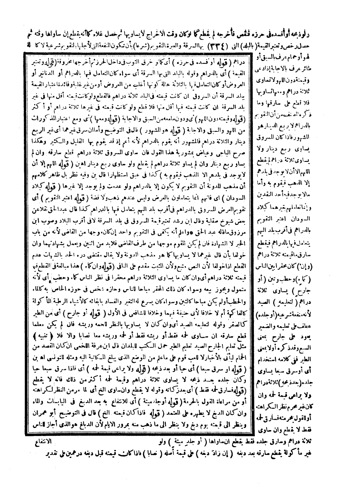 وَلَوْ ذَبَحَهُ أَوْ أَفْسَدَهُ فِي حِرْزِهِ فَنَقَصَ فَأَخْرَجَهُ لَمْ يُقْطَعْ كَمَا لَوْ كَانَ وَقْتَ الْإِخْرَاجِ لَا يُسَاوِيهَا ثُمَّ حَصَلَ غَلَاءٌ كَمَا أَنَّهُ يُقْطَعُ إنْ سَاوَاهَا وَقْتَهُ ثُمَّ حَصَلَ رُخْصٌ وَتُعْتَبَرُ الْقِيمَةُ (بِالْبَلَدِ) الَّتِي بِهَا السَّرِقَةُ وَالْعِبْرَةُ بِالتَّقْوِيمِ (شَرْعًا) بِأَنْ تَكُونَ الْمَنْفَعَةُ الَّتِي لِأَجْلِهَا بِالتَّقْوِيمِ شَرْعِيَّةً لَا كَآلَةِ لَهْوٍ أَوْ حَمَامٍ عُرِفَ بِالسَّبْقِ أَوْ طَائِرٍ عُرِفَ بِالْإِجَابَةِ إذَا دُعِيَ وَقِيمَتُهُ دُونَ اللَّهْوِ لَا تُسَاوِي ثَلَاثَةَ دَرَاهِمَ وَمَعَهَا تُسَاوِيهَا فَلَا قَطْعَ عَلَى سَارِقِهَا وَمَا ذَكَرَهُ الْمُصَنِّفُ مِنْ أَنَّ التَّقْوِيمَ بِالدَّرَاهِمِ لَا بِرُبْعِ الدِّينَارِ هُوَ الْمَشْهُورُ فَإِذَا كَانَ الْمَسْرُوقُ يُسَاوِي رُبْعَ دِينَارٍ وَلَا يُسَاوِي ثَلَاثَةَ دَرَاهِمَ لَمْ يُقْطَعْ اللَّهُمَّ إلَّا أَنْ لَا يُوجَدَ فِي بَلَدِهِمْ إلَّا الذَّهَبُ فَيُقَوَّمُ بِهِ، وَأَمَّا مَا لَا يُوجَدُ فِيهِ أَحَدُ النَّقْدَيْنِ وَإِنَّمَا تَعَامُلُهُمْ بِغَيْرِهِمَا كَبِلَادِ السُّودَانِ اُعْتُبِرَ التَّقْوِيمُ بِالدَّرَاهِمِ فِي أَقْرَبِ بَلَدٍ إلَيْهِمْ يُتَعَامَلُ فِيهَا بِالدَّرَاهِمِ فَيُقْطَعُ سَارِقُ مَا قِيمَتُهُ ثَلَاثَةُ دَرَاهِمَ.