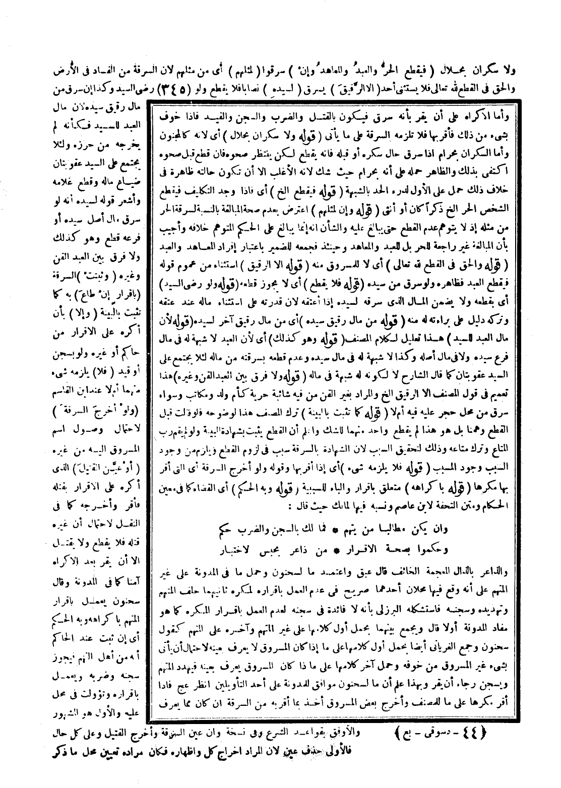 (وَثَبَتَتْ) السَّرِقَةُ (بِإِقْرَارٍ) (إنْ طَاعَ) بِهِ كَمَا تَثْبُتُ بِالْبَيِّنَةِ (وَإِلَّا) بِأَنْ أُكْرِهَ عَلَى الْإِقْرَارِ مِنْ حَاكِمٍ أَوْ غَيْرِهِ وَلَوْ بِسَجْنٍ أَوْ قَيْدٍ (فَلَا) يَلْزَمُهُ شَيْءٌ مِنْهُمَا أَمْ لَا عِنْدَ ابْنِ الْقَاسِمِ (وَلَوْ أَخْرَجَ السَّرِقَةَ) لِاحْتِمَالِ وُصُولِ اسْمِ الْمَسْرُوقِ إلَيْهِ مِنْ غَيْرِهِ (أَوْ عَيَّنَ الْقَتِيلَ) الَّذِي أُكْرِهَ عَلَى الْإِقْرَارِ بِقَتْلِهِ فَأَقَرَّ وَأَخْرَجَهُ كَمَا فِي النَّقْلِ لِاحْتِمَالِ أَنَّ غَيْرَهُ قَتَلَهُ فَلَا يَقَعُ وَلَا يُقْتَلُ إلَّا أَنْ يُقِرَّ بَعْدَ الْإِكْرَاهِ آمِنًا كَمَا فِي الْمُدَوَّنَةِ وَقَالَ سَحْنُونٌ يُعْمَلُ بِإِقْرَارِ الْمُتَّهَمِ بِإِكْرَاهِهِ وَبِهِ الْحُكْمُ أَيْ إنْ ثَبَتَ عِنْدَ الْحَاكِمِ أَنَّهُ مِنْ أَهْلِ التُّهَمِ فَيَجُوزُ سَجْنُهُ وَضَرْبُهُ وَيُعْمَلُ بِإِقْرَارِهِ وَتُؤُوِّلَتْ فِي مَحَلٍّ عَلَيْهِ وَالْأَوَّلُ هُوَ الْمَشْهُورُ وَالْأَوْفَقُ بِقَوَاعِد الشَّرْعِ وَفِي نُسْخَةٍ، وَإِنْ عَيَّنَ السَّرِقَةَ وَأَخْرَجَ الْقَتِيلَ وَعَلَى كُلِّ حَالٍ فَالْأَوْلَى حَذْفُ عَيْنٍ؛ لِأَنَّ الْمُرَادَ إخْرَاجُ كُلٍّ وَإِظْهَارُهُ فَكَانَ مُرَادُهُ تَعْيِينَ مَحَلِّ مَا ذَكَرَ