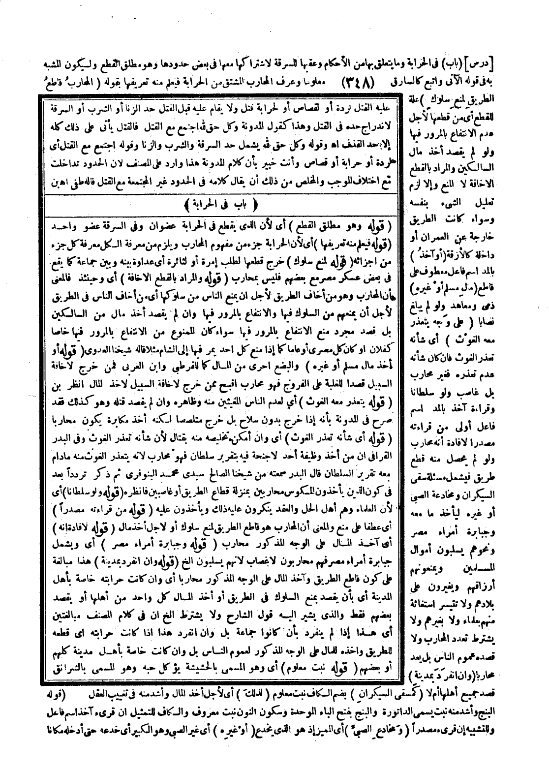 [دَرْسٌ] (بَابٌ) فِي الْحِرَابَةِ وَمَا يَتَعَلَّقُ بِهَا مِنْ الْأَحْكَامِ وَعَقِبُهَا لِلسَّرِقَةِ لِاشْتِرَاكِهَا مَعَهَا فِي بَعْضِ حُدُودِهَا وَهُوَ مُطْلَقُ الْقَطْعِ وَلِيَكُونَ الْمُشَبَّهُ بِهِ فِي قَوْلِهِ الْآتِي وَاتُّبِعَ كَالسَّارِقِ مَعْلُومًا وَعَرَّفَ الْمُحَارِبَ الْمُشْتَقَّ مِنْ الْحِرَابَةِ فَيُعْلَمُ مِنْهُ تَعْرِيفُهَا بِقَوْلِهِ (الْمُحَارِبُ قَاطِعُ الطَّرِيقِ لِمَنْعِ سُلُوكٍ) عِلَّةٌ لِلْقَطْعِ أَيْ مِنْ قَطْعِهَا لِأَجْلِ عَدَمِ الِانْتِفَاعِ بِالْمُرُورِ فِيهَا وَلَوْ لَمْ يَقْصِدْ أَخْذَ مَالِ السَّالِكِينَ وَالْمُرَادُ بِالْقَطْعِ الْإِخَافَةُ لَا الْمَنْعُ وَإِلَّا لَزِمَ تَعْلِيلُ الشَّيْءِ بِنَفْسِهِ وَسَوَاءٌ كَانَتْ الطَّرِيقُ خَارِجَةً عَنْ الْعُمْرَانِ أَوْ دَاخِلَةً كَالْأَزِقَّةِ (أَوْ آخِذٌ) بِالْمَدِّ اسْمُ فَاعِلٍ مَعْطُوفٌ عَلَى قَاطِعُ (مَالَ مُسْلِمٍ أَوْ غَيْرِهِ) ذِمِّيٍّ وَمُعَاهِدٍ وَلَوْ لَمْ يَبْلُغْ نِصَابًا (عَلَى وَجْهٍ يَتَعَذَّرُ مَعَهُ الْغَوْثُ) أَيْ شَأْنُهُ تَعَذُّرُ الْغَوْثِ، فَإِنْ كَانَ شَأْنُهُ عَدَمَ تَعَذُّرِهِ فَغَيْرُ مُحَارِبٍ بَلْ غَاصِبٌ وَلَوْ سُلْطَانًا وَقِرَاءَةُ آخِذٍ بِالْمَدِّ اسْمُ فَاعِلٍ أَوْلَى مِنْ قِرَاءَتِهِ مَصْدَرًا لِإِفَادَةِ أَنَّهُ مُحَارِبٌ وَلَوْ لَمْ يَحْصُلْ مِنْهُ قَطْعُ طَرِيقٍ فَيَشْمَلُ مَسْأَلَةَ سَقْيِ السُّيْكَرَانِ وَمُخَادَعَةِ الصَّبِيِّ أَوْ غَيْرِهِ لِيَأْخُذَ مَا مَعَهُ، وَجَبَابِرَةُ أُمَرَاءِ مِصْرَ وَنَحْوُهُمْ يَسْلُبُونَ أَمْوَالَ الْمُسْلِمِينَ وَيَمْنَعُونَهُمْ أَرْزَاقَهُمْ وَيُغِيرُونَ عَلَى بِلَادِهِمْ وَلَا تَتَيَسَّرُ اسْتِغَاثَةٌ مِنْهُمْ بِعُلَمَاءَ وَلَا بِغَيْرِهِمْ، وَلَا يُشْتَرَطُ تَعَدُّدُ الْمُحَارِبِ وَلَا قَصْدُهُ عُمُومَ النَّاسِ بَلْ يُعَدُّ مُحَارِبًا (وَإِنْ انْفَرَدَ بِمَدِينَةٍ) قَصَدَ جَمِيعَ أَهْلِهَا أَمْ لَا (كَمُسْقِي السُّيْكَرَانِ) بِضَمِّ الْكَافِ نَبْتٌ مَعْلُومٌ (لِذَلِكَ) أَيْ لِأَجْلِ أَخْذِ الْمَالِ وَأَشَدُّ مِنْهُ فِي تَغْيِيبِ الْعَقْلِ الْبَنْجُ وَأَشَدُّ مِنْهُ نَبْتٌ يُسَمَّى الدَّاتُورَةَ وَالْبَنْجُ بِفَتْحِ الْبَاءِ الْمُوَحَّدَةِ وَسُكُونِ النُّونِ نَبْتٌ مَعْرُوفٌ وَالْكَافُ لِلتَّمْثِيلِ إنْ قُرِئَ آخِذُ اسْمَ الْفَاعِلِ وَلِلتَّشْبِيهِ إنْ قُرِئَ مَصْدَرًا (وَمُخَادِعِ الصَّبِيِّ) أَيْ الْمُمَيِّزِ إذْ هُوَ الَّذِي يُخْدَعُ (أَوْ غَيْرِهِ) أَيْ غَيْرِ الصَّبِيِّ وَهُوَ الْكَبِيرُ أَيْ خَدَعَهُ حَتَّى أَدْخَلَهُ مَكَانًا