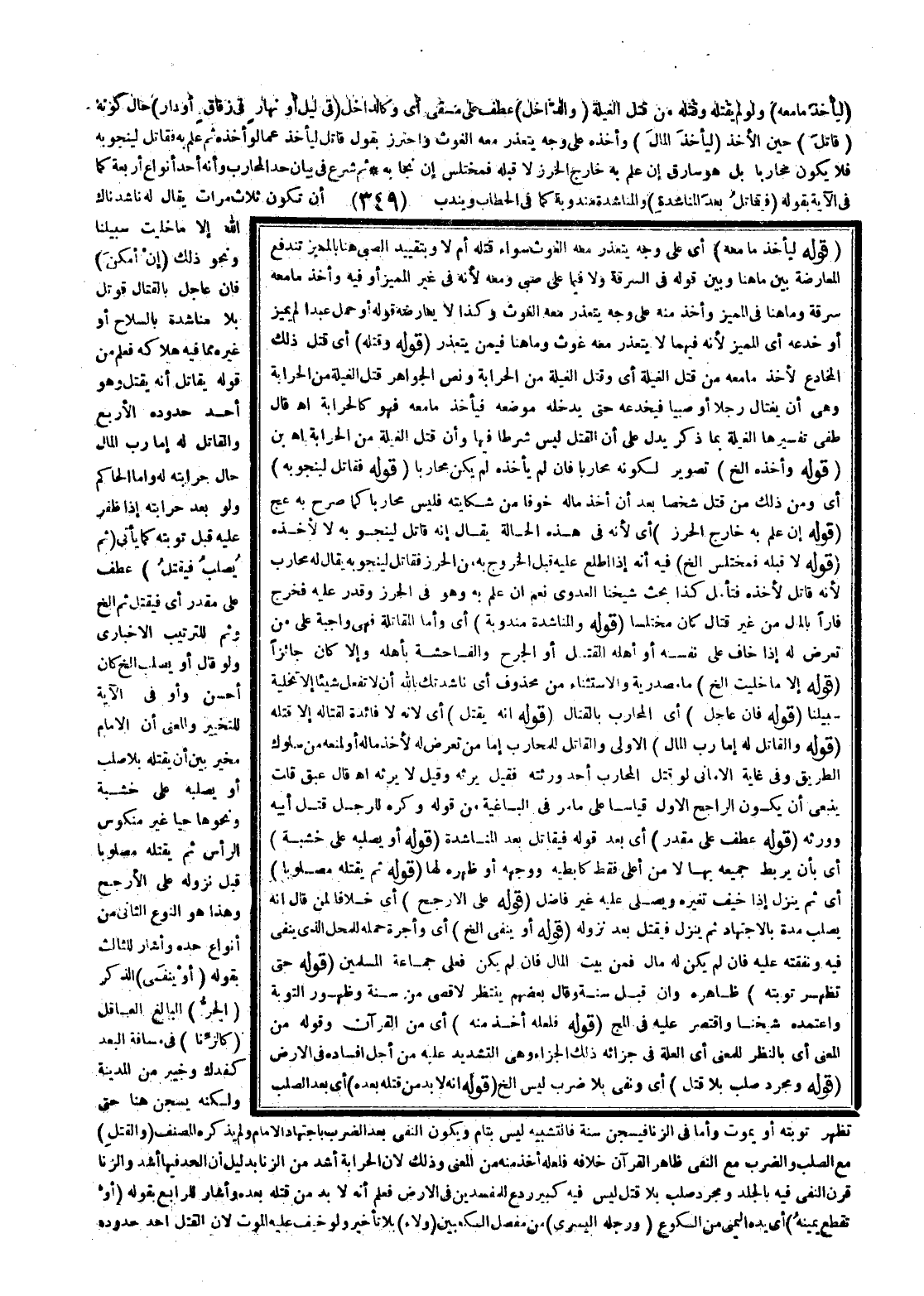 وَأَمَّا فِي الزِّنَا فَيُسْجَنُ سَنَةً فَالتَّشْبِيهُ لَيْسَ بِتَامٍّ وَيَكُونُ النَّفْيُ بَعْدَ الضَّرْبِ بِاجْتِهَادِ الْإِمَامِ وَلَمْ يَذْكُرْهُ الْمُصَنِّفُ (وَالْقَتْلُ) مَعَ الصَّلْبِ وَالضَّرْبُ مَعَ النَّفْيِ، ظَاهِرُ الْقُرْآنِ خِلَافُهُ فَلَعَلَّهُ أُخِذَ مِنْهُ مِنْ الْمَعْنَى وَذَلِكَ لِأَنَّ الْحِرَابَةَ أَشَدُّ مِنْ الزِّنَا بِدَلِيلِ أَنَّ الْحَدَّ فِيهَا أَشَدُّ وَالزِّنَا قَرَنَ النَّفْيَ فِيهِ بِالْجَلْدِ وَمُجَرَّدُ صَلْبٍ بِلَا قَتْلٍ لَيْسَ فِيهِ كَبِيرُ رَدْعٍ لِلْمُفْسِدِينَ فِي الْأَرْضِ فَعُلِمَ أَنَّهُ لَا بُدَّ مِنْ قَتْلِهِ بَعْدَهُ وَأَشَارَ لِلرَّابِعِ بِقَوْلِهِ (أَوْ) (تُقْطَعُ يَمِينُهُ) أَيْ يَدُهُ الْيُمْنَى مِنْ الْكُوعِ (وَرِجْلُهُ الْيُسْرَى) مِنْ مَفْصِلِ الْكَعْبَيْنِ (وَلَاءً) بِلَا تَأْخِيرٍ وَلَوْ خِيفَ عَلَيْهِ الْمَوْتُ لِأَنَّ الْقَتْلَ أَحَدُ حُدُودِهِ