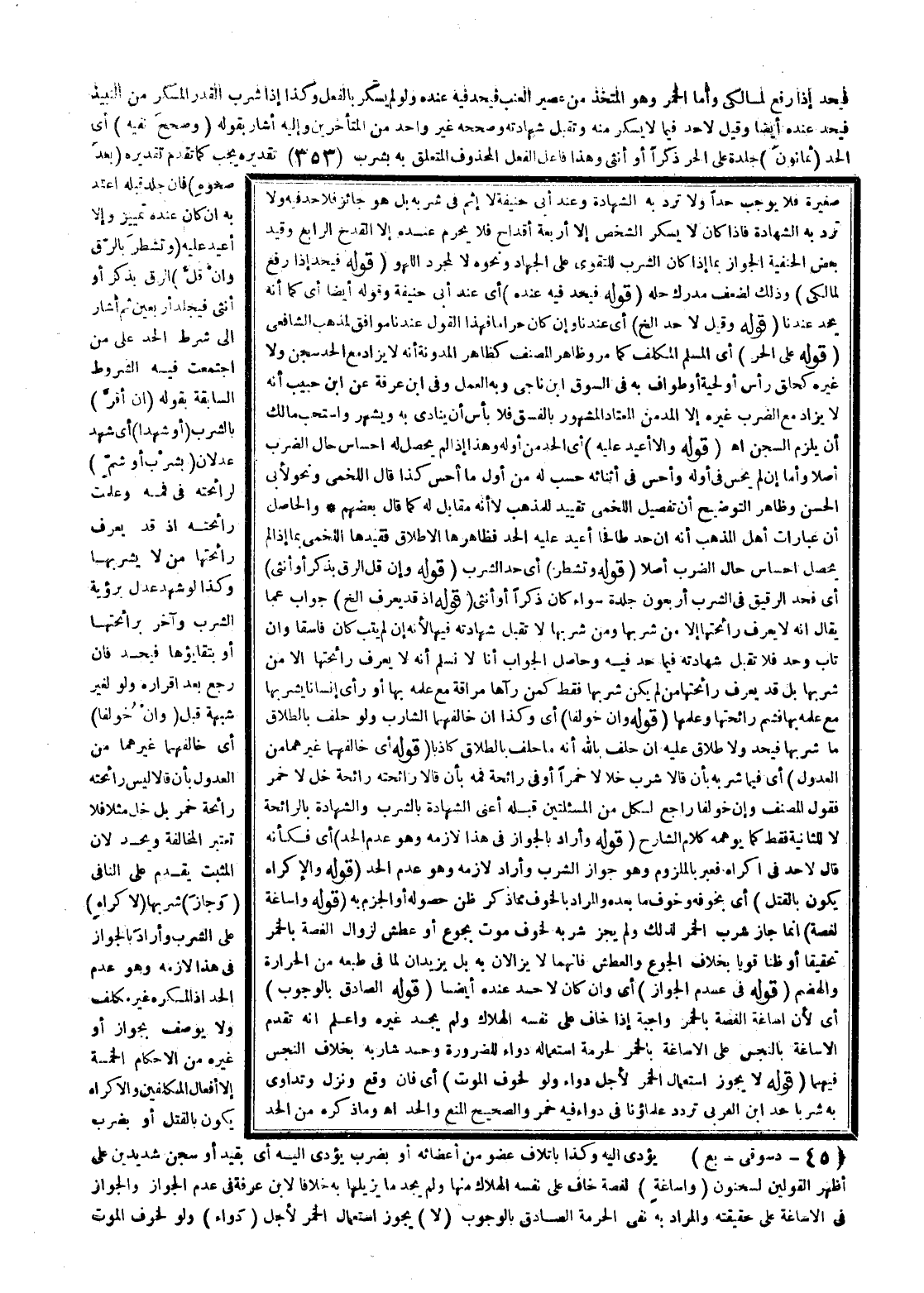ـــــــــــــــــــــــــــــQصَغِيرَةٌ فَلَا يُوجِبُ حَدًّا وَلَا تُرَدُّ بِهِ الشَّهَادَةُ وَعِنْدَ أَبِي حَنِيفَةَ لَا إثْمَ فِي شُرْبِهِ بَلْ هُوَ جَائِزٌ فَلَا حَدَّ فِيهِ وَلَا تُرَدُّ بِهِ الشَّهَادَةُ، فَإِذَا كَانَ لَا يُسْكِرُ الشَّخْصَ إلَّا أَرْبَعَةُ أَقْدَاحٍ فَلَا يَحْرُمُ عِنْدَهُ إلَّا الْقَدَحُ الرَّابِعُ وَقَيَّدَ بَعْضُ الْحَنَفِيَّةِ الْجَوَازَ بِمَا إذَا كَانَ الشُّرْبُ لِلتَّقَوِّي عَلَى الْجِهَادِ وَنَحْوِهِ لَا لِمُجَرَّدِ اللَّهْوِ (قَوْلُهُ: فَيُحَدُّ إذَا رُفِعَ لِمَالِكِيٍّ) وَذَلِكَ لِضَعْفِ مُدْرِكِ حِلِّهِ (قَوْلُهُ فَيُحَدُّ فِيهِ عِنْدَهُ) أَيْ عِنْدَ أَبِي حَنِيفَةَ وَقَوْلُهُ أَيْضًا أَيْ كَمَا أَنَّهُ يُحَدُّ عِنْدَنَا (قَوْلُهُ: وَقِيلَ لَا حَدَّ إلَخْ) أَيْ عِنْدَنَا وَإِنْ كَانَ حَرَامًا فَهَذَا الْقَوْلُ عِنْدَنَا مُوَافِقٌ لِمَذْهَبِ الشَّافِعِيِّ (قَوْلُهُ: عَلَى الْحُرِّ) أَيْ الْمُسْلِمِ الْمُكَلَّفِ كَمَا مَرَّ وَظَاهِرُ الْمُصَنِّفِ كَظَاهِرِ الْمُدَوَّنَةِ أَنَّهُ لَا يُزَادُ مَعَ الْحَدِّ سِجْنٌ وَلَا غَيْرُهُ كَحَلْقِ رَأْسٍ أَوْ لِحْيَةٍ أَوْ طَوَافٍ بِهِ فِي السُّوقِ ابْنُ نَاجِيٍّ وَبِهِ الْعَمَلُ وَفِي ابْنِ عَرَفَةَ عَنْ ابْنِ حَبِيبٍ أَنَّهُ لَا يُزَادُ مَعَ الضَّرْبِ غَيْرُهُ إلَّا الْمُدْمِنُ الْمُعْتَادُ الْمَشْهُورُ بِالْفِسْقِ فَلَا بَأْسَ أَنْ يُنَادَى بِهِ وَيُشْهَرَ وَاسْتَحَبَّ مَالِكٌ أَنْ يُلْزَمَ السِّجْنَ اهـ (قَوْلُهُ: وَإِلَّا أُعِيدَ عَلَيْهِ) أَيْ الْحَدُّ مِنْ أَوَّلِهِ، وَهَذَا إذَا لَمْ يَحْصُلْ لَهُ إحْسَاسٌ حَالَ الضَّرْبِ أَصْلًا، وَأَمَّا إنْ لَمْ يَحُسَّ فِي أَوَّلِهِ وَأَحَسَّ فِي أَثْنَائِهِ حُسِبَ لَهُ مِنْ أَوَّلِ مَا أَحَسَّ كَذَا قَالَ اللَّخْمِيُّ وَنَحْوُهُ لِأَبِي الْحَسَنِ وَظَاهِرُ التَّوْضِيحِ أَنَّ تَفْصِيلَ اللَّخْمِيِّ تَقْيِيدٌ لِلْمَذْهَبِ لَا أَنَّهُ مُقَابِلٌ لَهُ كَمَا قَالَ بَعْضُهُمْ، وَالْحَاصِلُ أَنَّ عِبَارَاتِ أَهْلِ الْمَذْهَبِ أَنَّهُ إنْ حُدَّ طَافِحًا أُعِيدَ عَلَيْهِ الْحَدُّ فَظَاهِرُهَا الْإِطْلَاقُ فَقَيَّدَهَا اللَّخْمِيُّ بِمَا إذَا لَمْ يَحْصُلْ إحْسَاسٌ حَالَ الضَّرْبِ أَصْلًا (قَوْلُهُ وَتَشْطُرُ) أَيْ حَدَّ الشُّرْبِ (قَوْلُهُ: وَإِنْ قَلَّ الرِّقُّ بِذَكَرٍ أَوْ أُنْثَى) أَيْ فَحَدُّ الرَّقِيقِ فِي الشُّرْبِ أَرْبَعُونَ جَلْدَةً سَوَاءٌ كَانَ ذَكَرًا أَوْ أُنْثَى